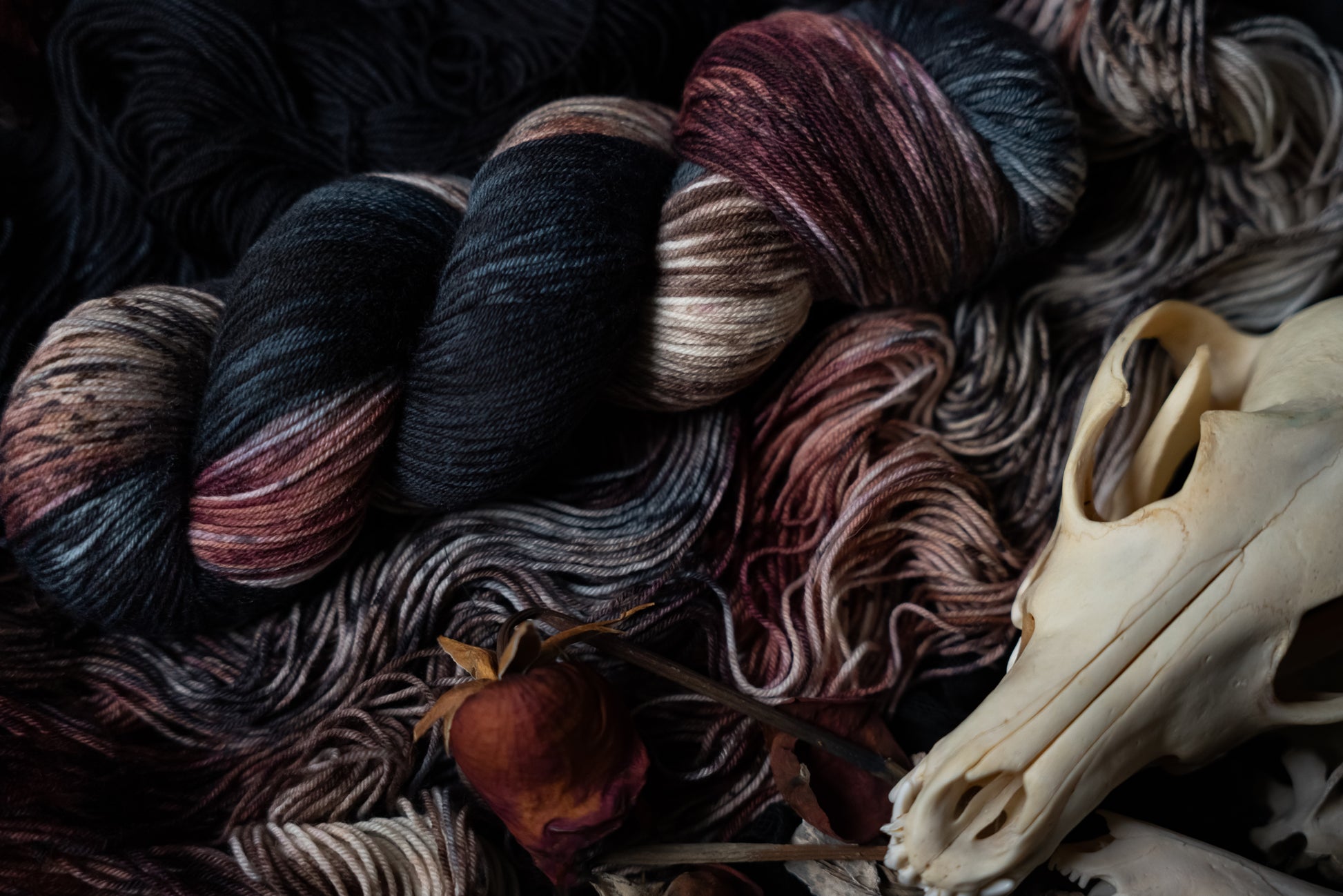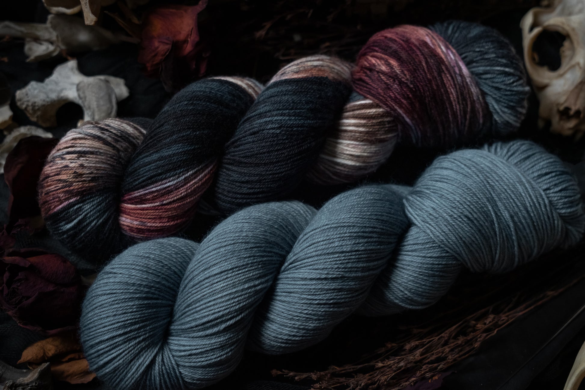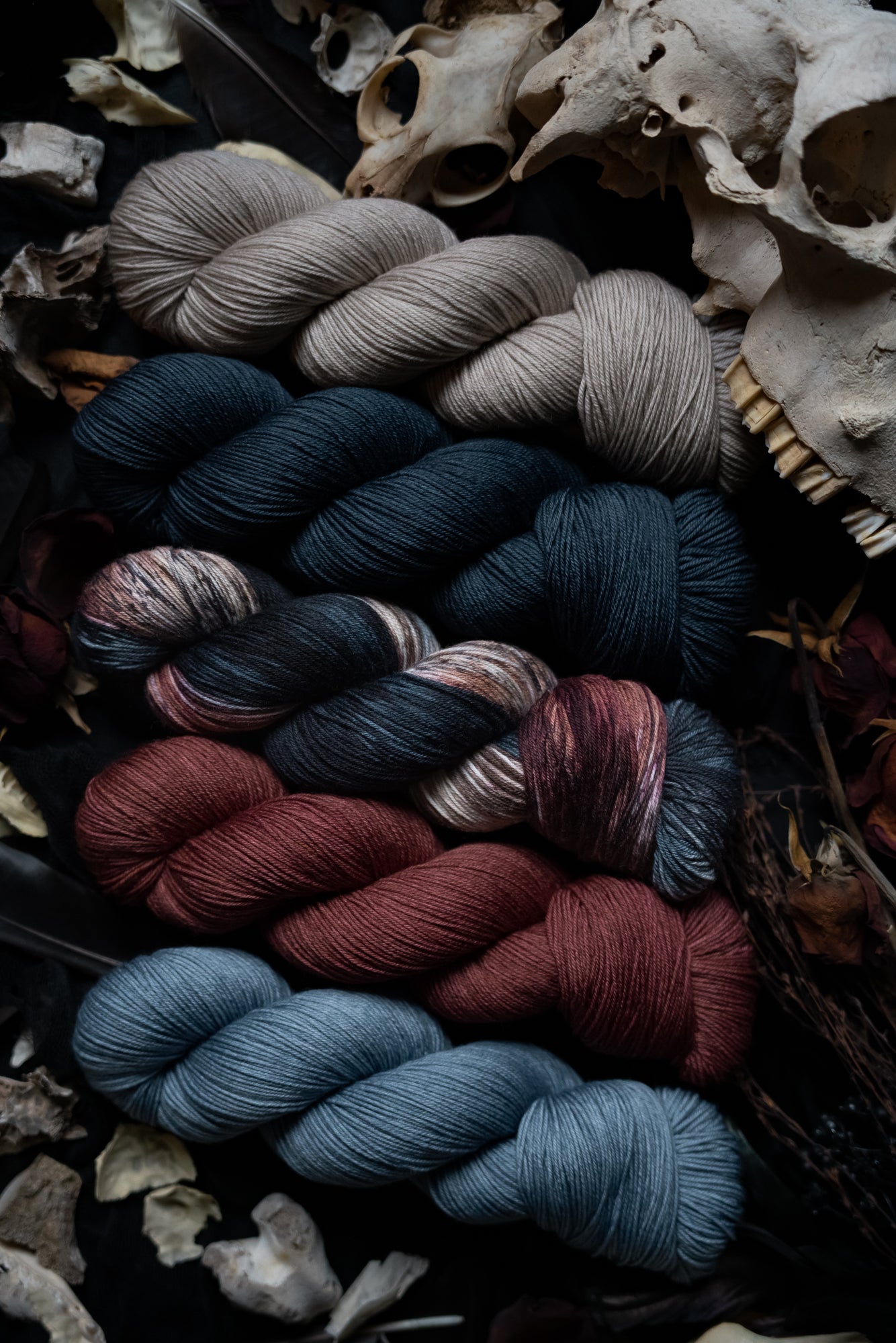 Decay is the multi colored variegated in the Decay Collection. This collection was designed for the Frost Moon of November 2025. All skeins will be dyed with moon water from the November Frost Moon. The other four colorways in this collection shown in the images are Ossuary (bone), Ash (lighter grey blue), Remnant (darker grey blue) and Elegy (rust).