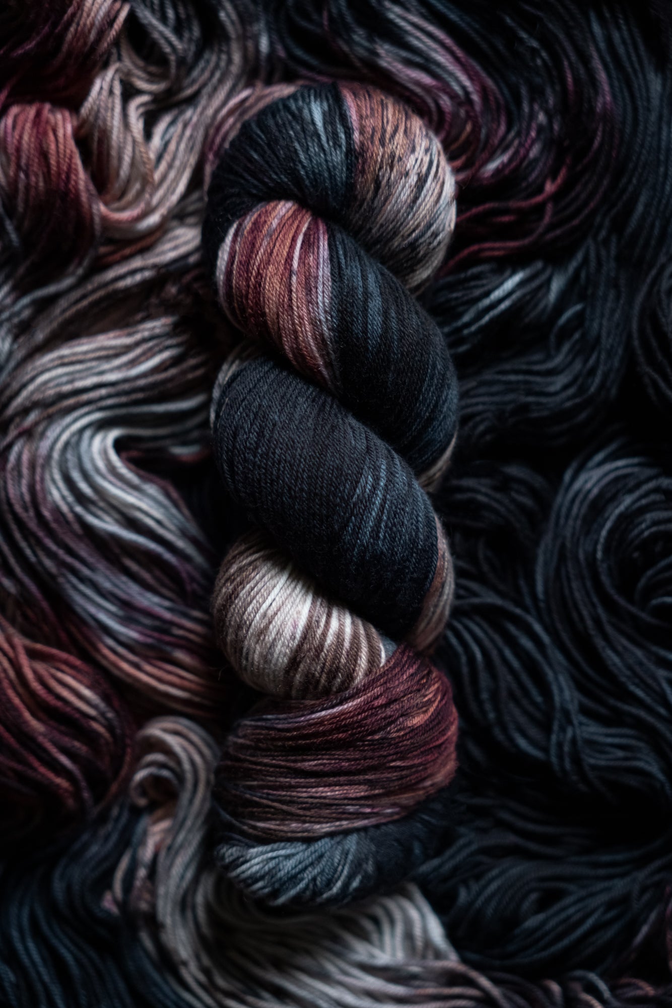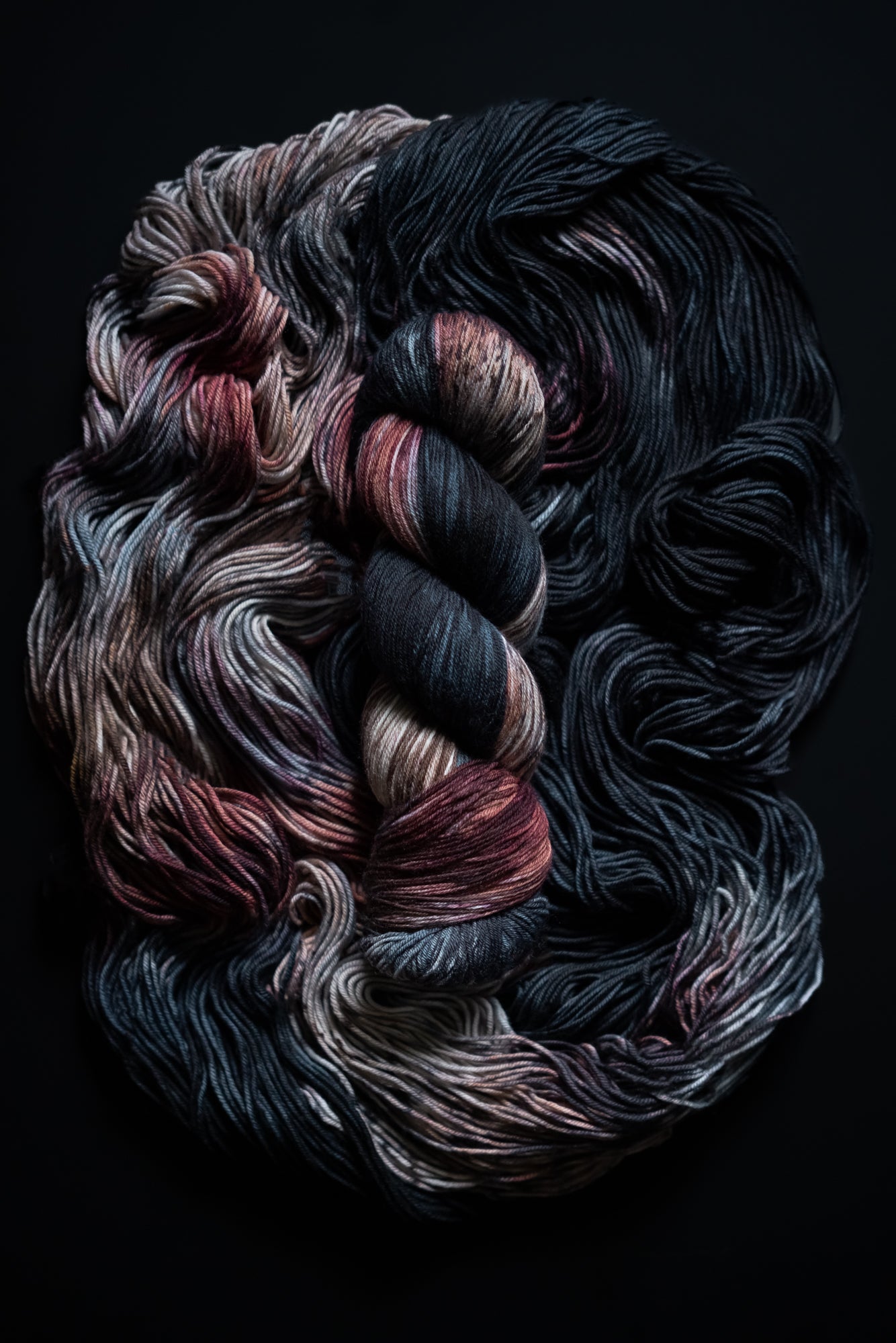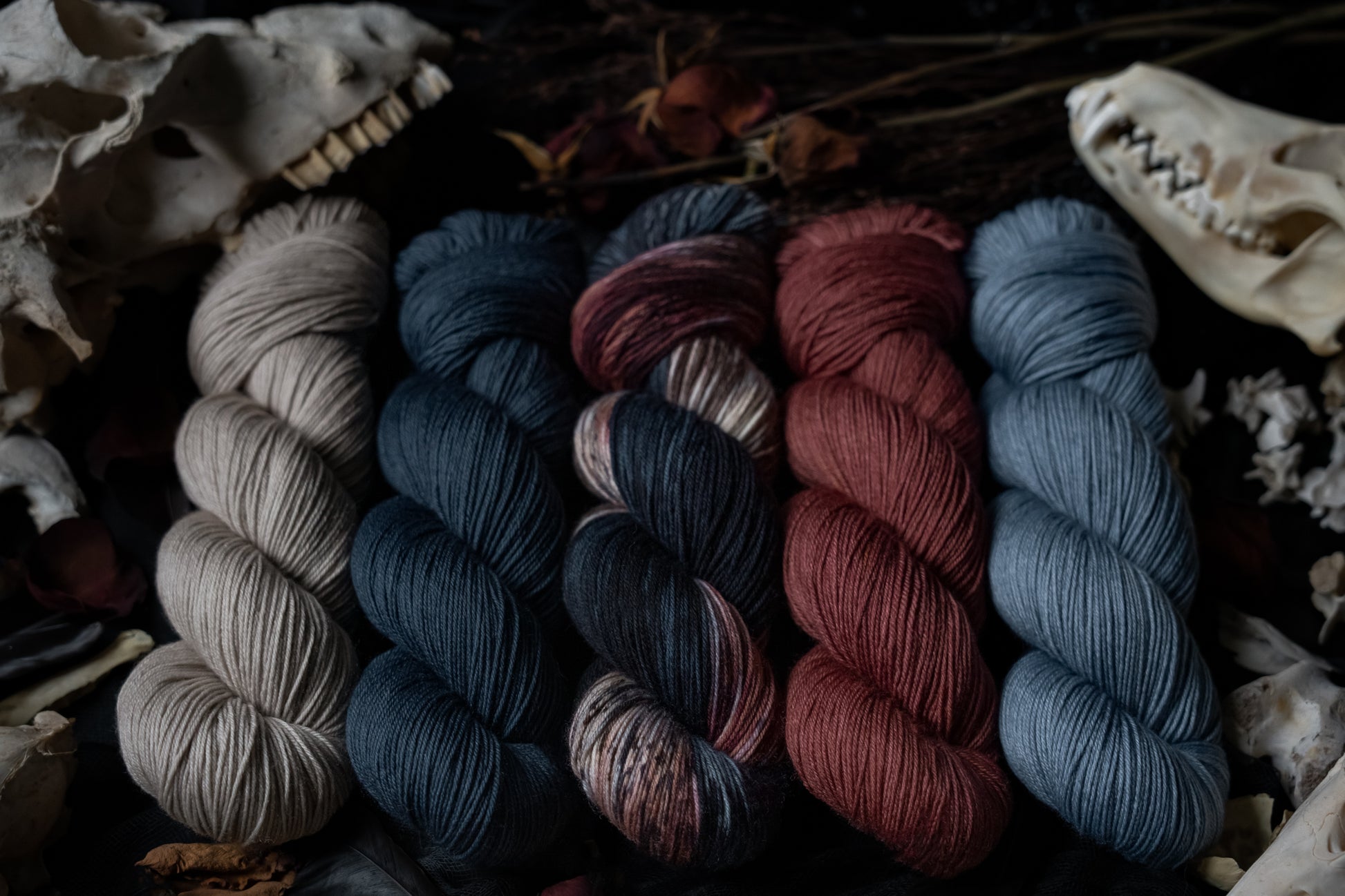 Decay is the multi colored variegated in the Decay Collection. This collection was designed for the Frost Moon of November 2025. All skeins will be dyed with moon water from the November Frost Moon. The other four colorways in this collection shown in the images are Ossuary (bone), Ash (lighter grey blue), Remnant (darker grey blue) and Elegy (rust).