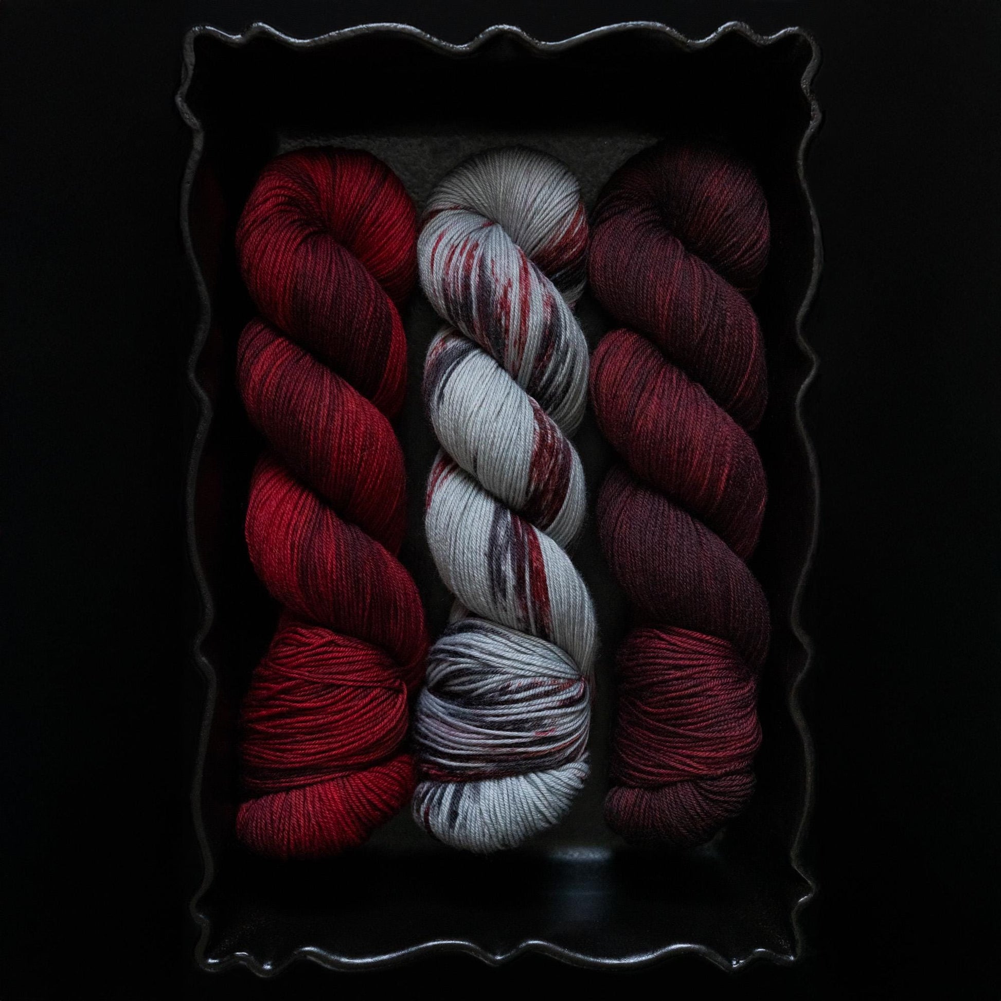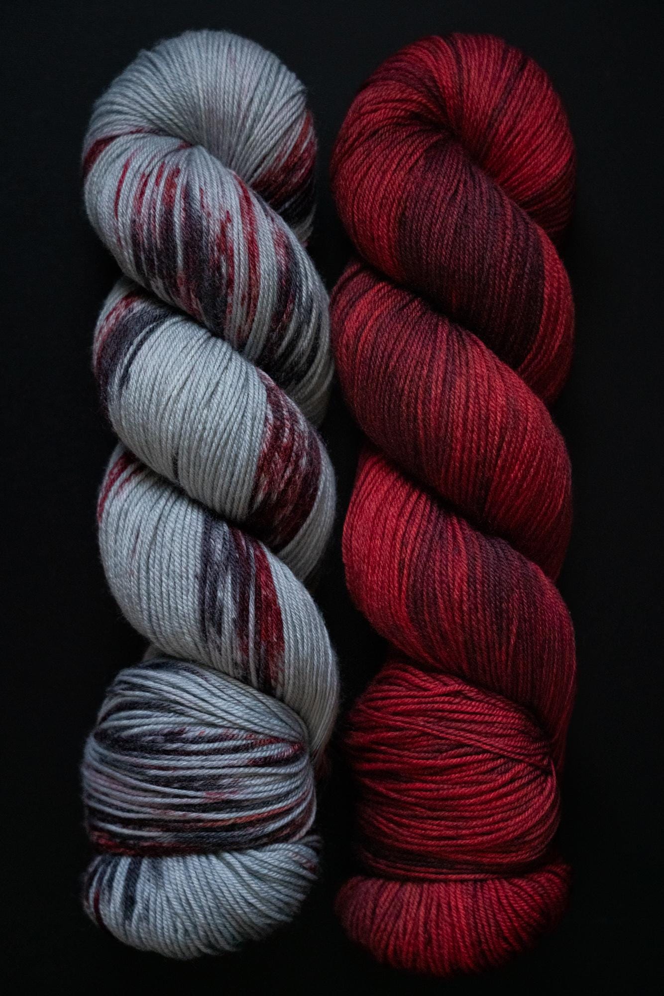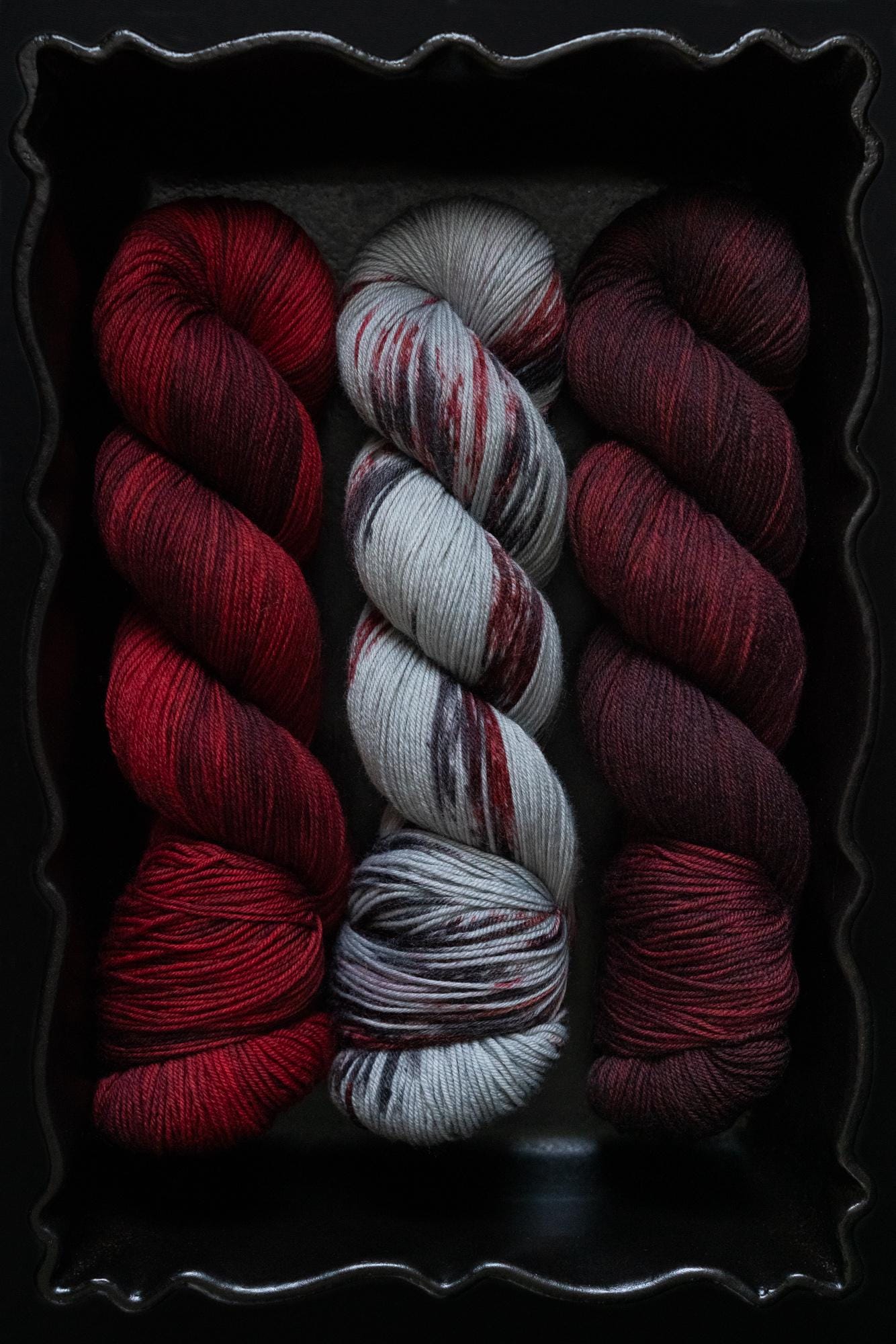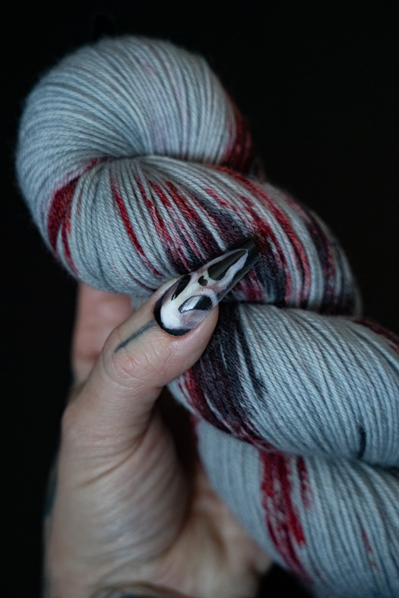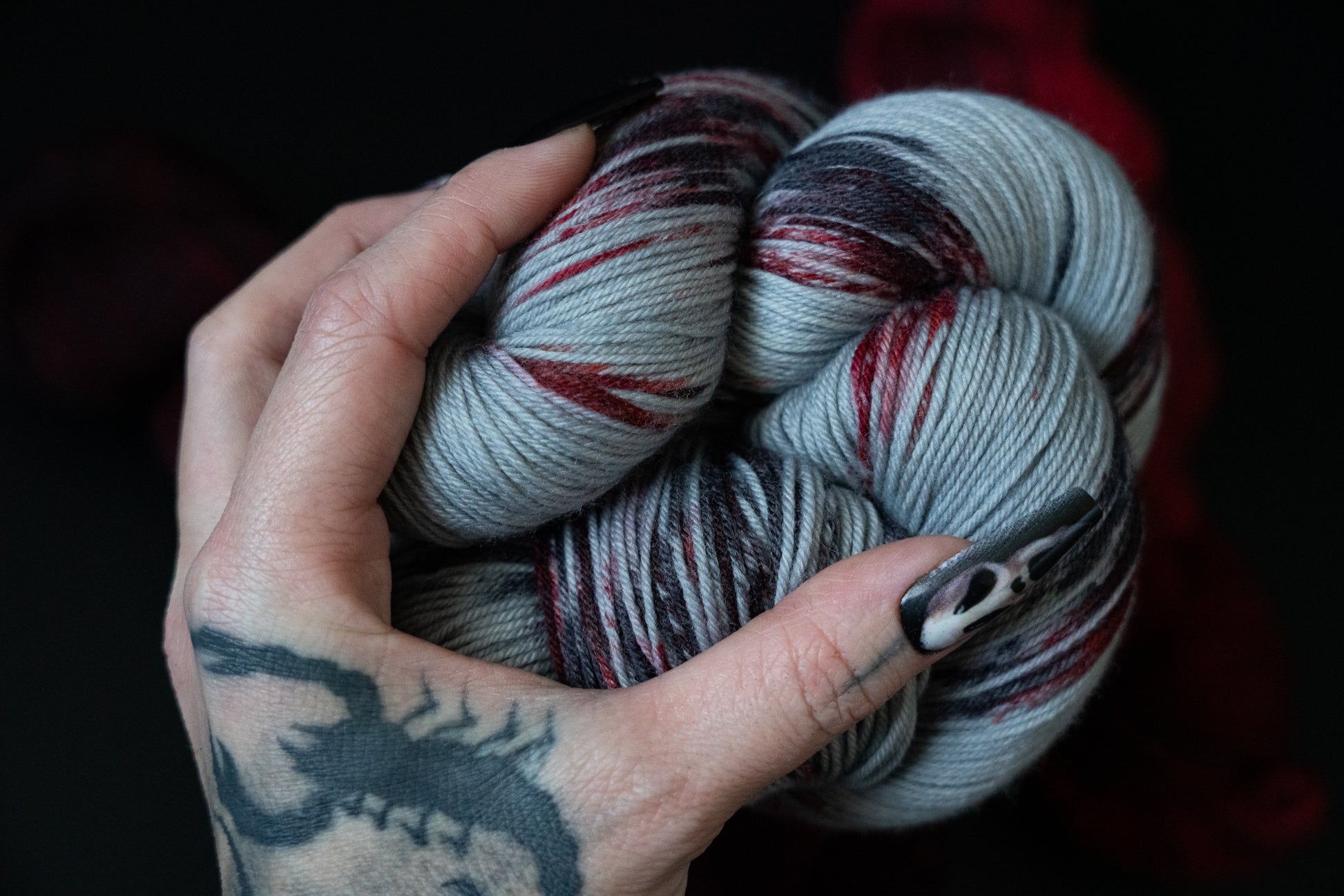 Flesh Wound is the grey variegated of the 3 Slasher colorways. The other two colorways shown in these photos are Bloodbath (bright red) and Bleeding Ground (darker red).