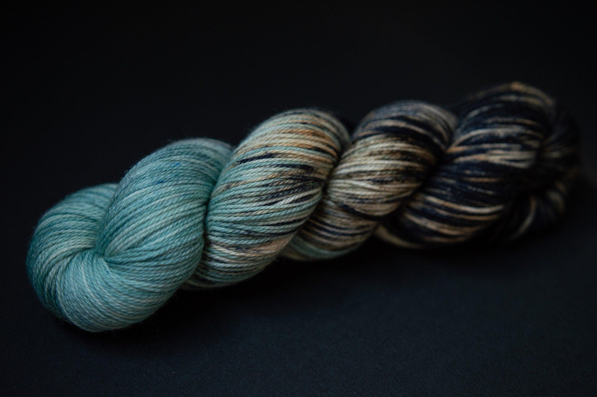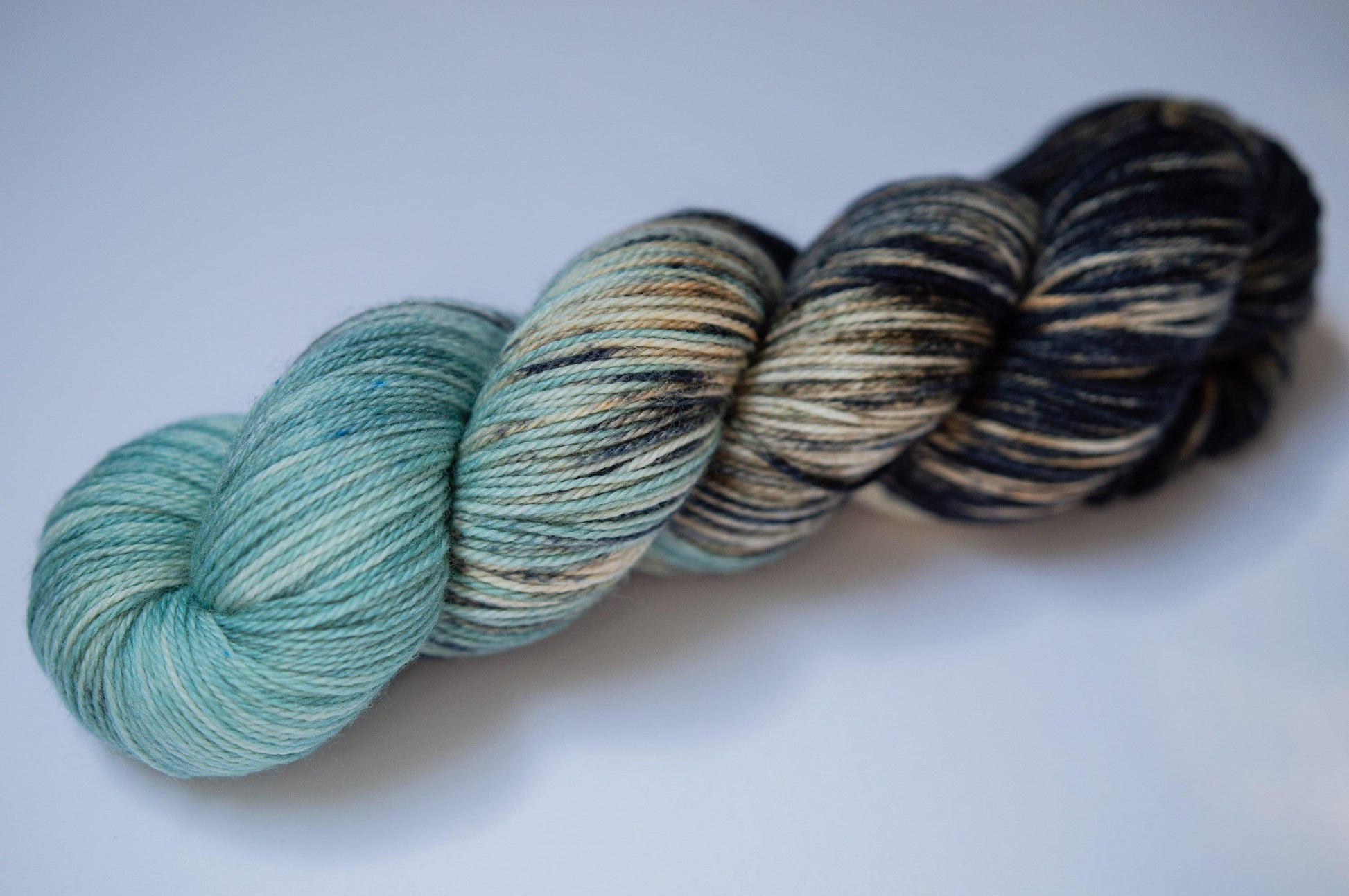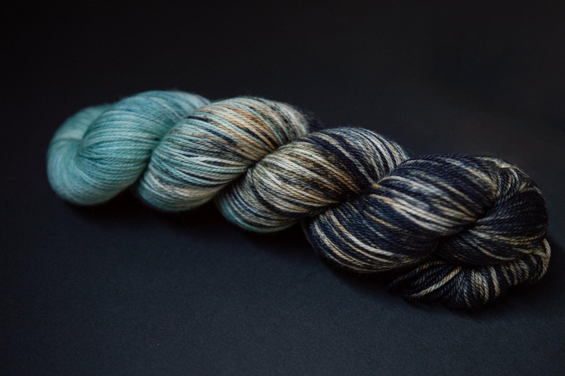 The color is an icy blue blended to black with peeks of navy and a sandy beige. Please note that depending on your device or monitor settings colors may appear slightly different than they are in person. Color also varies slightly by base, as the dye absorbs differently on different fiber content.