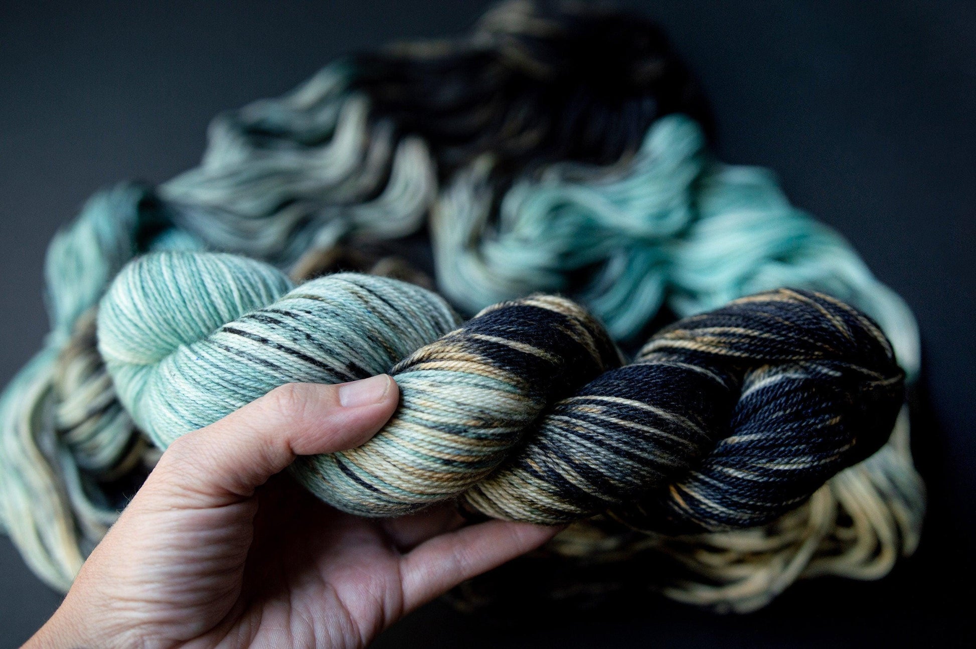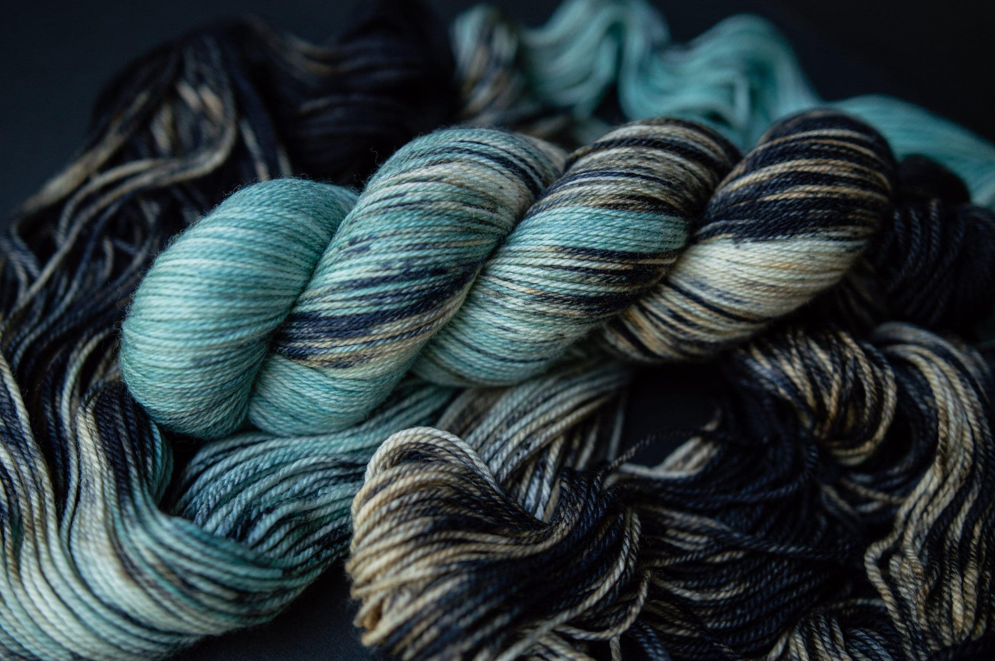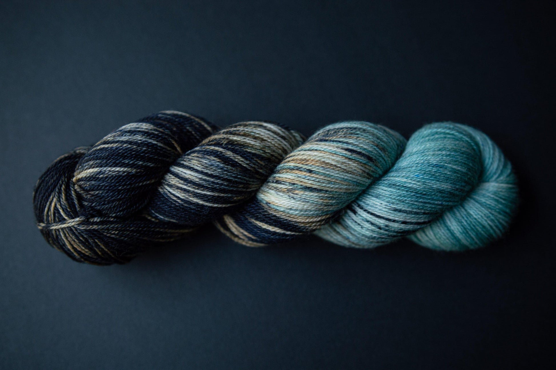 The color is an icy blue blended to black with peeks of navy and a sandy beige. Please note that depending on your device or monitor settings colors may appear slightly different than they are in person. Color also varies slightly by base, as the dye absorbs differently on different fiber content.