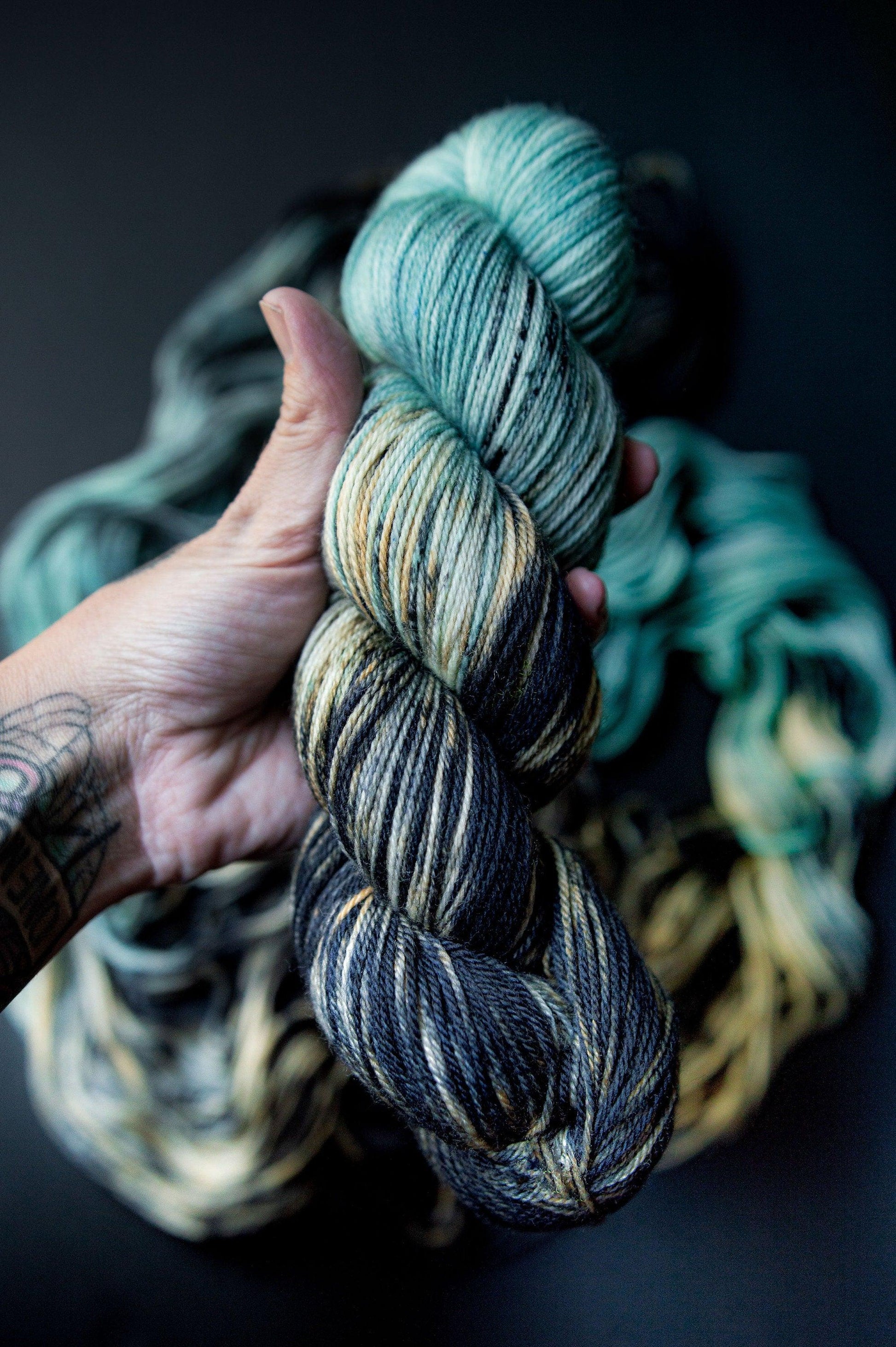 All skeins of Crow and Crescent Yarn are hand dyed with love in Shoreline, WA using high quality professional acid dyes in small batches. Each skein is unique, and dye lots vary.