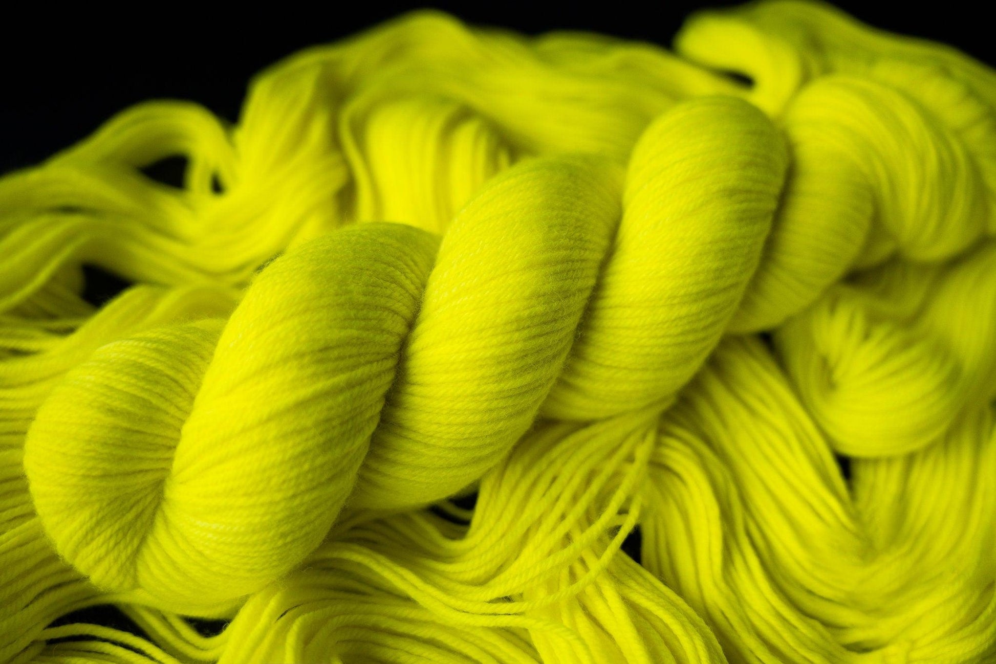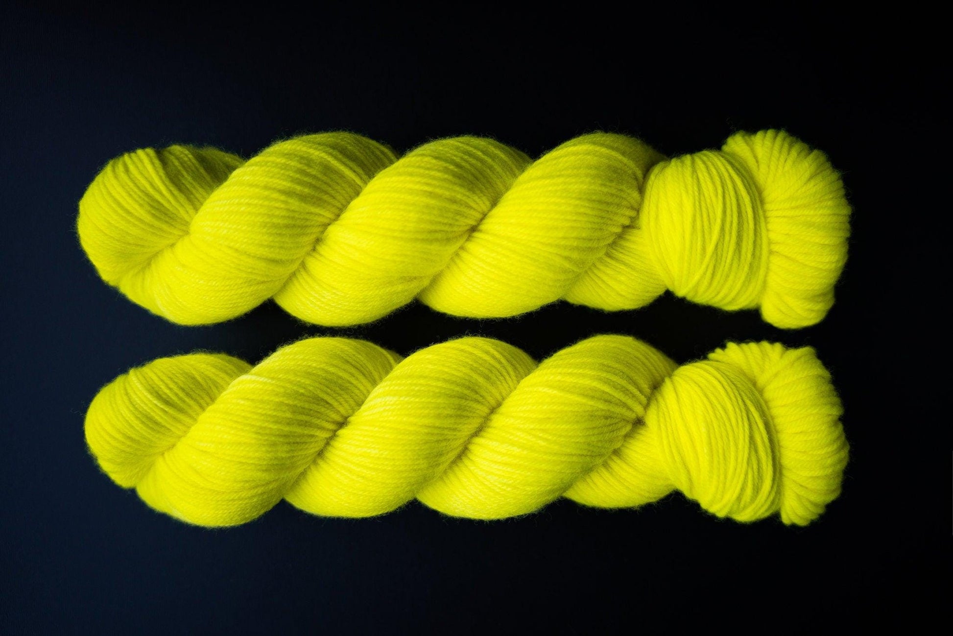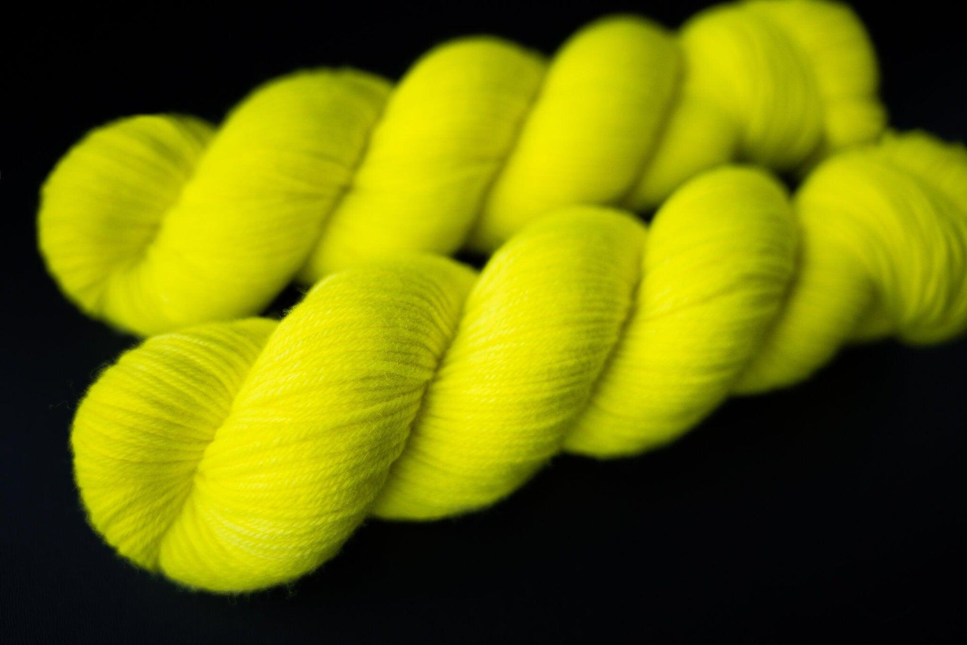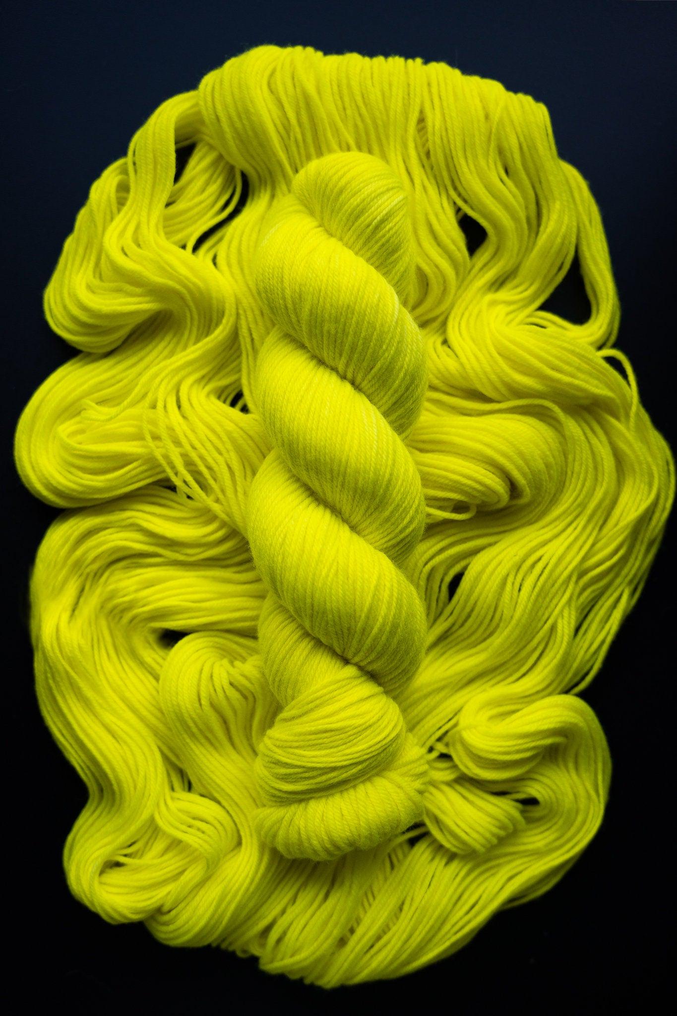 The color is a solid neon yellow with minor tonal variations. Please note that depending on your device or monitor settings colors may appear slightly different than they are in person. Color also varies slightly by base, as the dye absorbs differently on different fiber content.