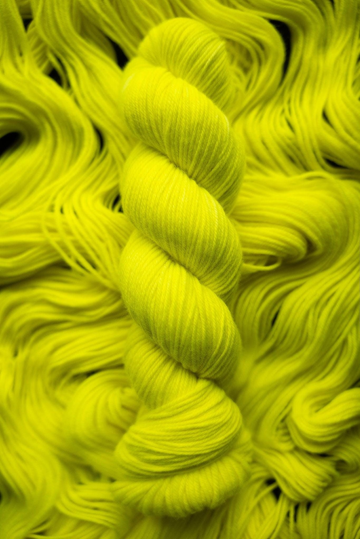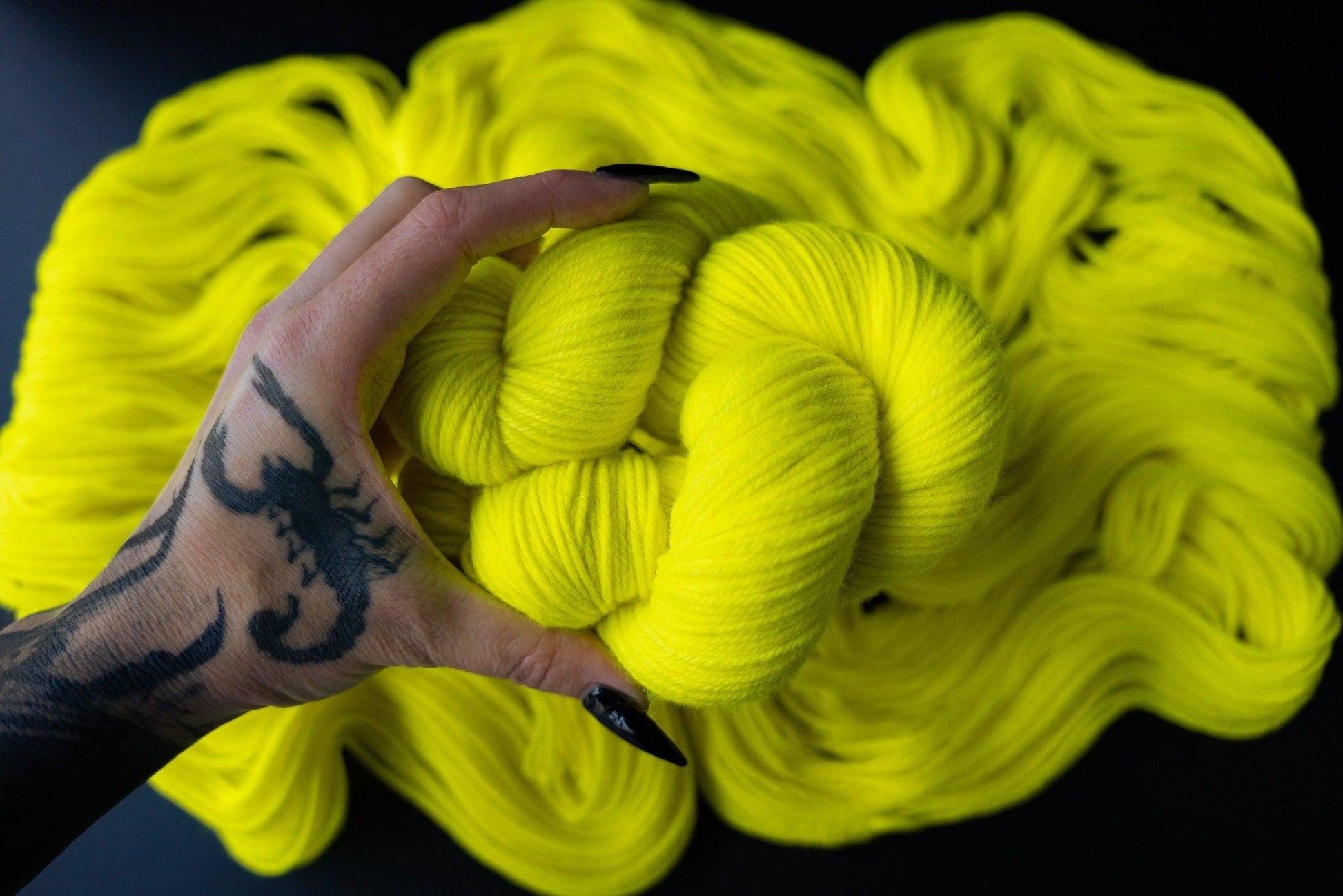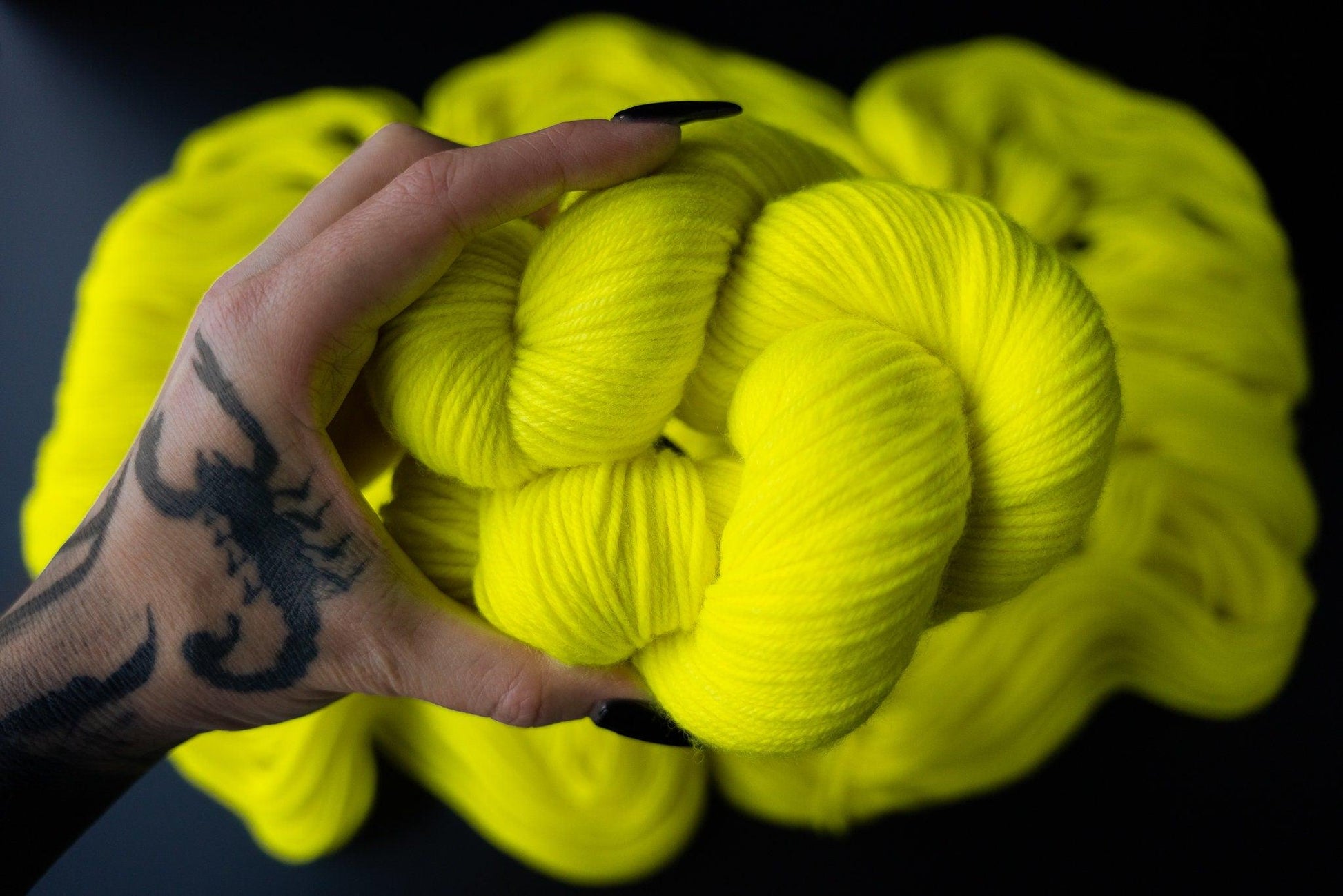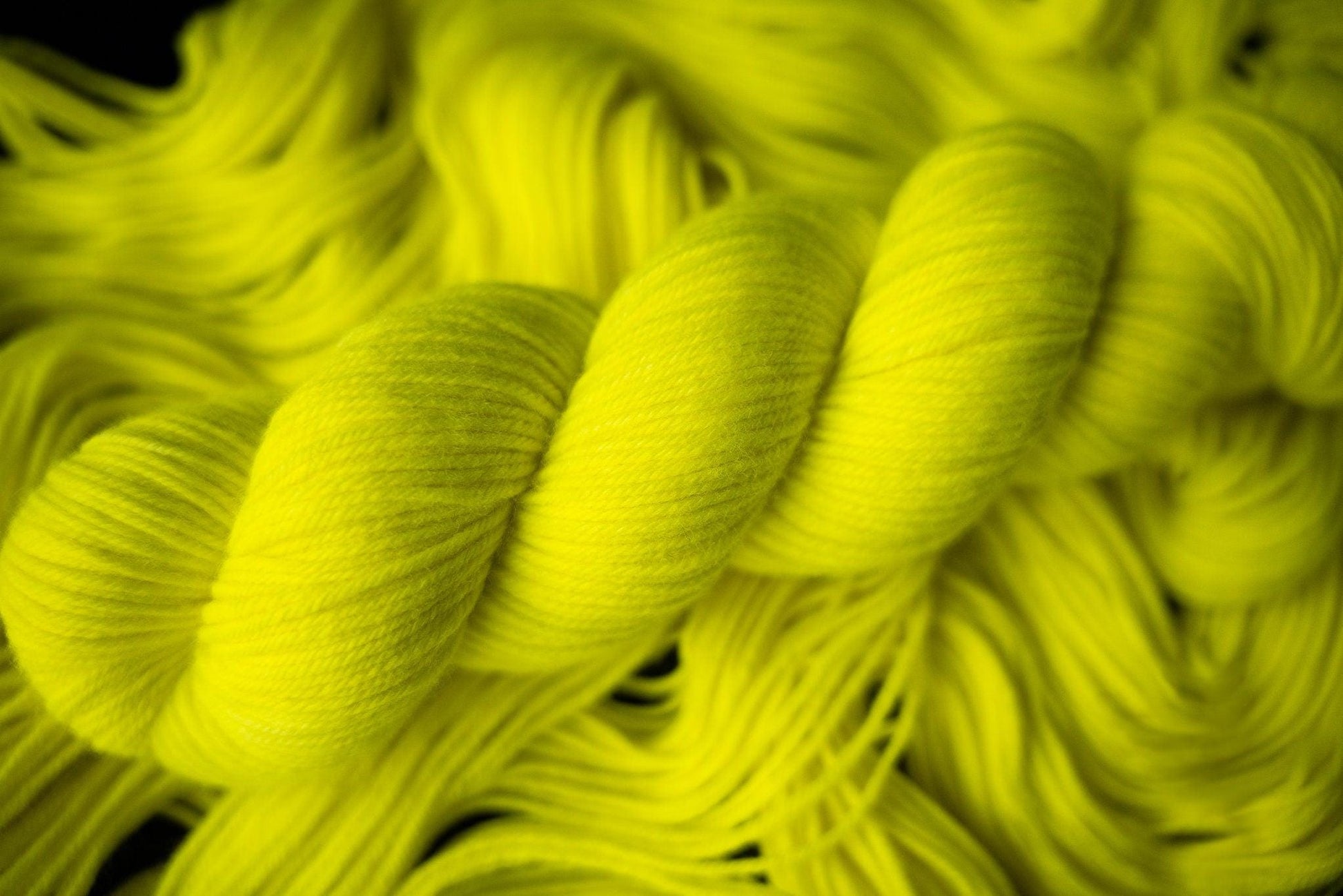 The color is a solid neon yellow with minor tonal variations. Please note that depending on your device or monitor settings colors may appear slightly different than they are in person. Color also varies slightly by base, as the dye absorbs differently on different fiber content.