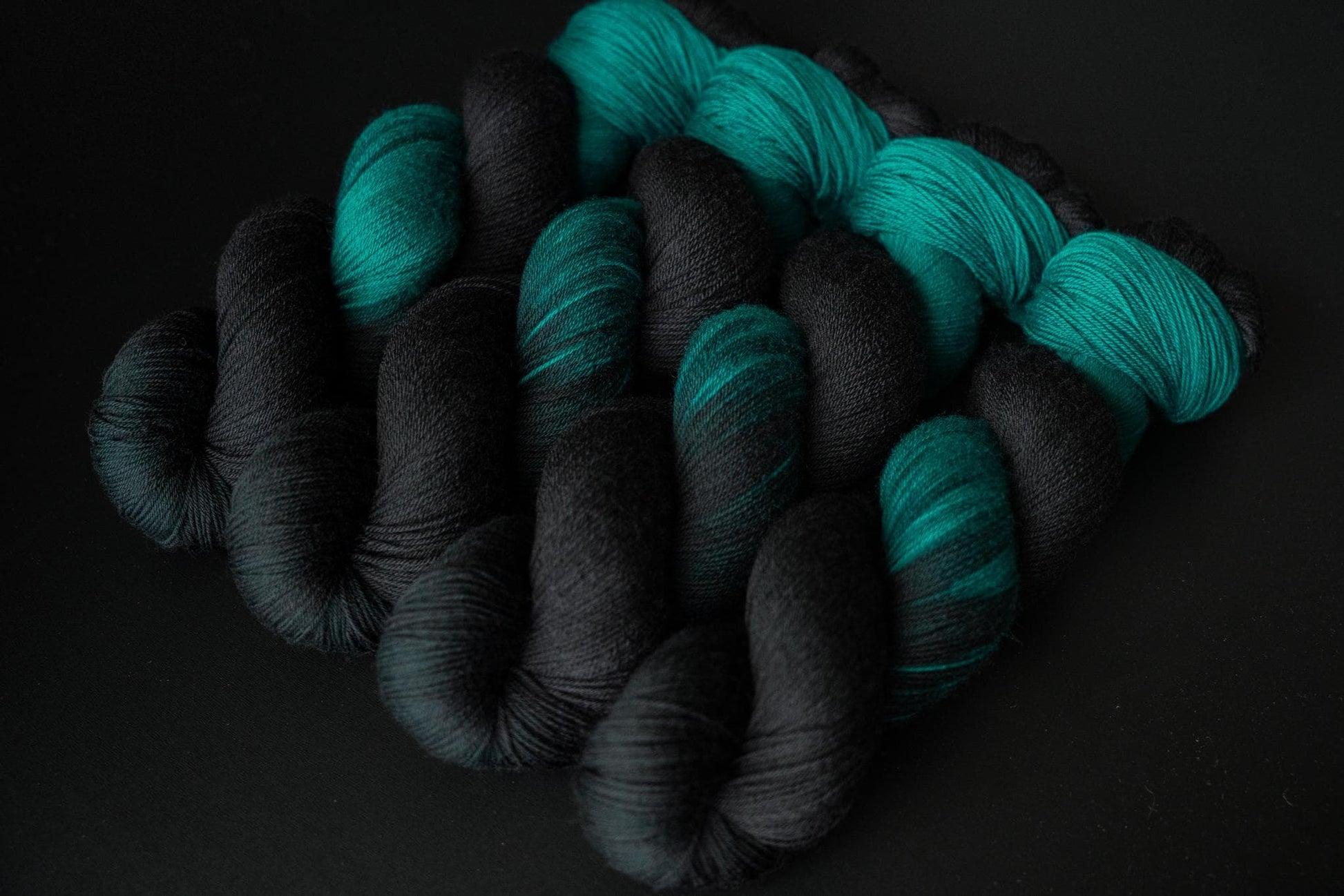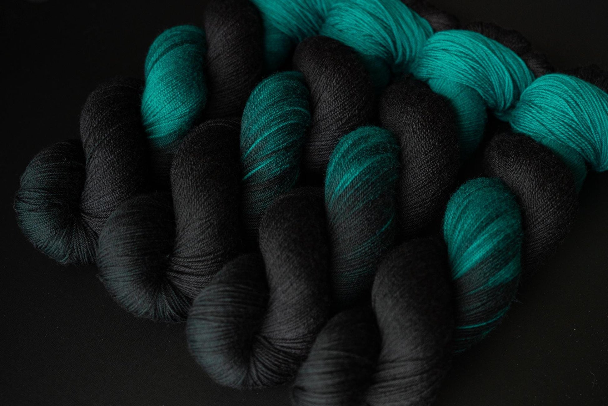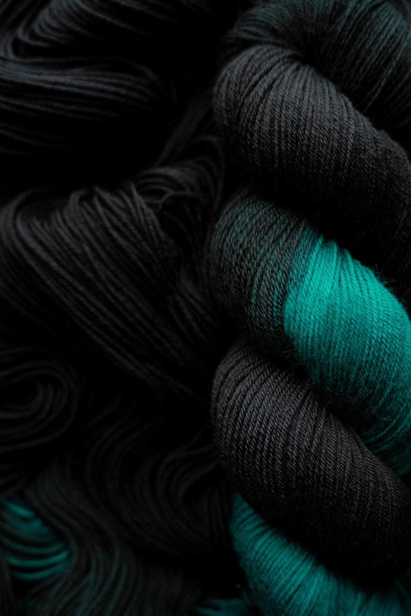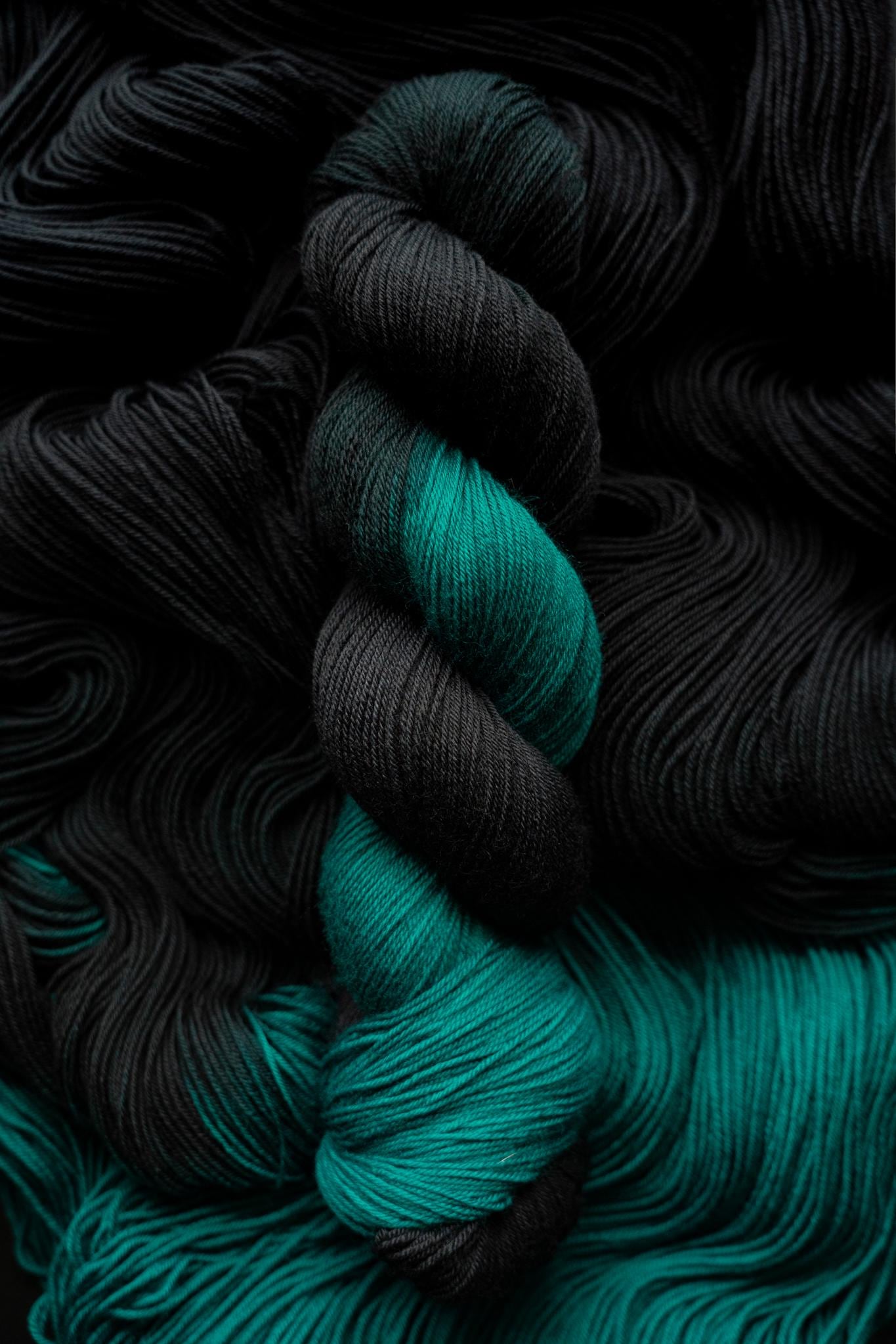 The color is a rich black faded to a true jewel toned teal. Teals are notoriously difficult to photograph, this color will be much more vibrant in person. Please note that depending on your device or monitor settings colors may appear slightly different than they are in person. Color also varies slightly by base, as the dye absorbs differently on different fiber content.