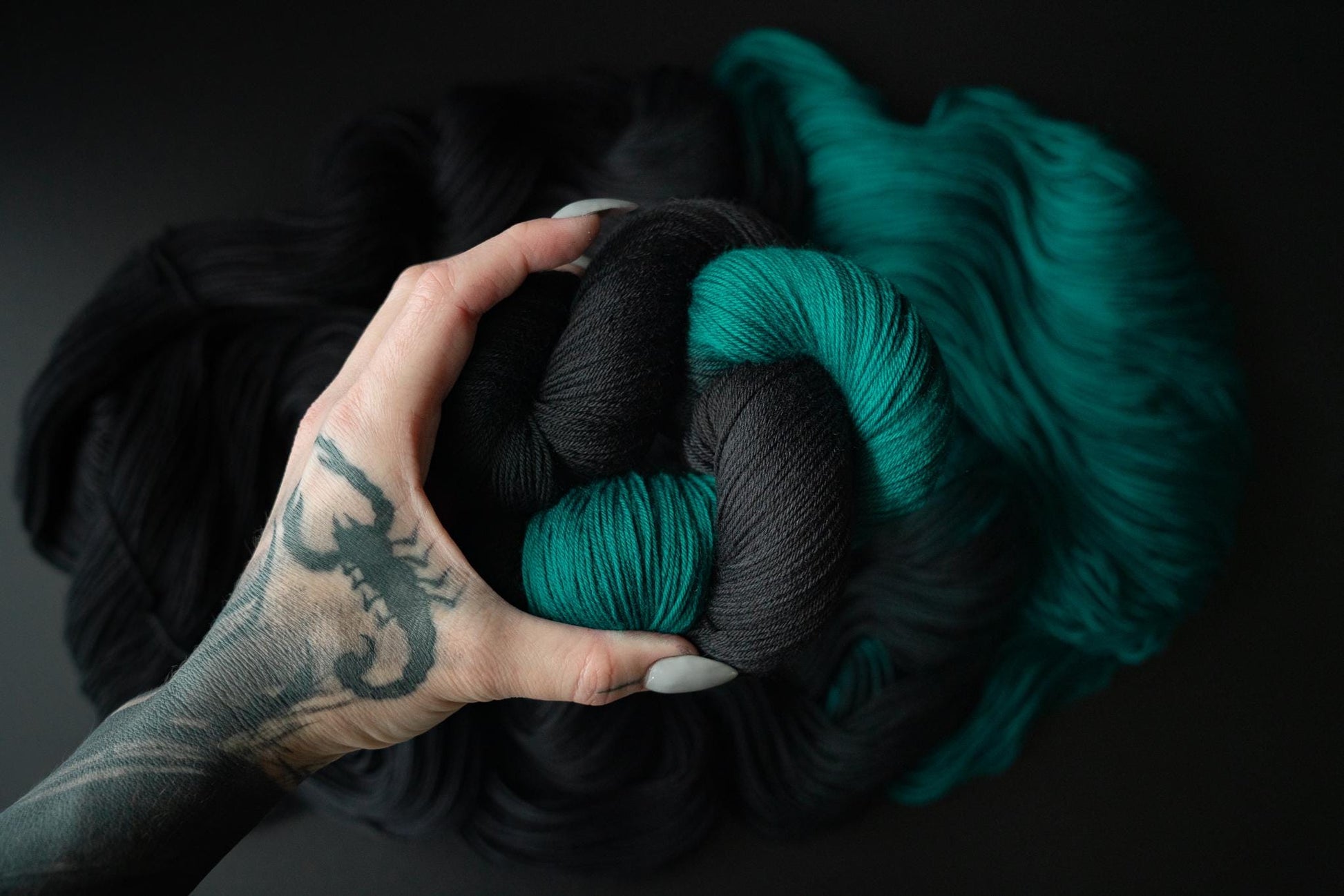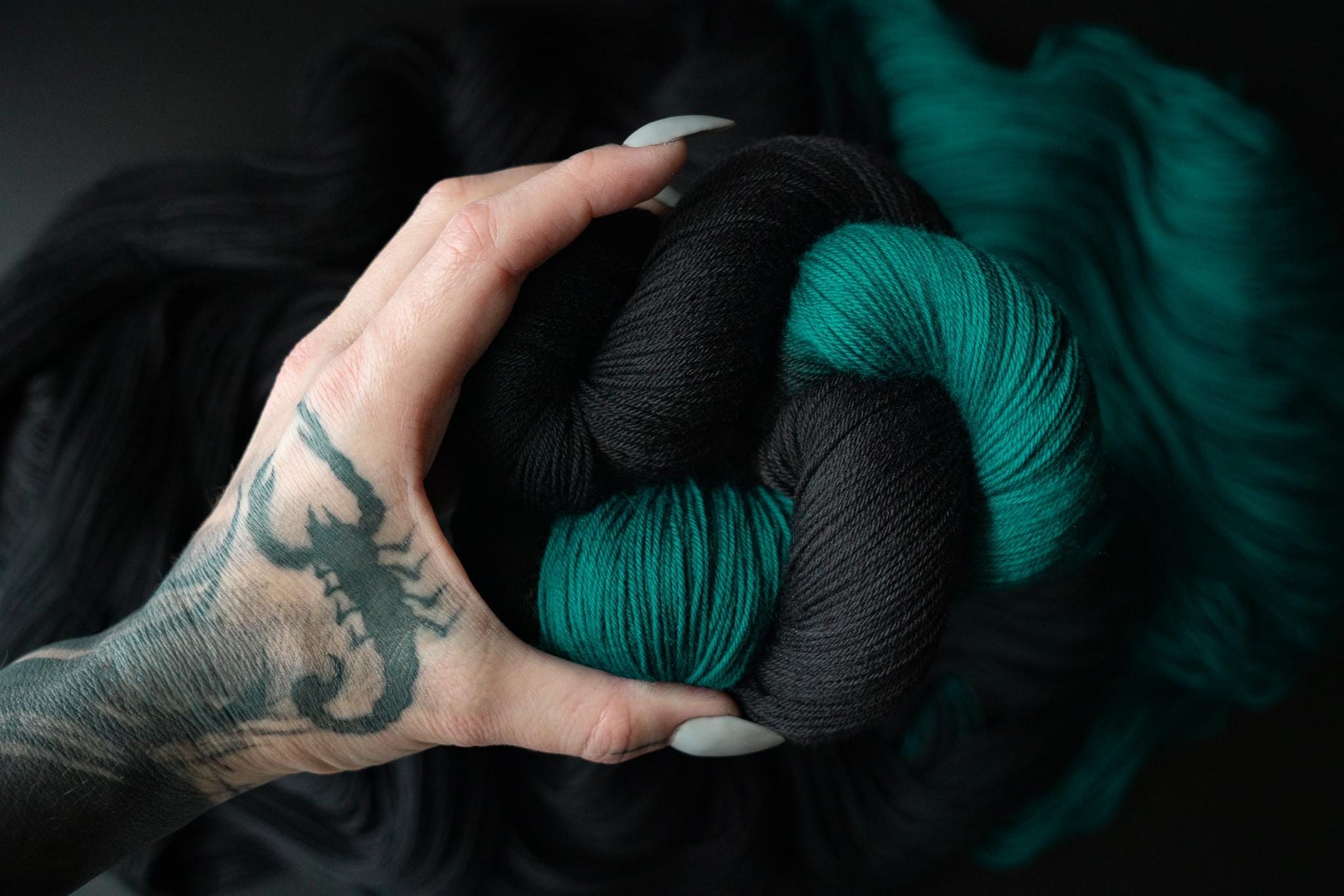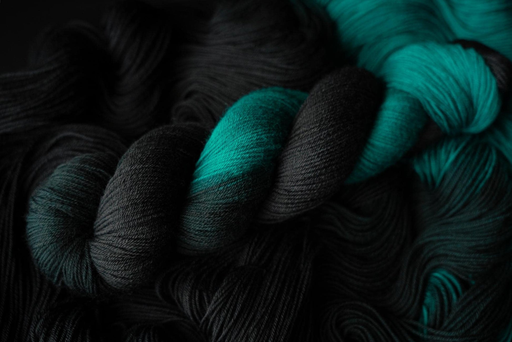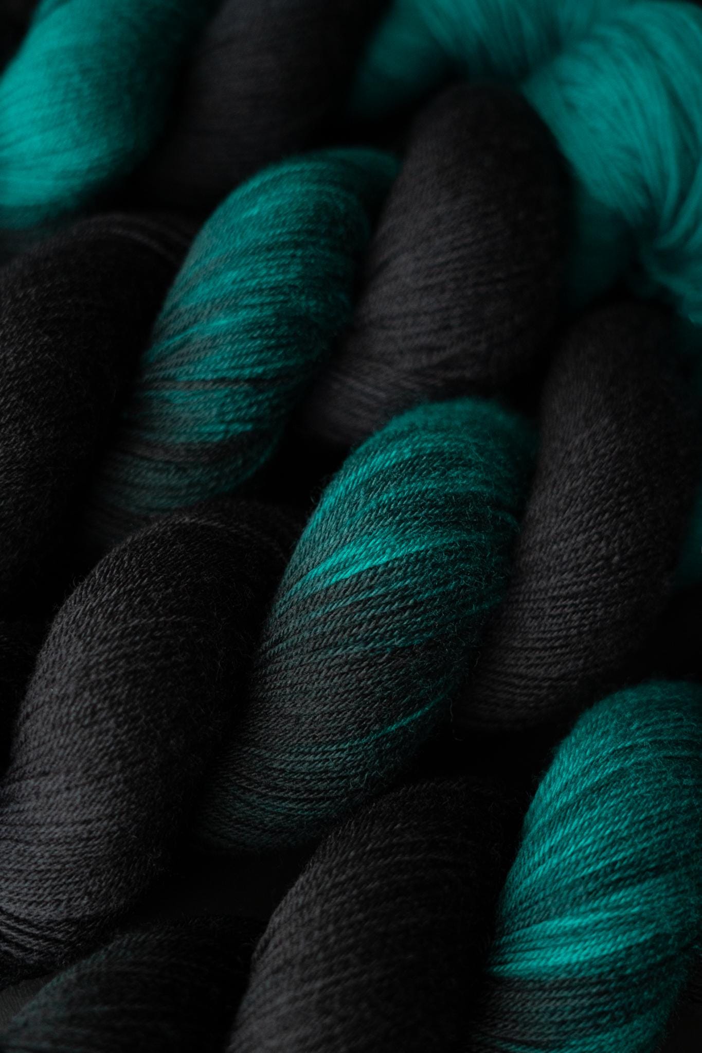 The color is a rich black faded to a true jewel toned teal. Teals are notoriously difficult to photograph, this color will be much more vibrant in person. Please note that depending on your device or monitor settings colors may appear slightly different than they are in person. Color also varies slightly by base, as the dye absorbs differently on different fiber content.