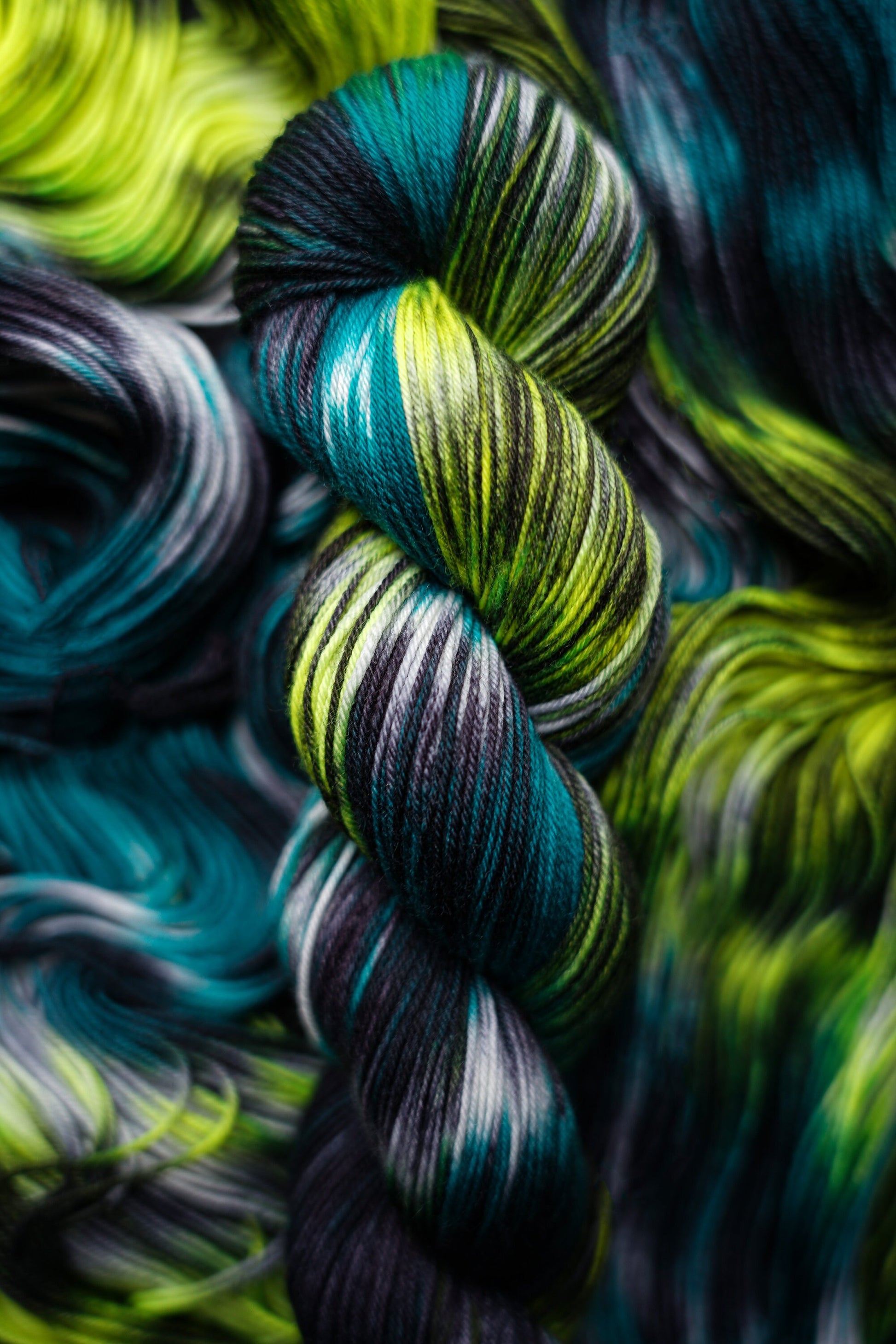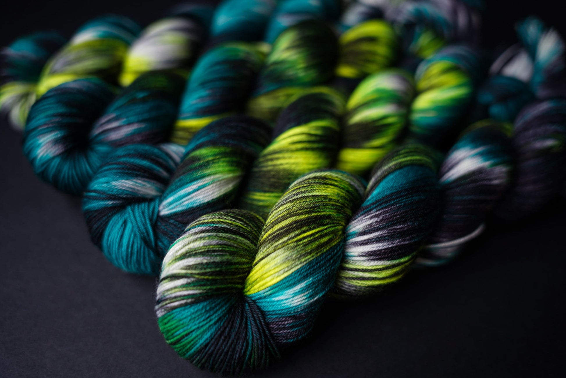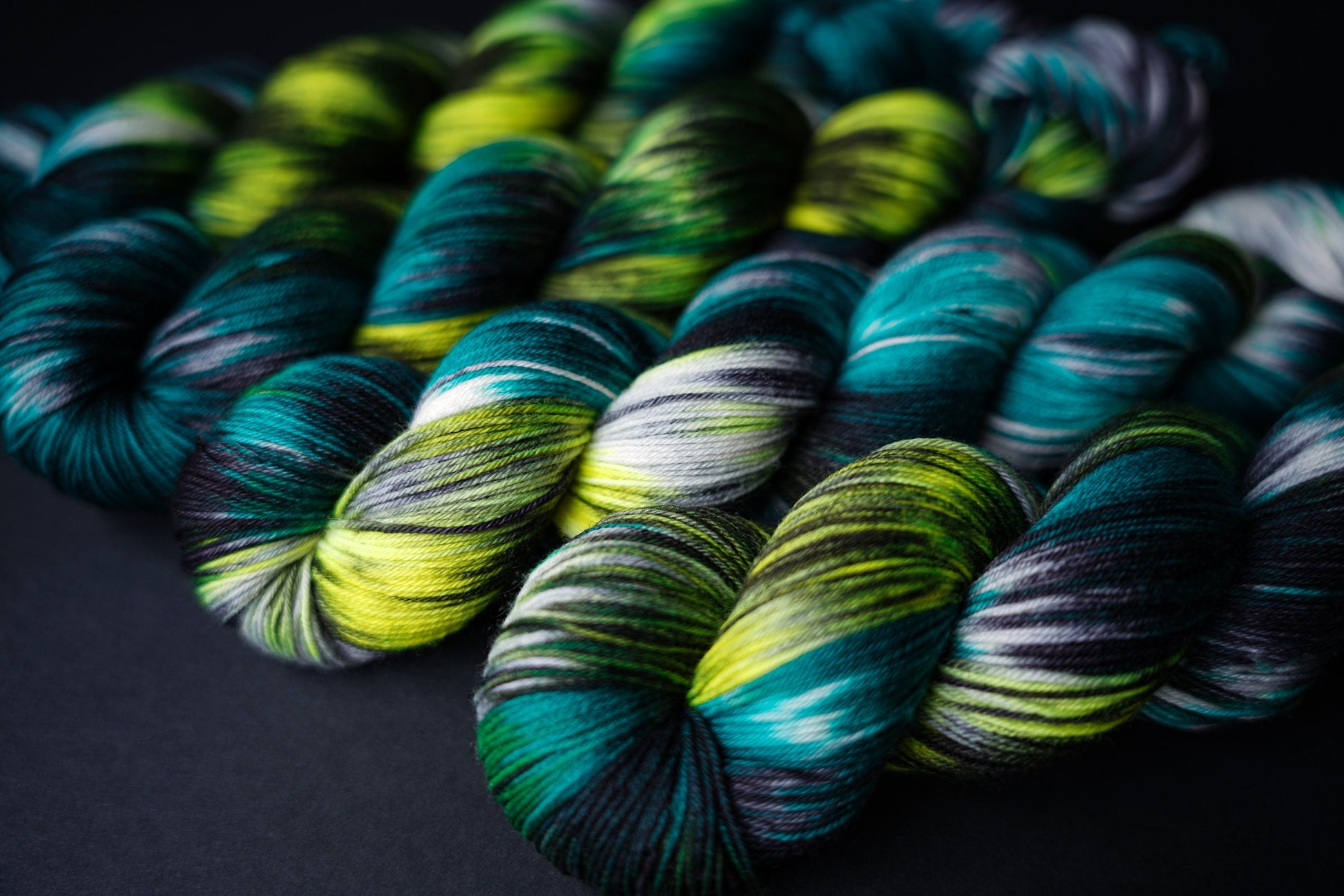 The color is a deep sea mix of black, shades of blue leaning teal and neon yellow. Please note that depending on your device or monitor settings colors may appear slightly different than they are in person. Color also varies slightly by base, as the dye absorbs differently on different fiber content.