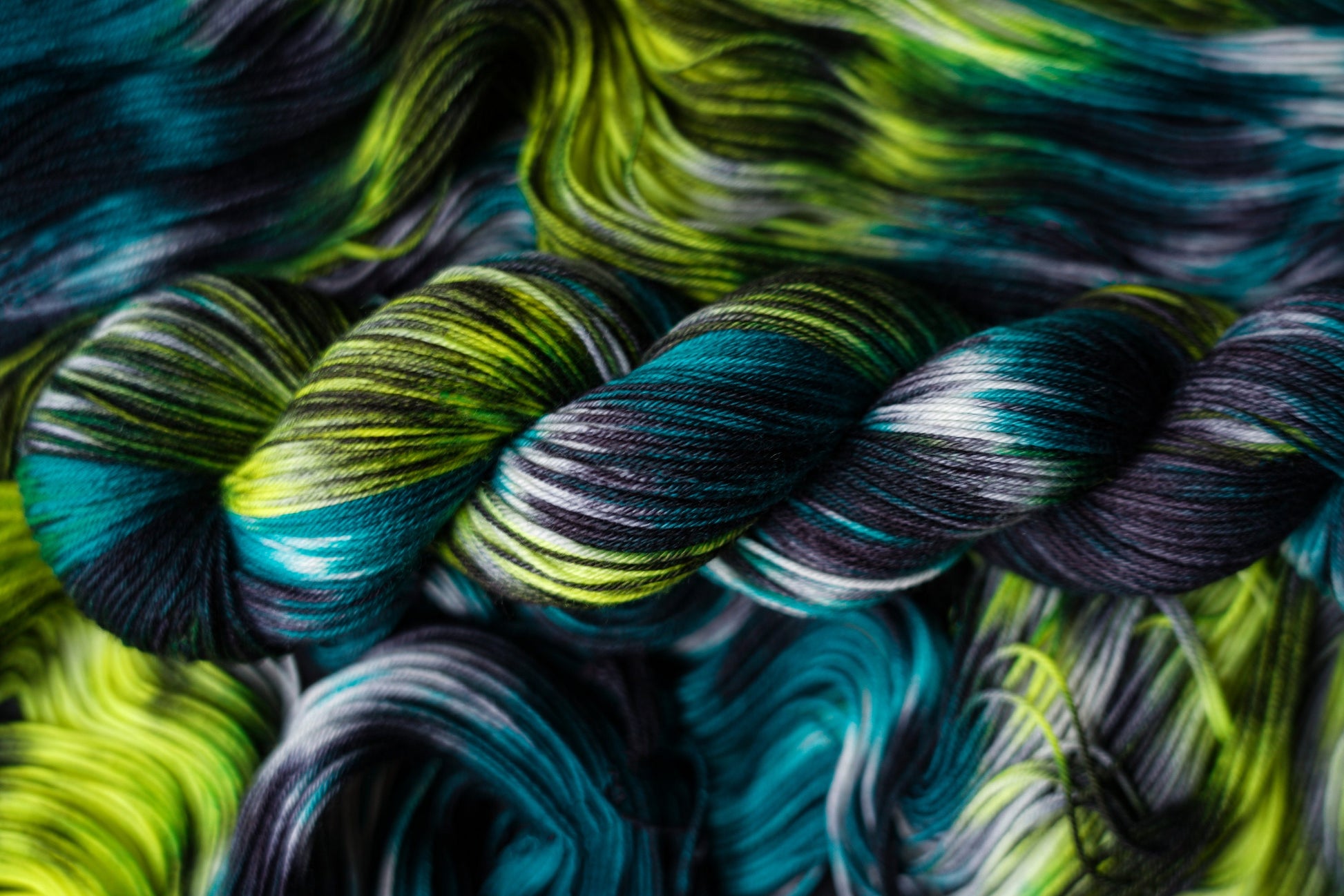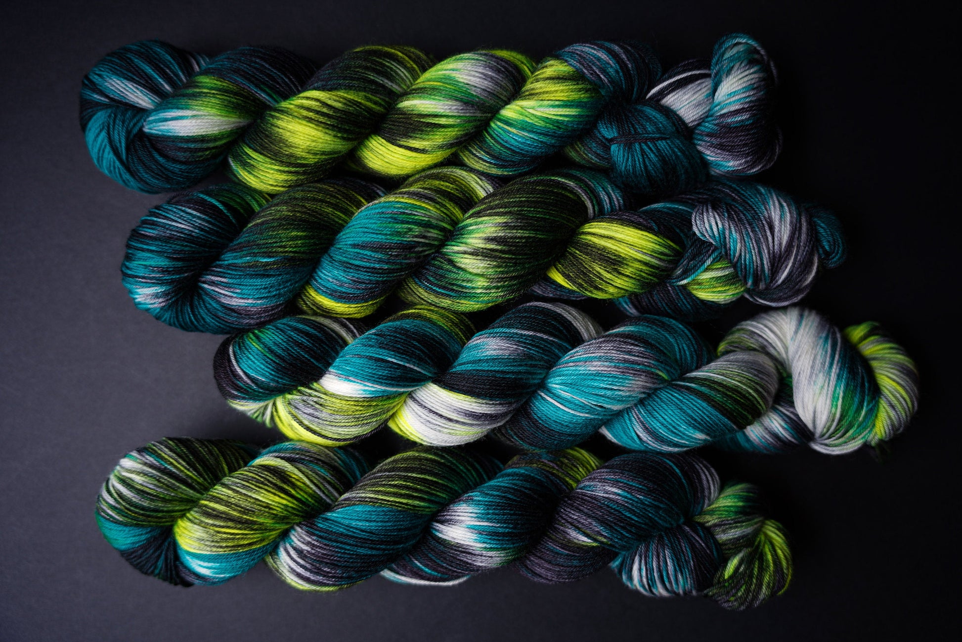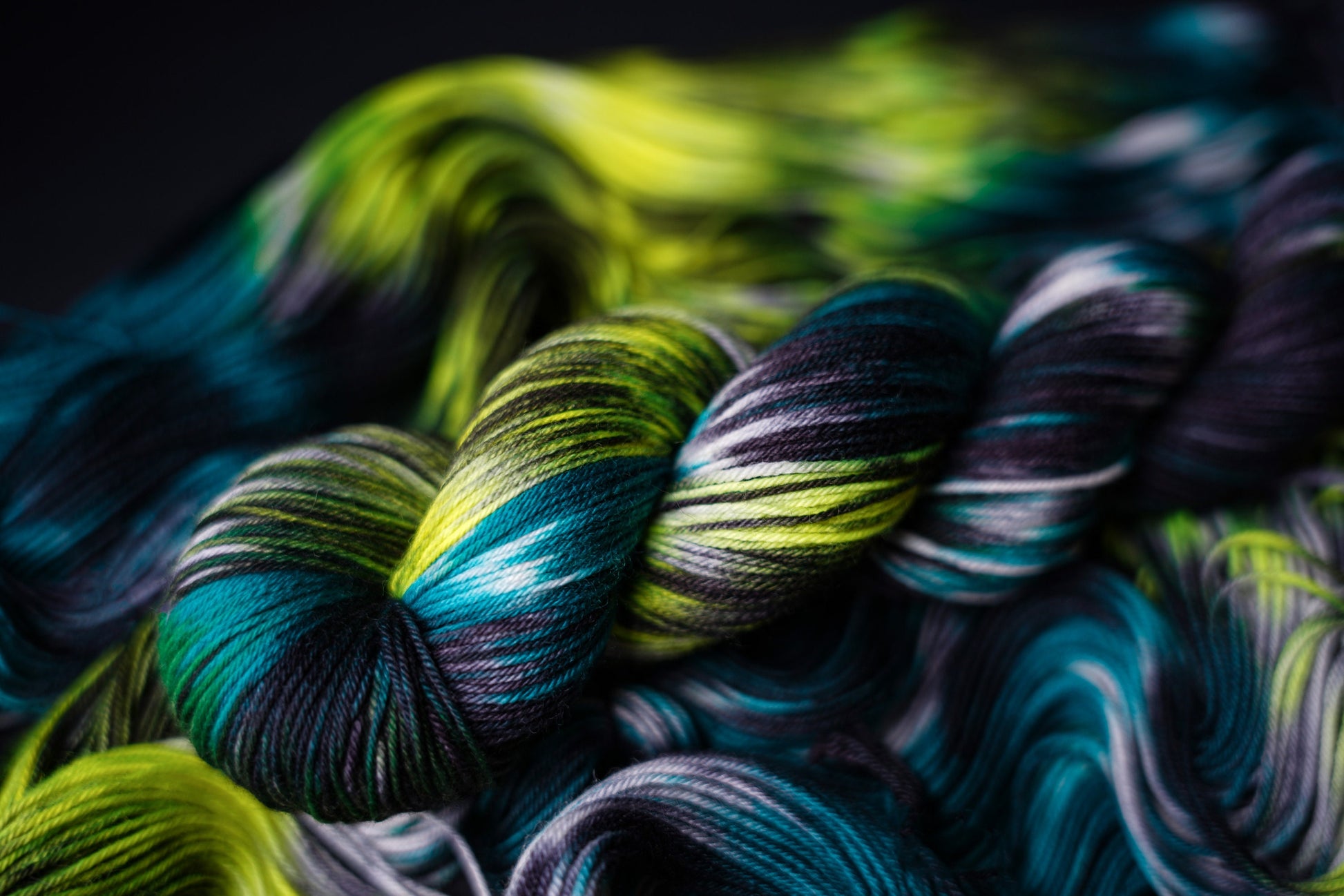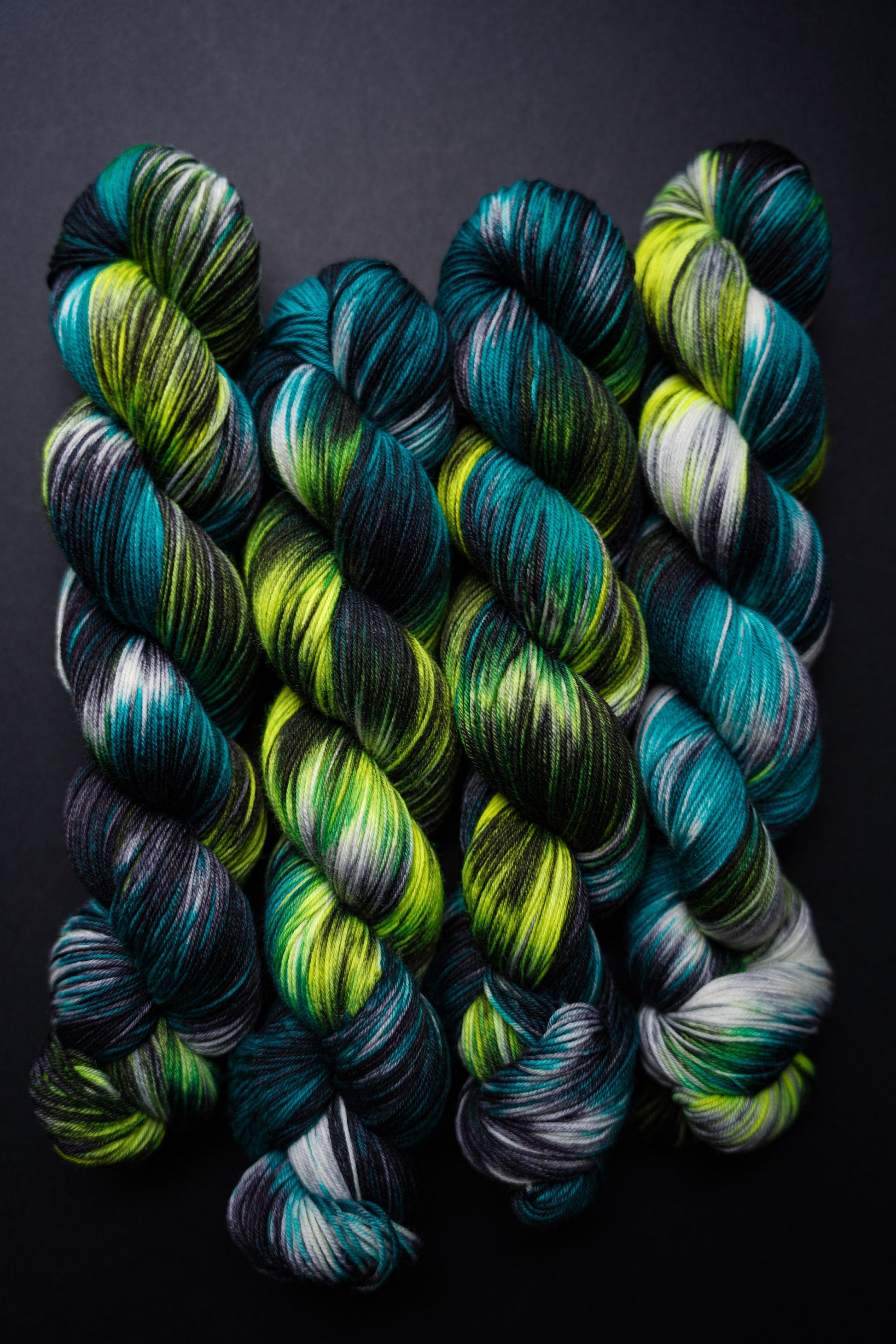 The color is a deep sea mix of black, shades of blue leaning teal and neon yellow. Please note that depending on your device or monitor settings colors may appear slightly different than they are in person. Color also varies slightly by base, as the dye absorbs differently on different fiber content.