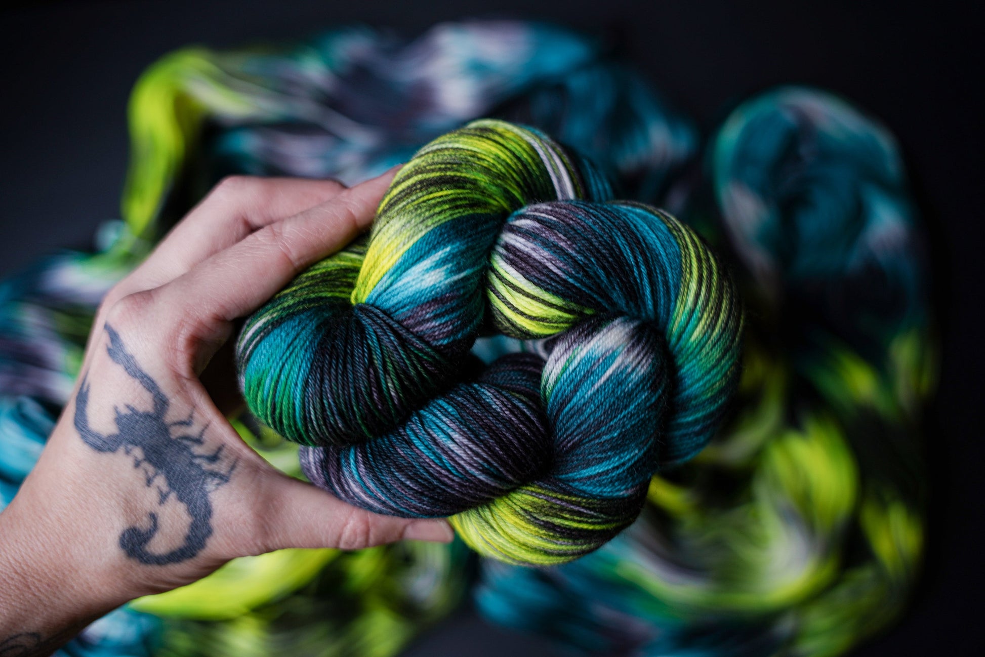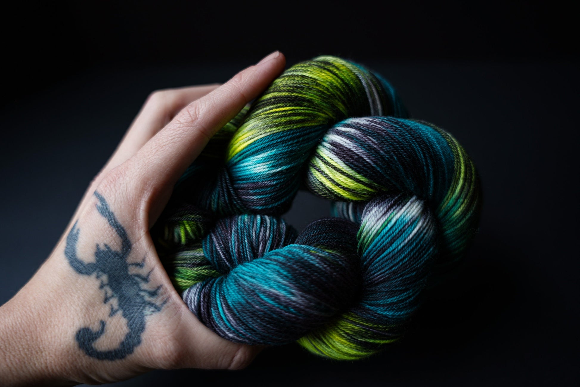 All skeins of Crow and Crescent Yarn are hand dyed with love in Shoreline, WA using high quality professional acid dyes in small batches. Each skein is unique, and dye lots vary.
