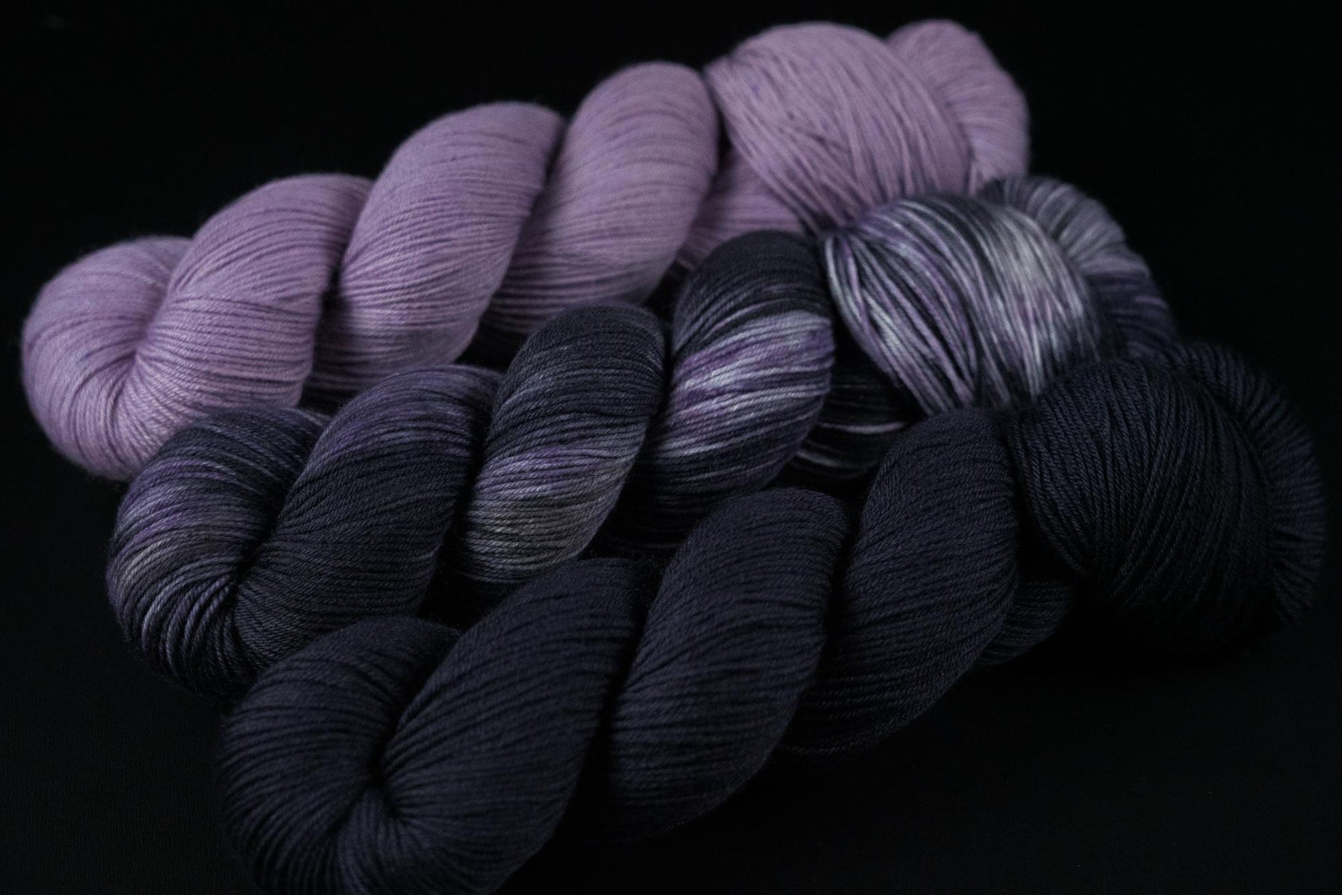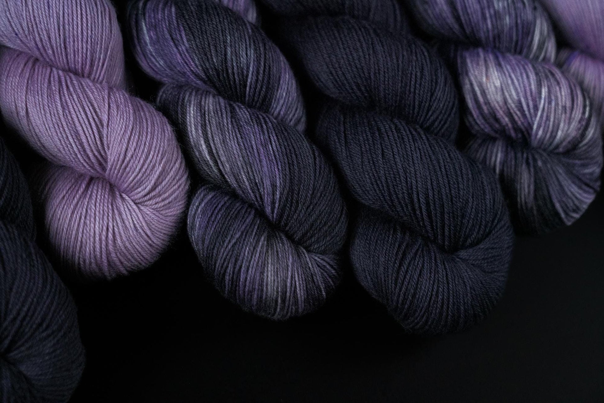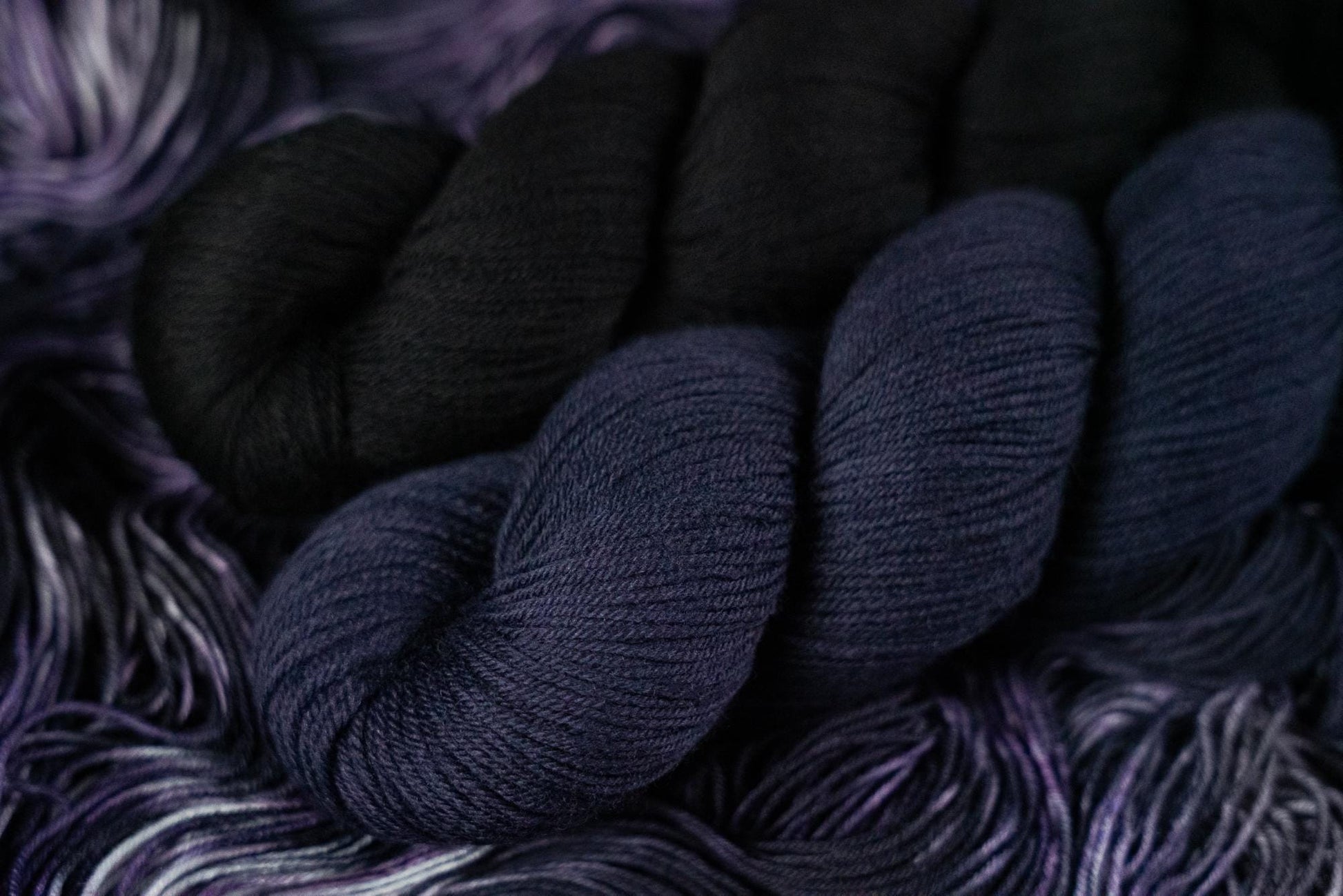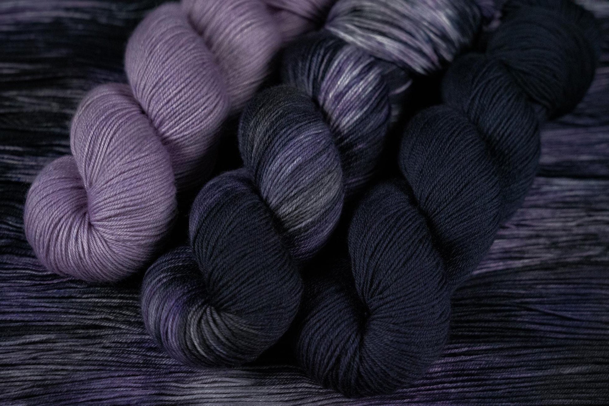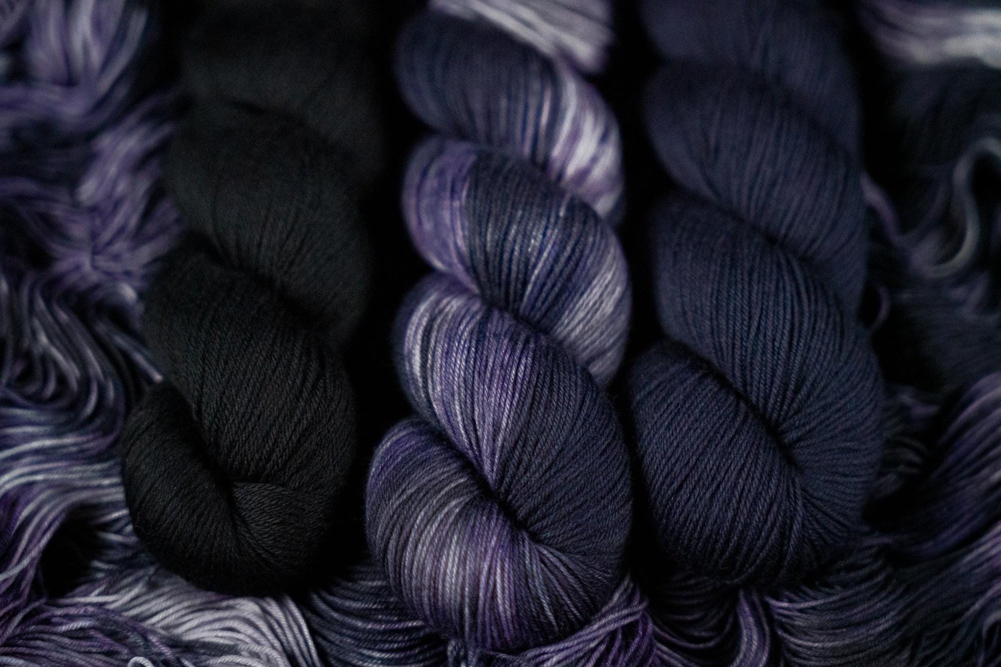 The other three colorways in these images are The Raven (variegated), Lenore (dusty purple), and Void (black) is shown to show the difference in color between Midnight Dreary and a true black since it can show differently in images, though Void was not a part of this collection. This collection was created for the full moon in October of 2024.