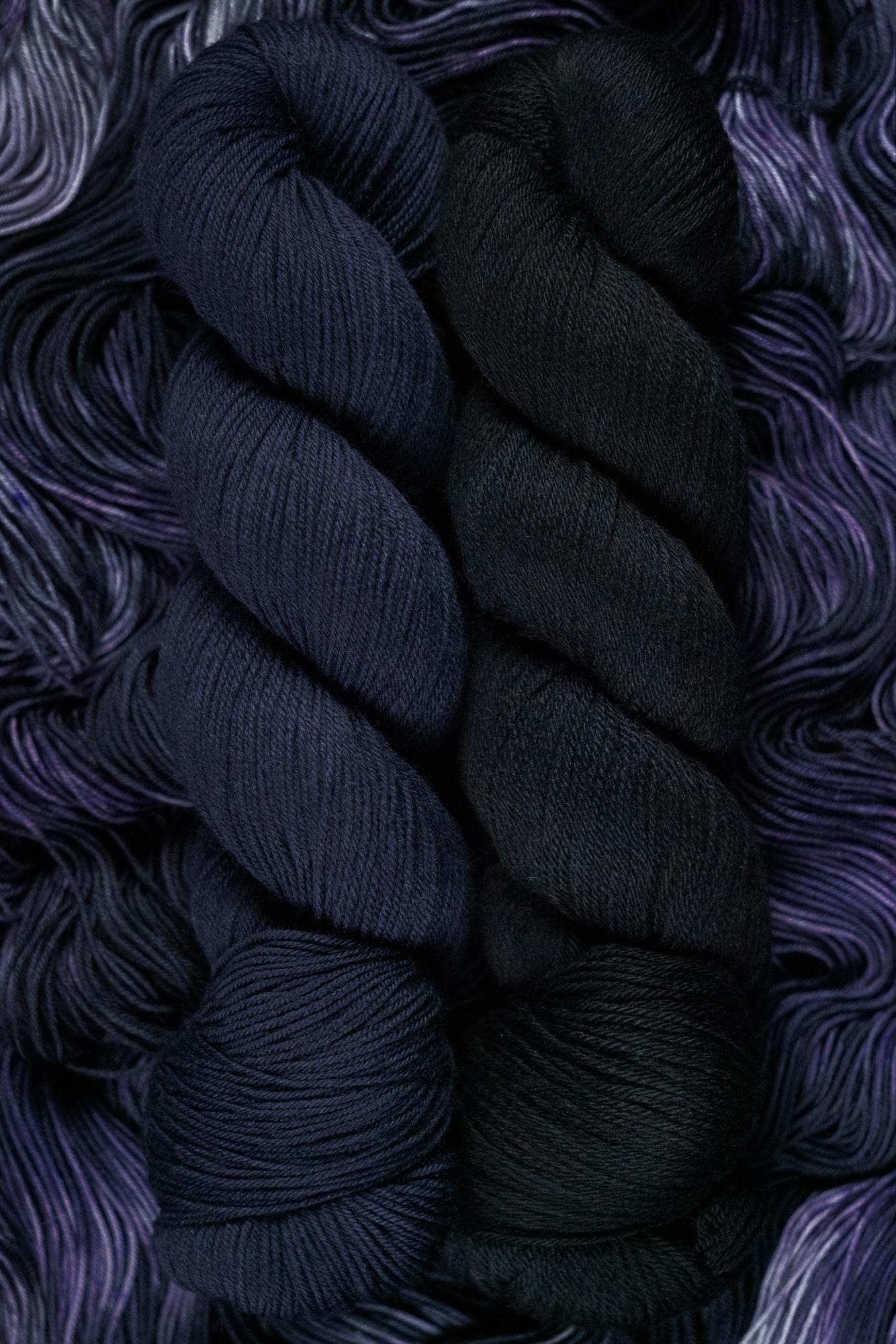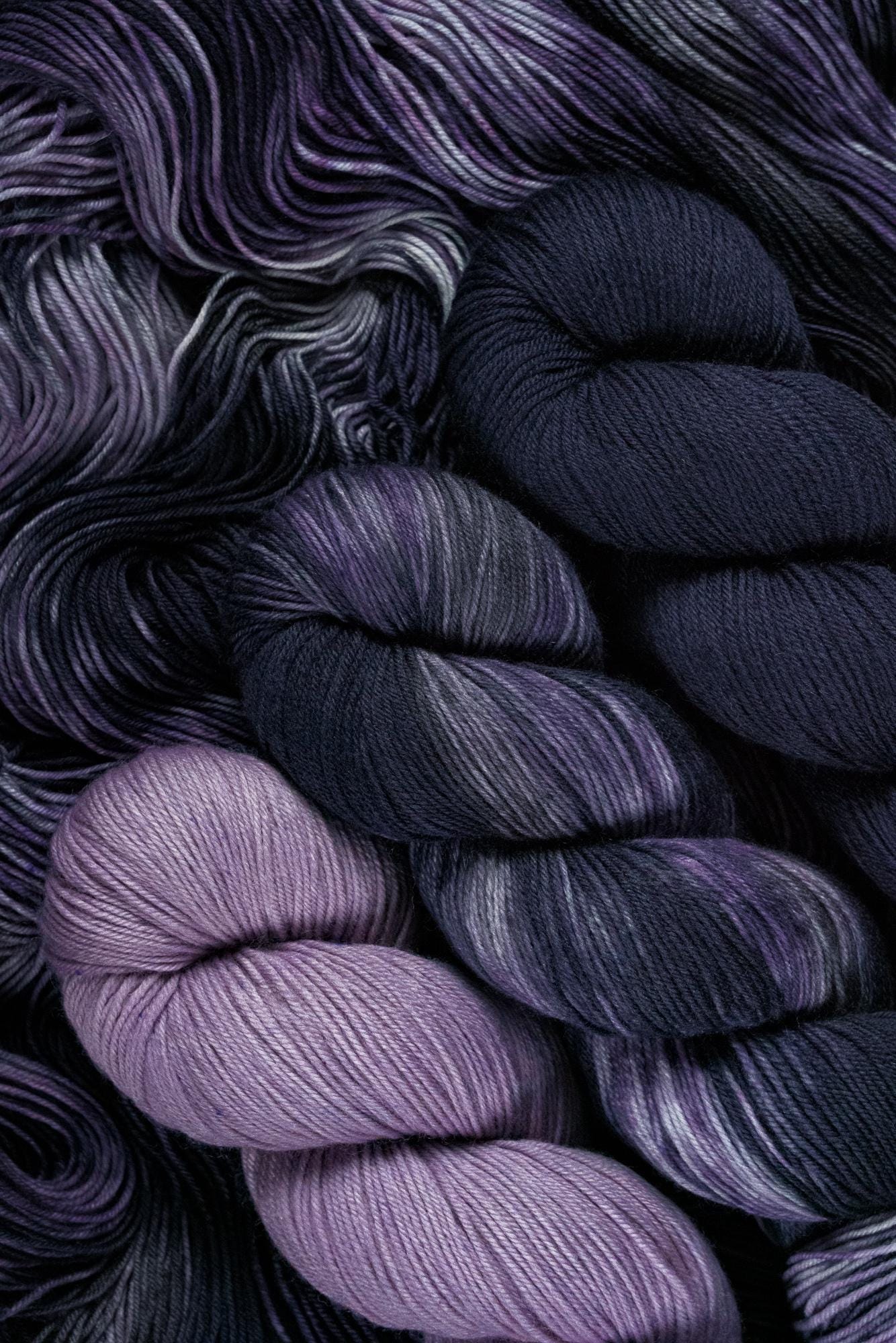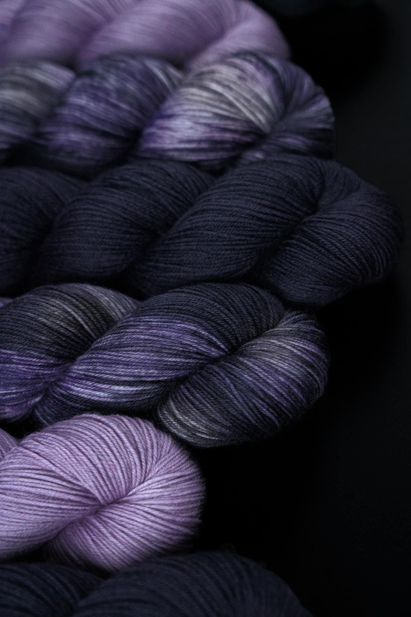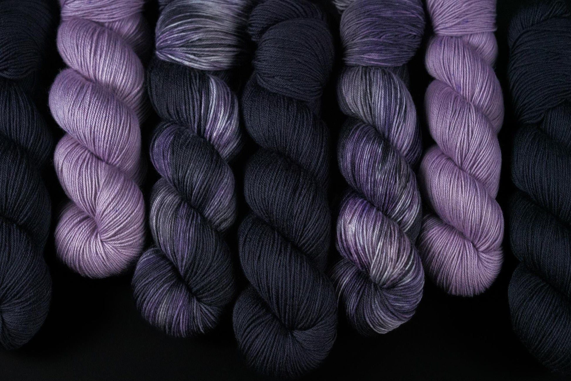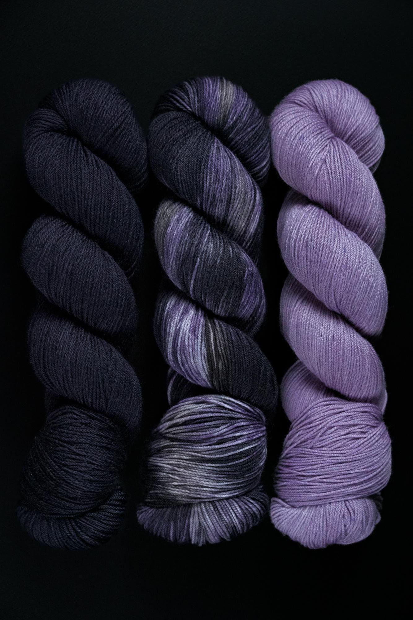 The other three colorways in these images are The Raven (variegated), Lenore (dusty purple), and Void (black) is shown to show the difference in color between Midnight Dreary and a true black since it can show differently in images, though Void was not a part of this collection. This collection was created for the full moon in October of 2024.