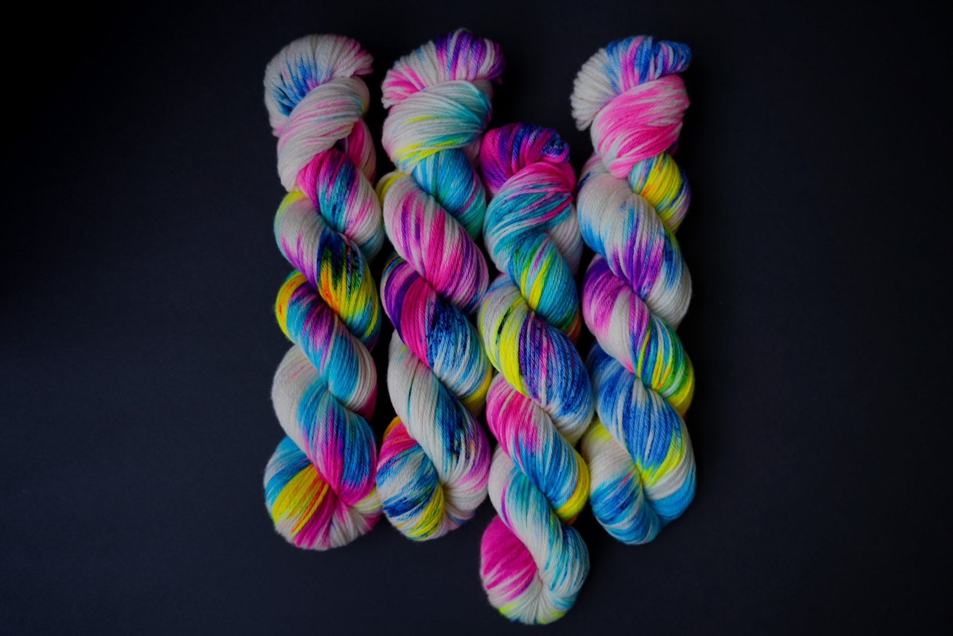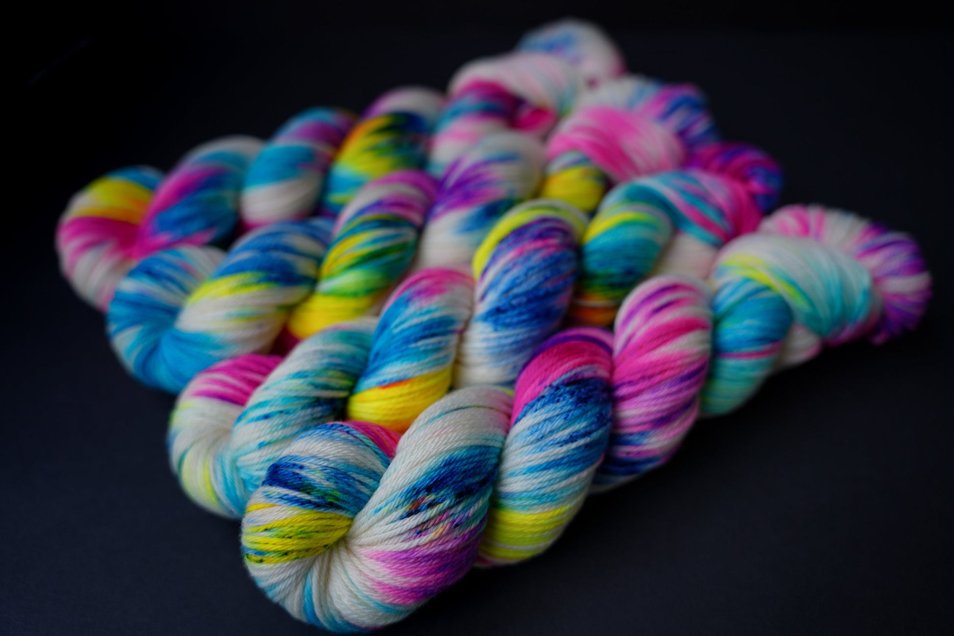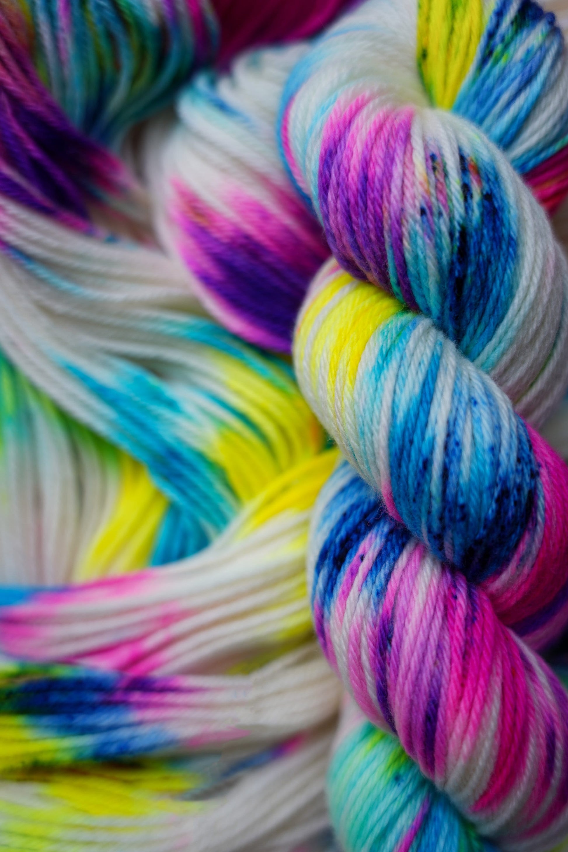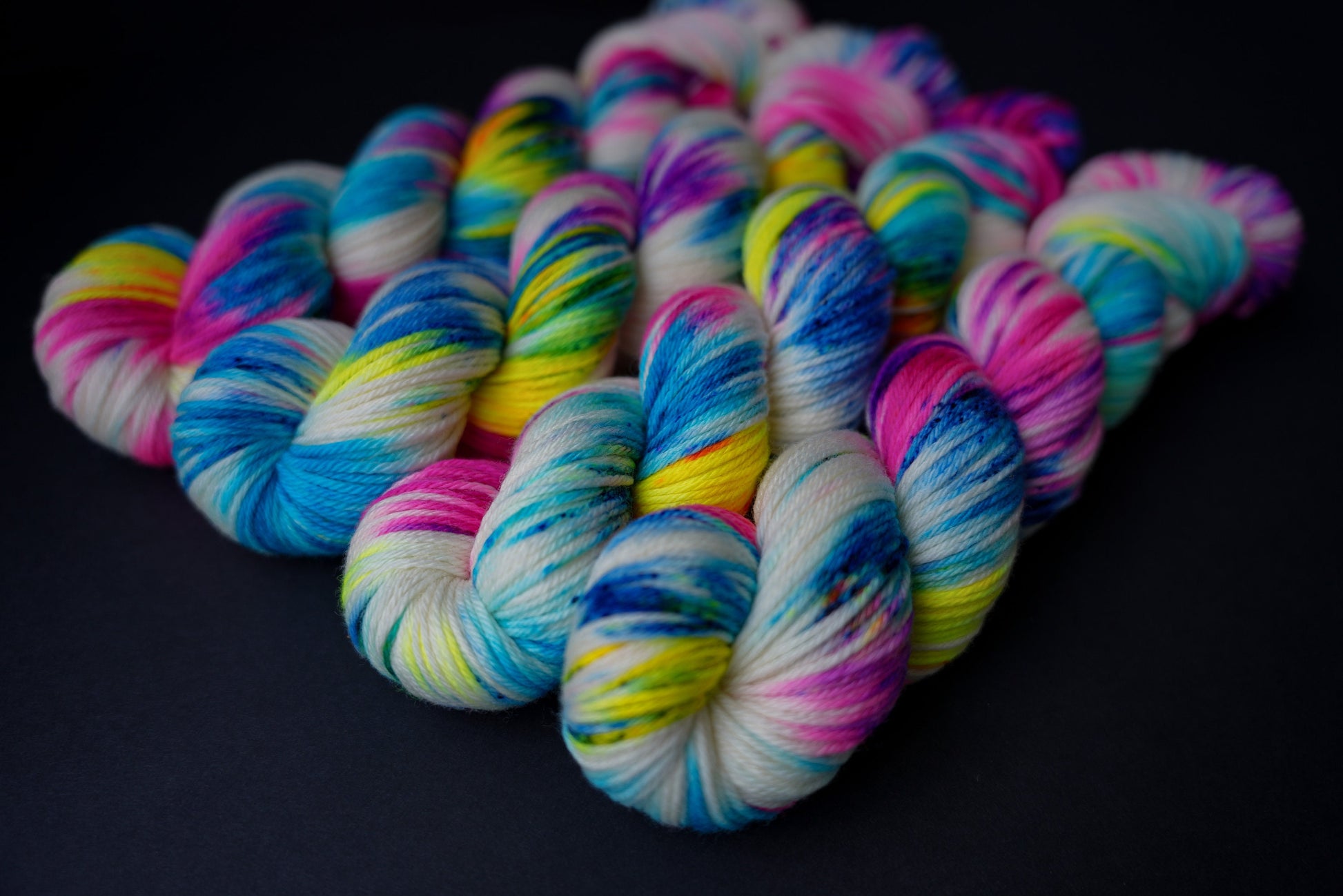 The color is splashes of brilliant neons in blue, purple, pink and yellow with splashes of orange and green on a cream base. Please note that depending on your device or monitor settings colors may appear slightly different than they are in person. Color also varies slightly by base, as the dye absorbs differently on different fiber content.