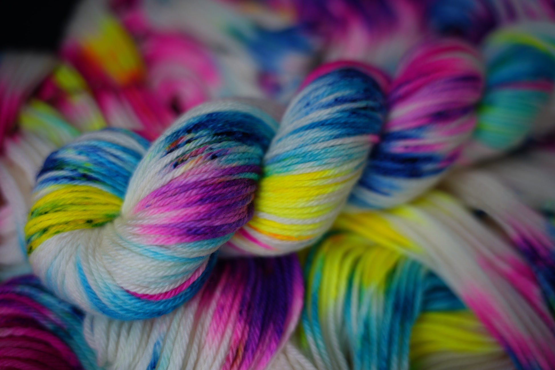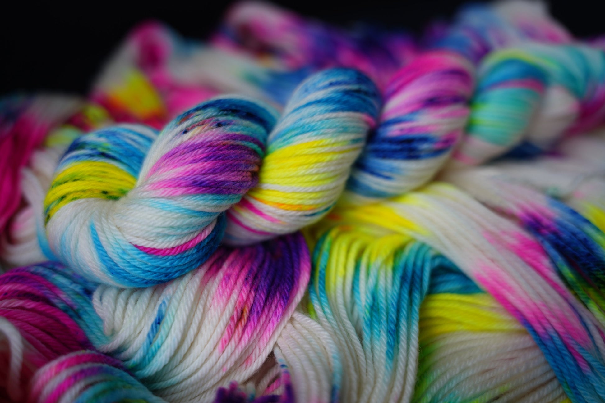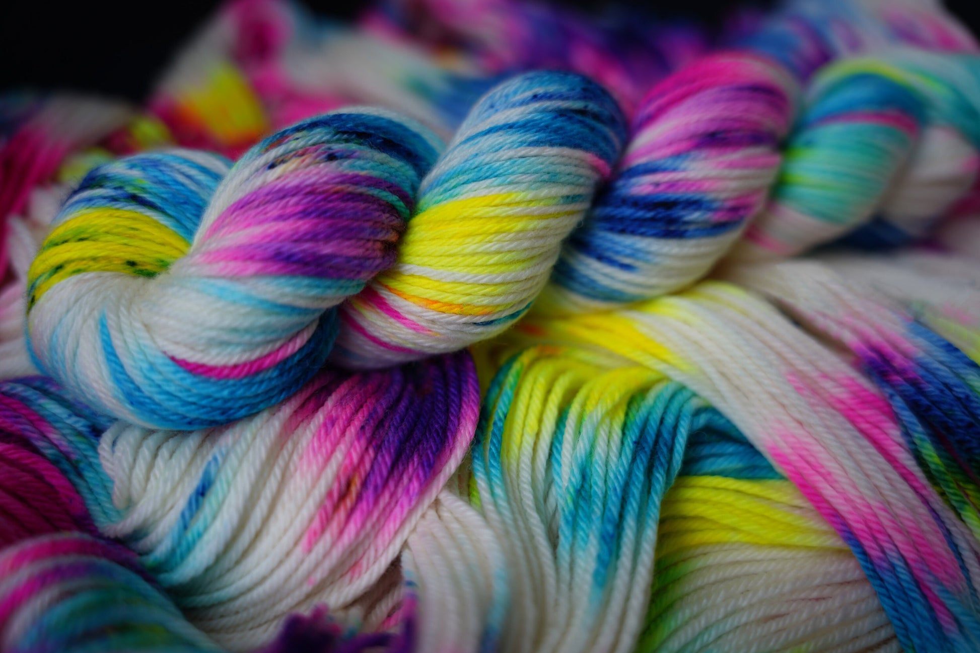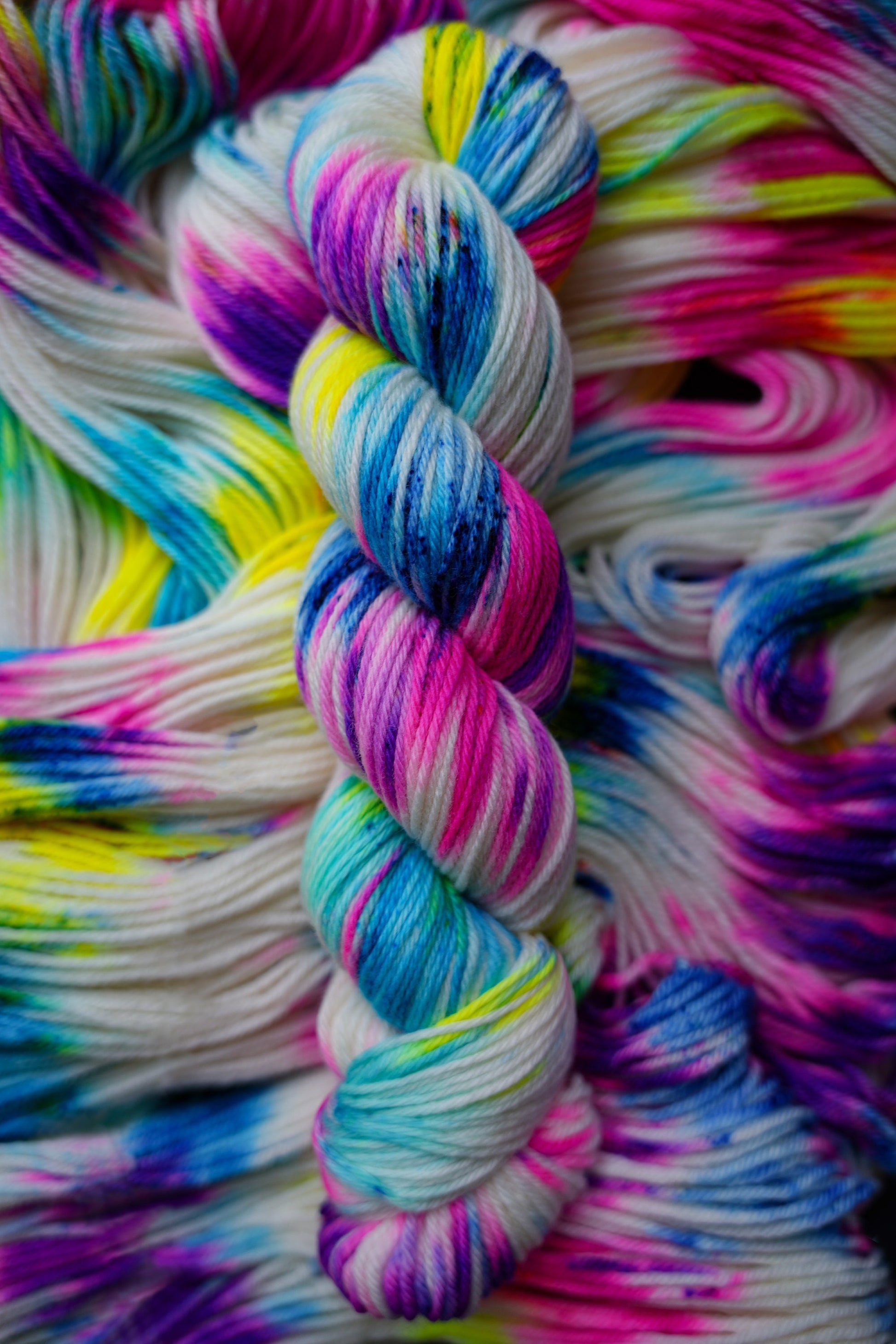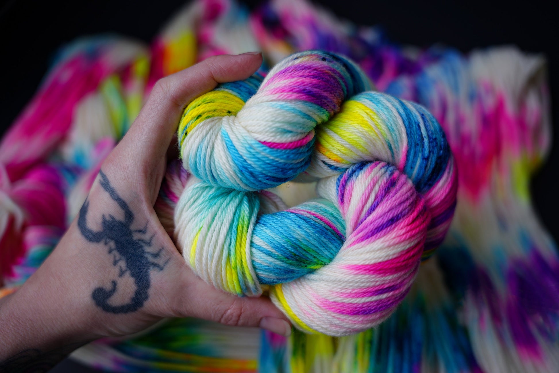 The color is splashes of brilliant neons in blue, purple, pink and yellow with splashes of orange and green on a cream base. Please note that depending on your device or monitor settings colors may appear slightly different than they are in person. Color also varies slightly by base, as the dye absorbs differently on different fiber content.