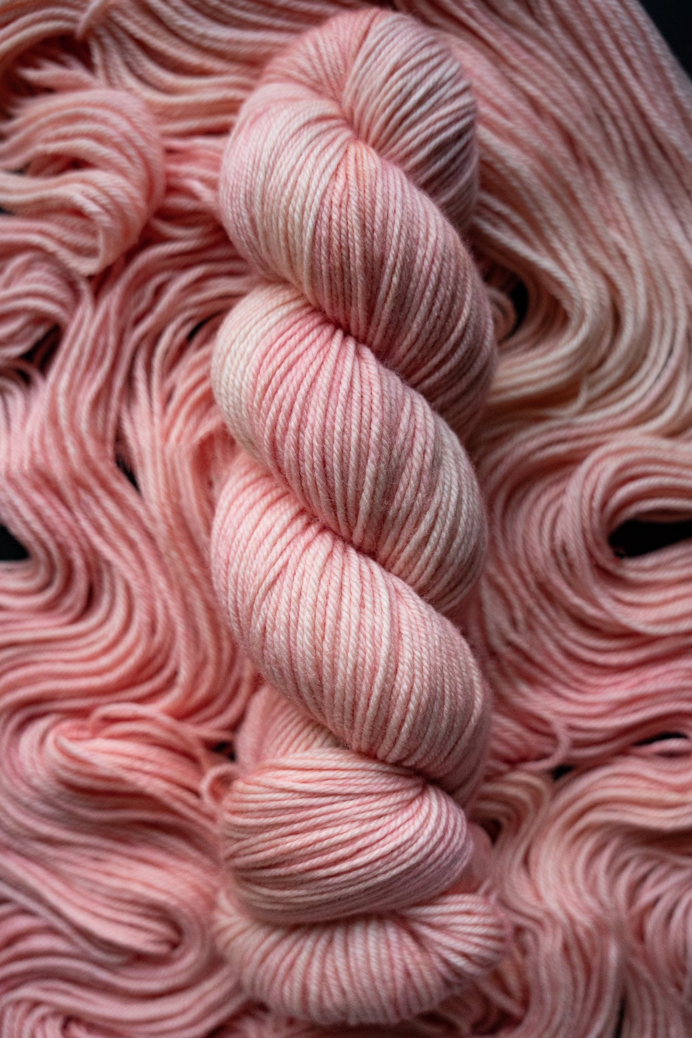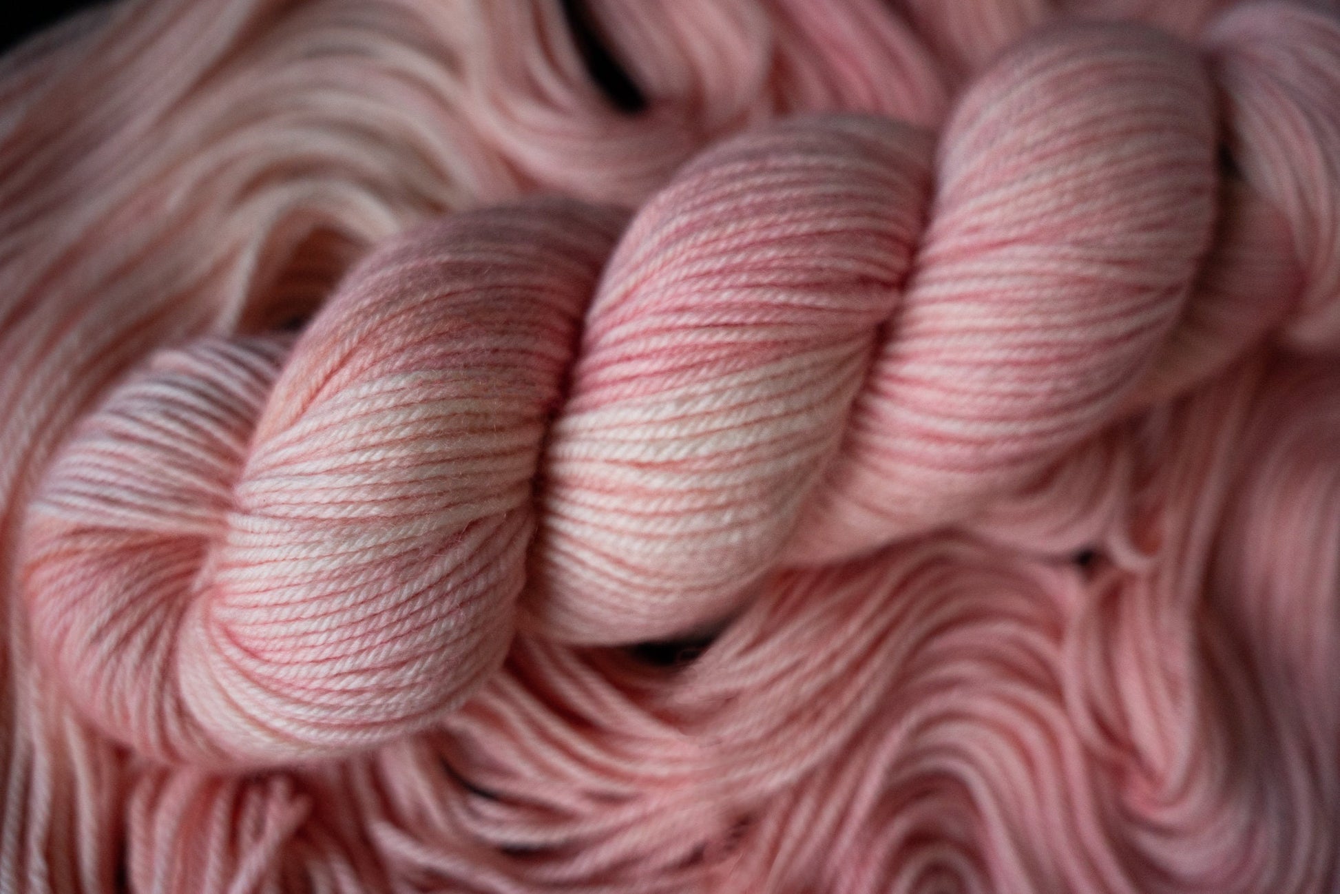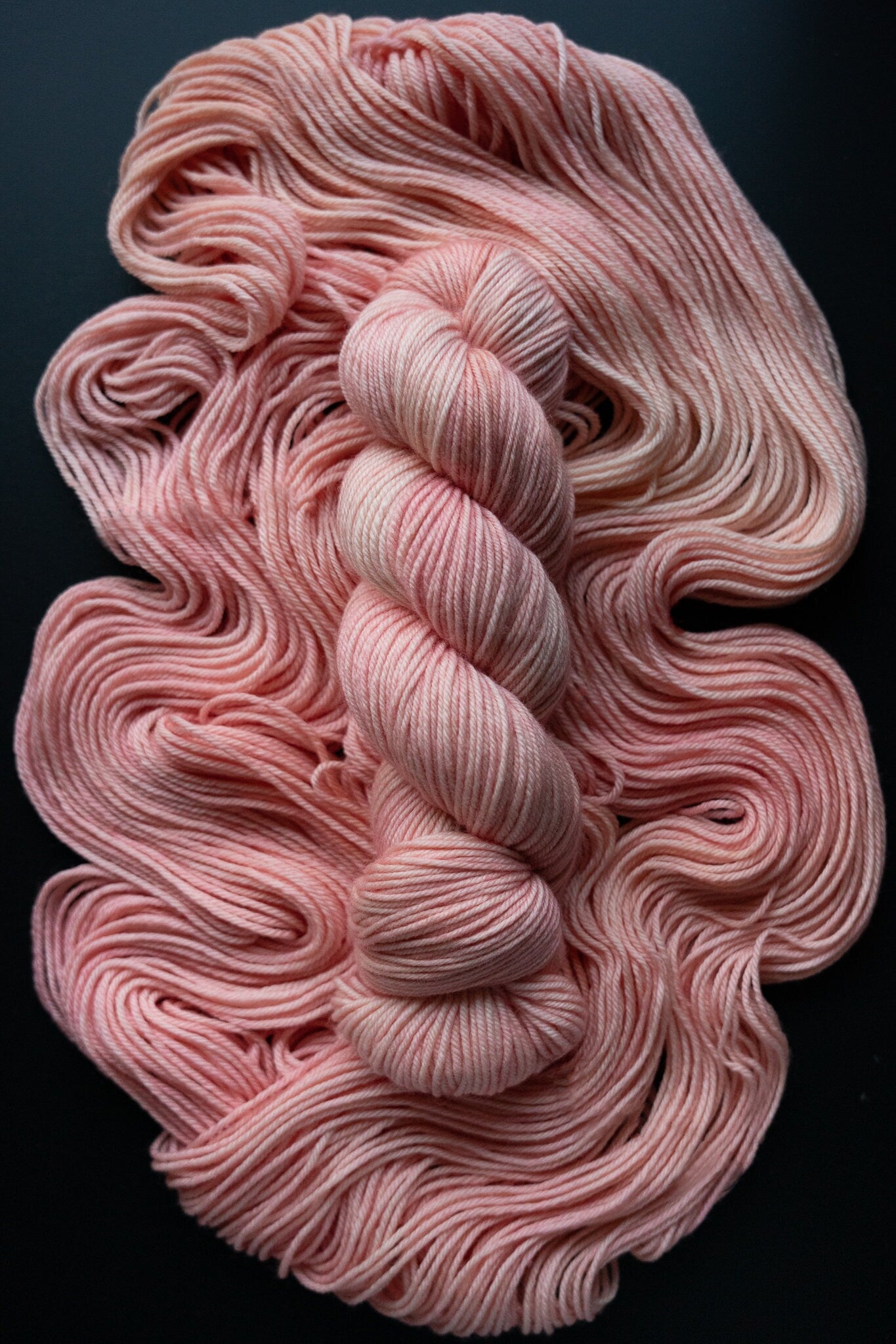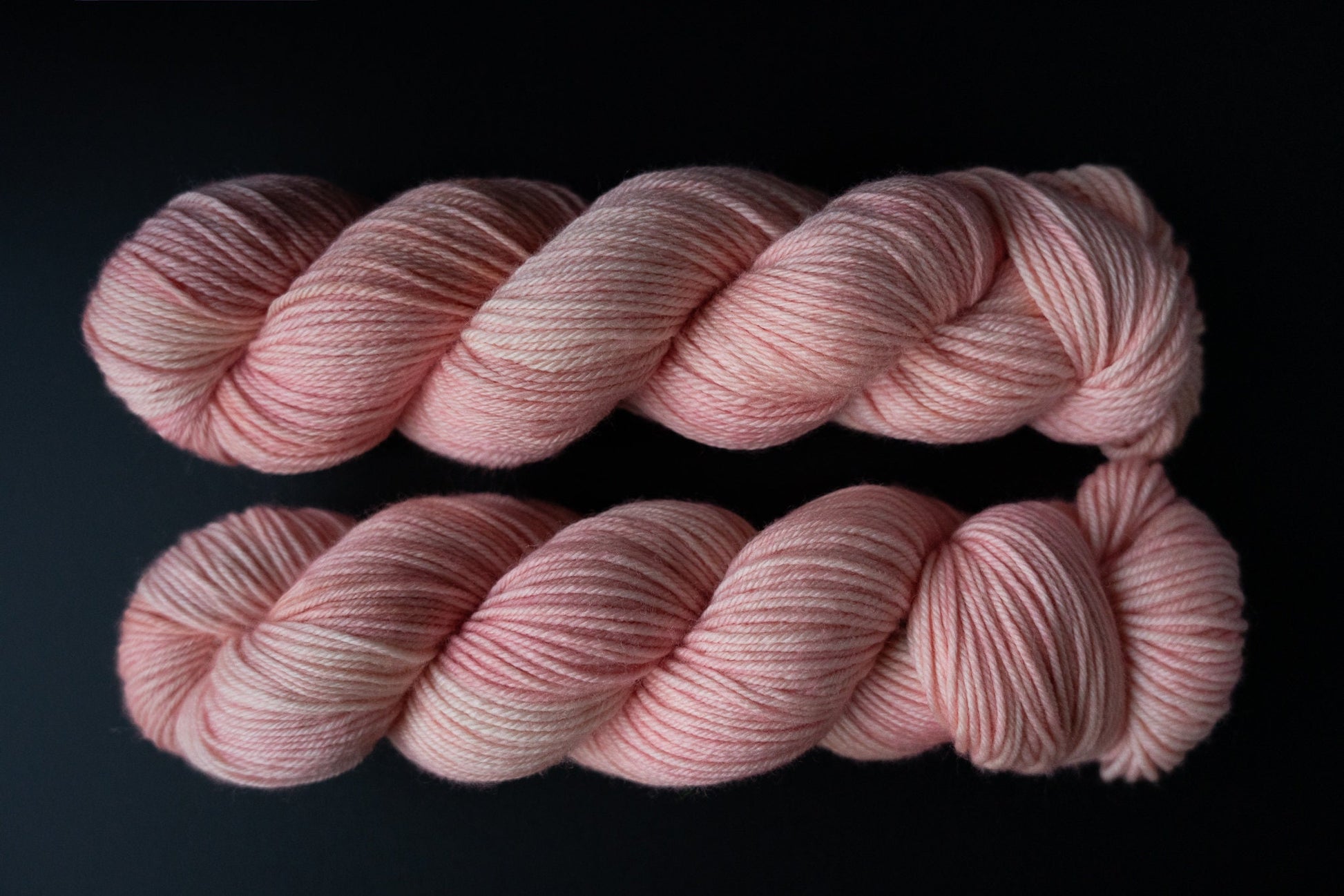 Primrose was created to pair with Rhodonite and Stromatolite. It is similar in color to Aura, but Aura is more of a true bubblegum pink whereas Primrose has some peach tones. Please note that depending on your device or monitor settings colors may appear slightly different than they are in person. Color also varies slightly by base, as the dye absorbs differently on different fiber content.