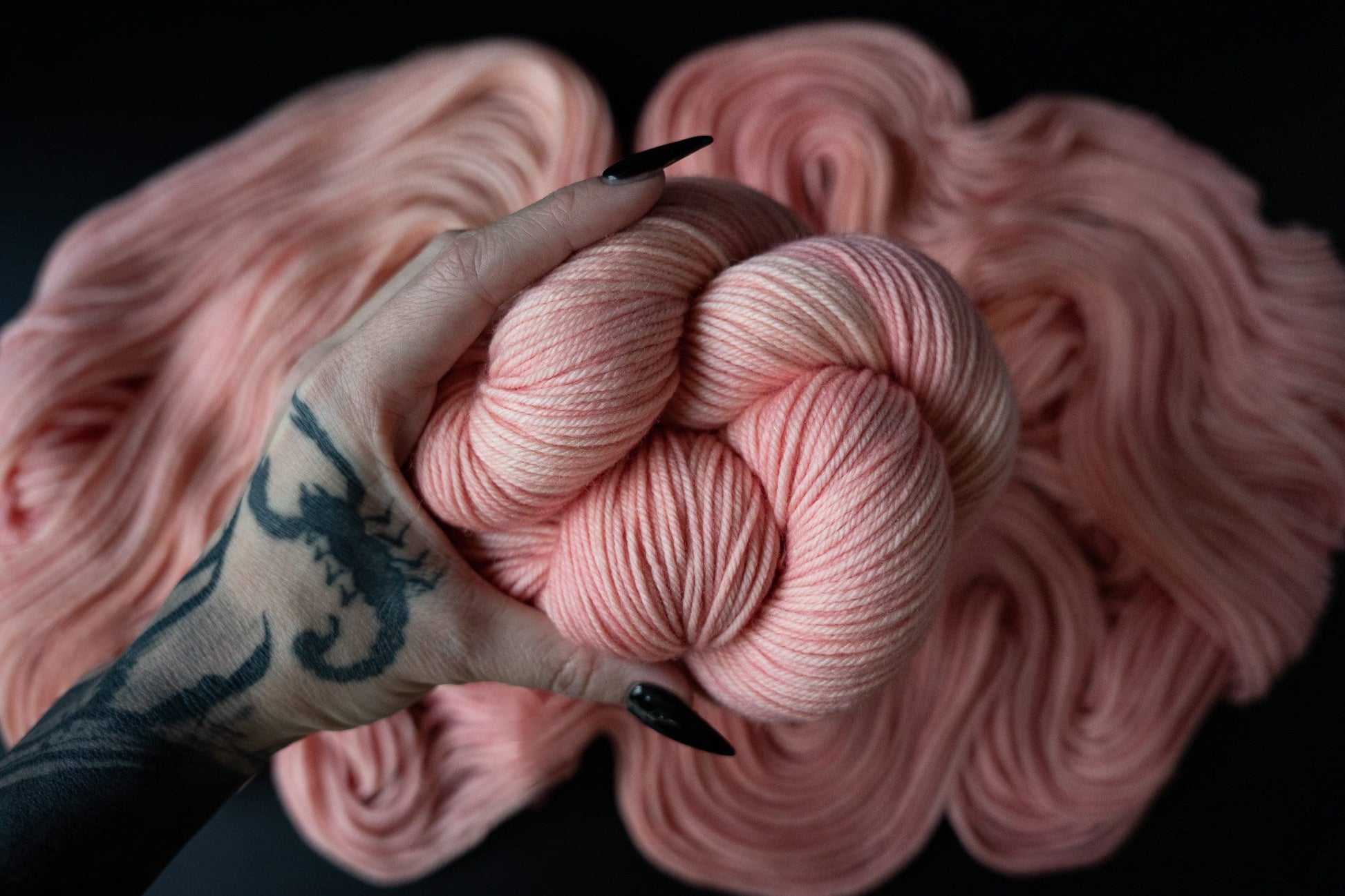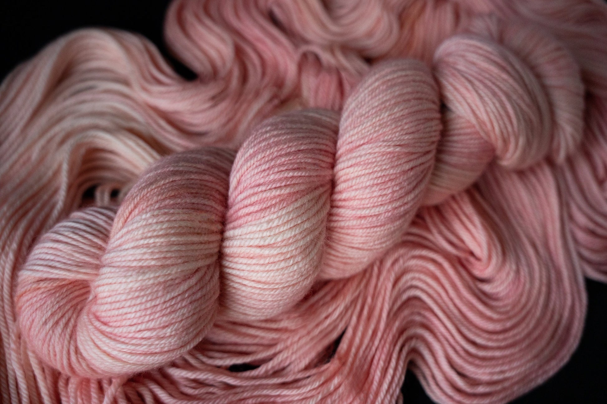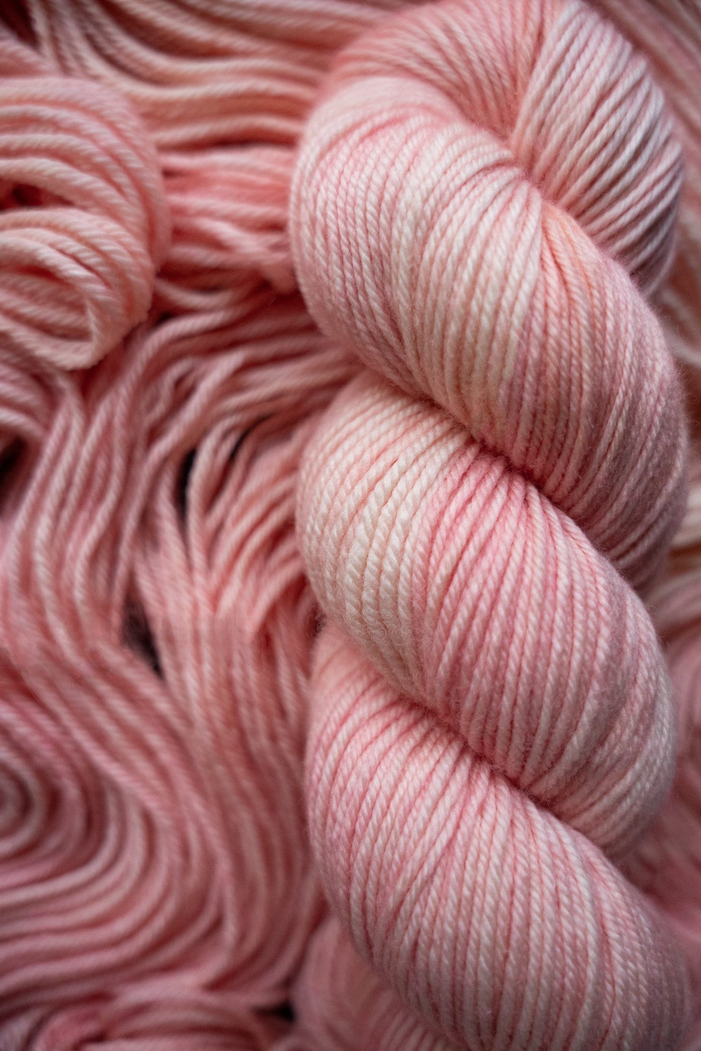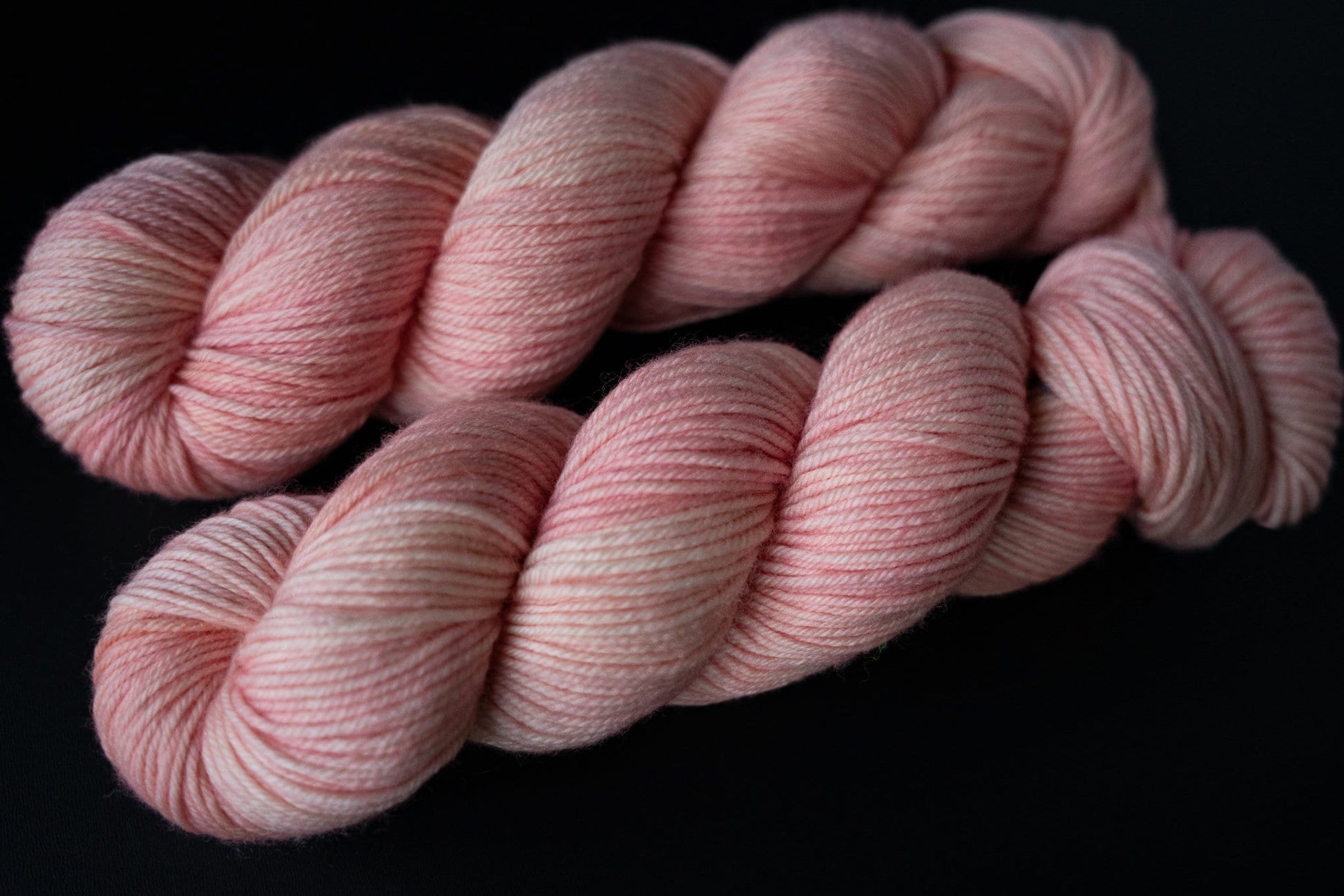 Primrose was created to pair with Rhodonite and Stromatolite. It is similar in color to Aura, but Aura is more of a true bubblegum pink whereas Primrose has some peach tones. Please note that depending on your device or monitor settings colors may appear slightly different than they are in person. Color also varies slightly by base, as the dye absorbs differently on different fiber content.