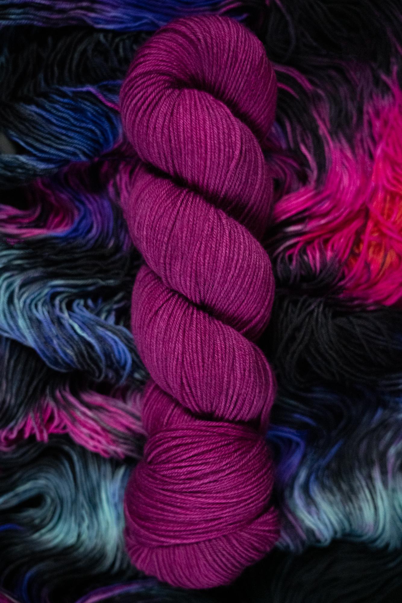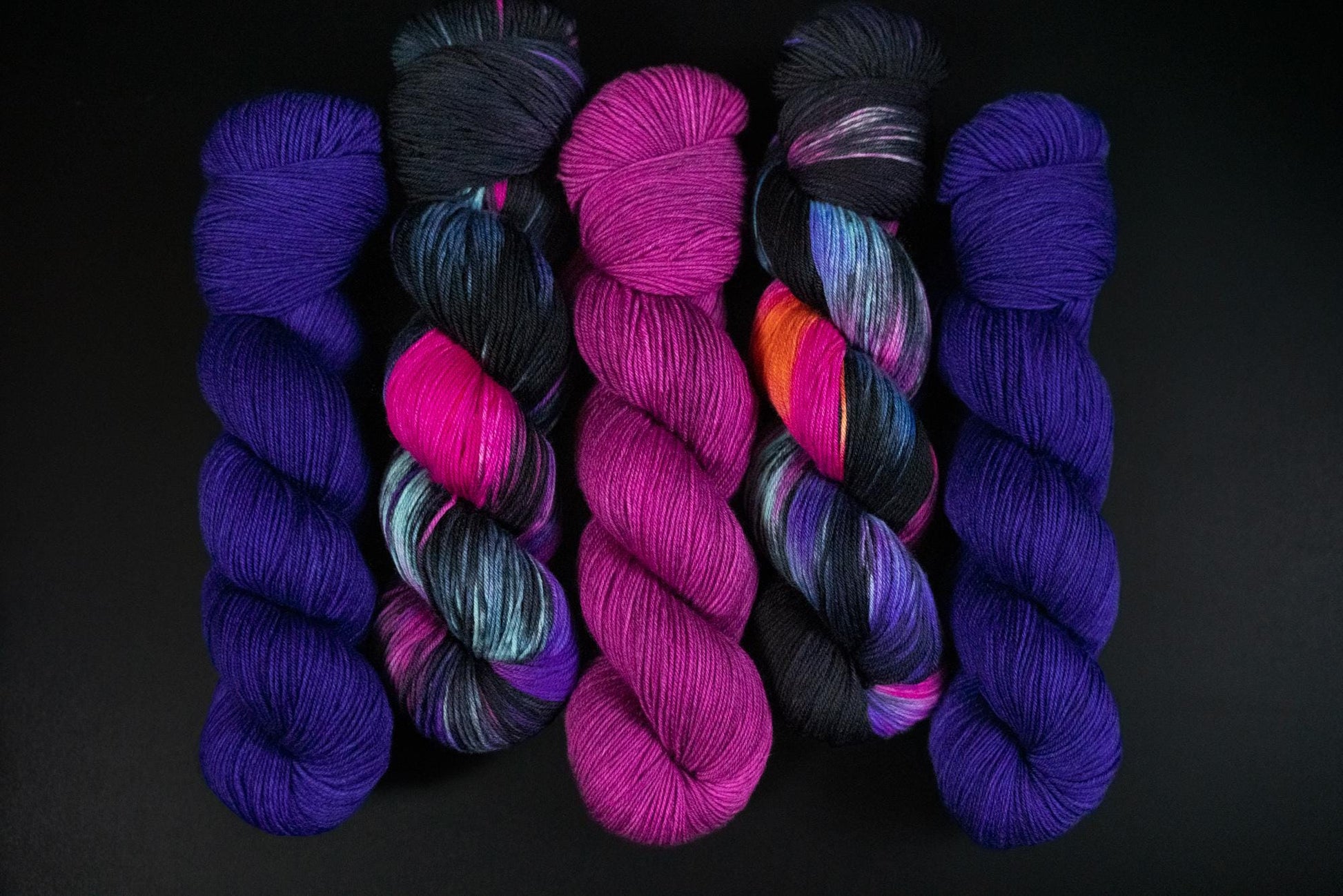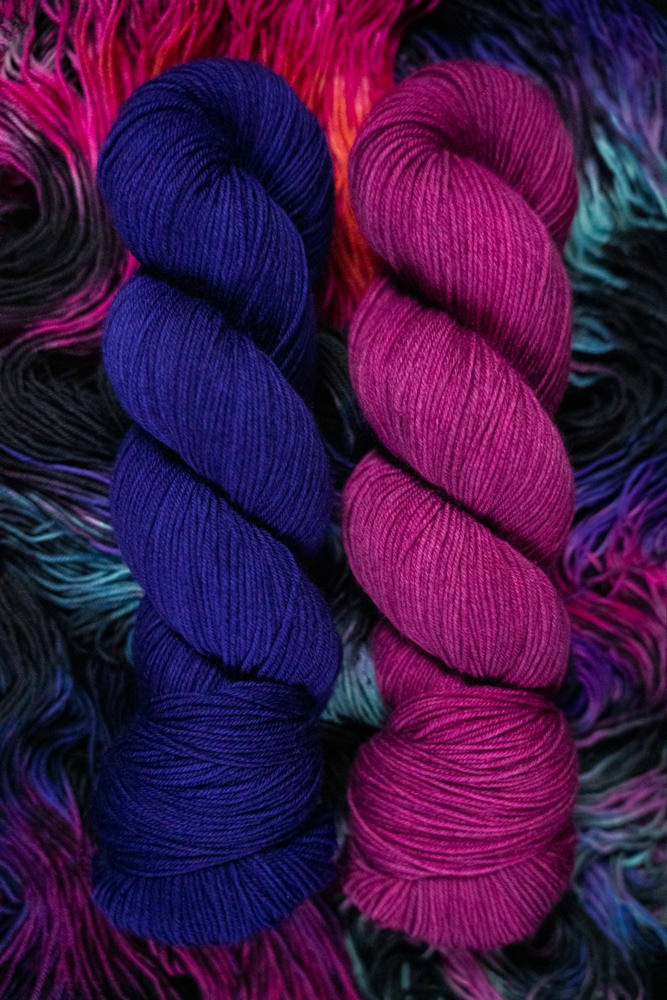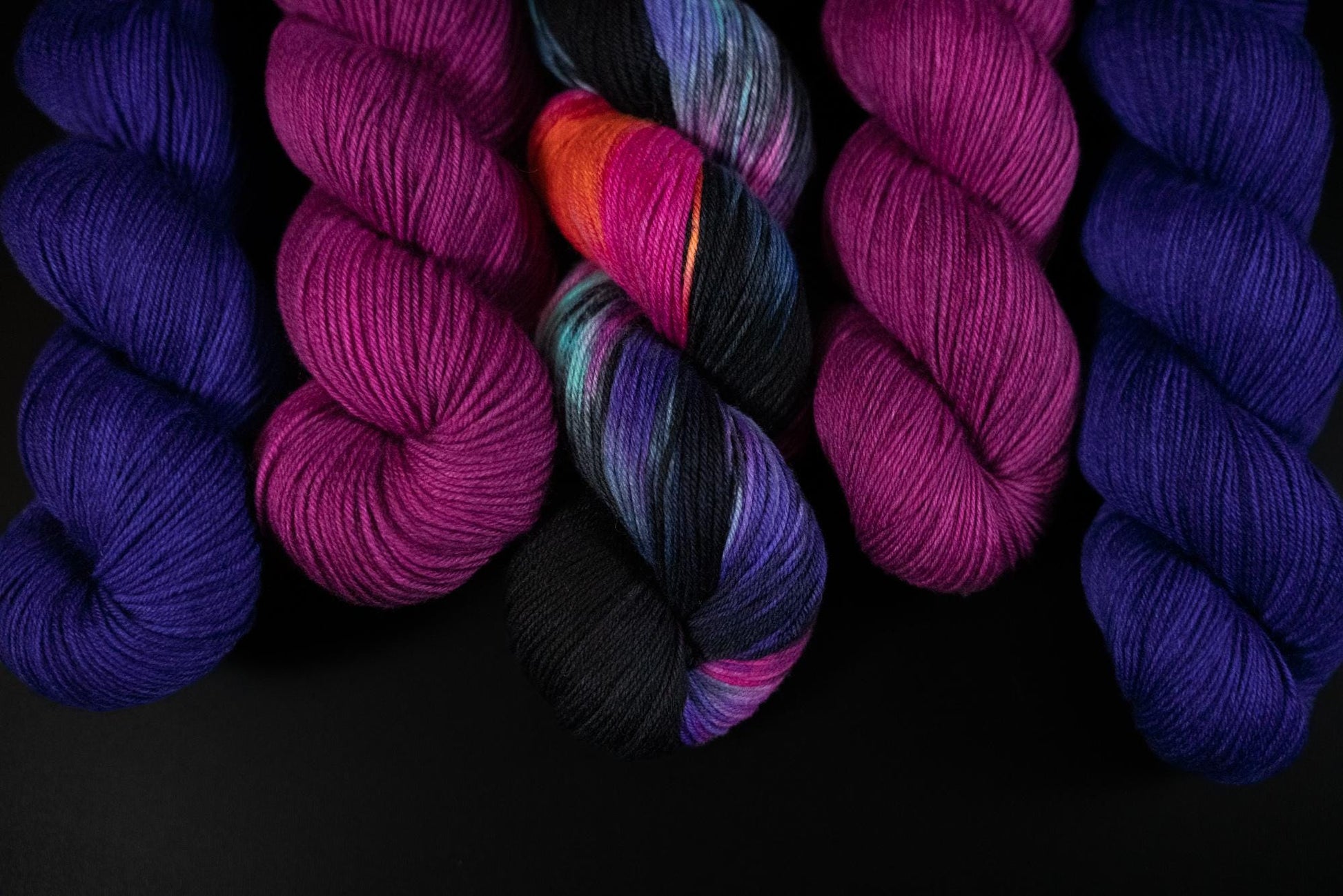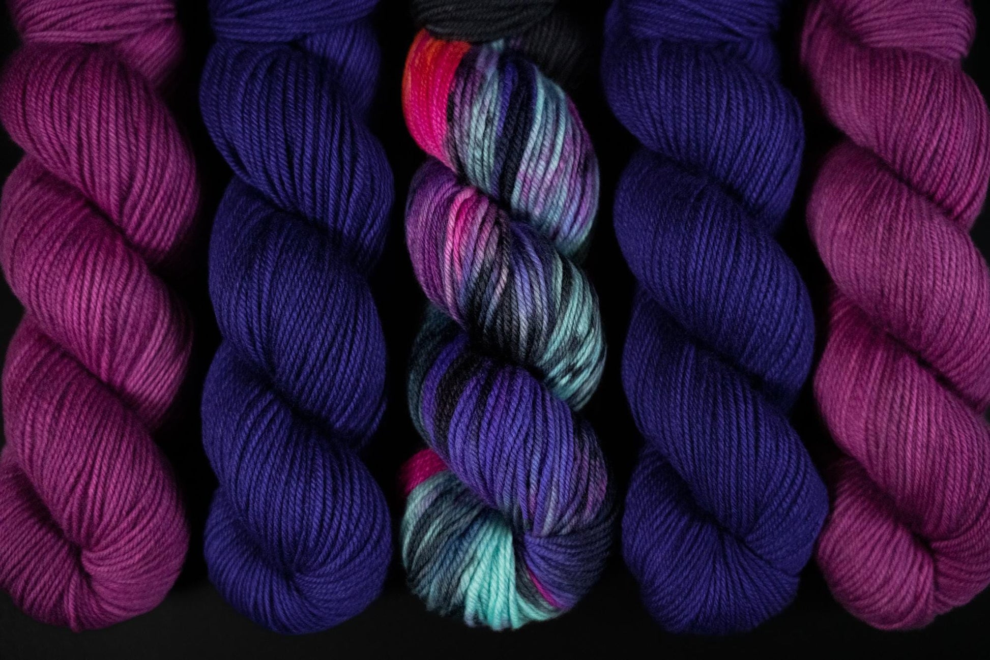 The other two colorways shown in these photos are Arachne (variegated) and Mystic (blue leaning purple). They were created as a set for the full moon in December 2024