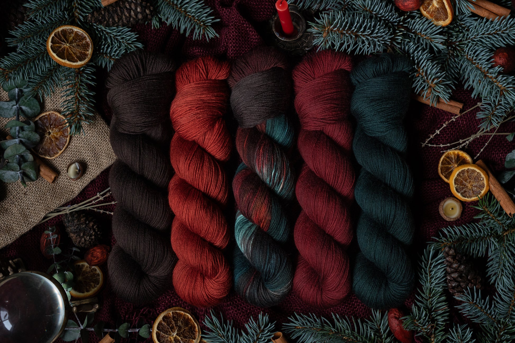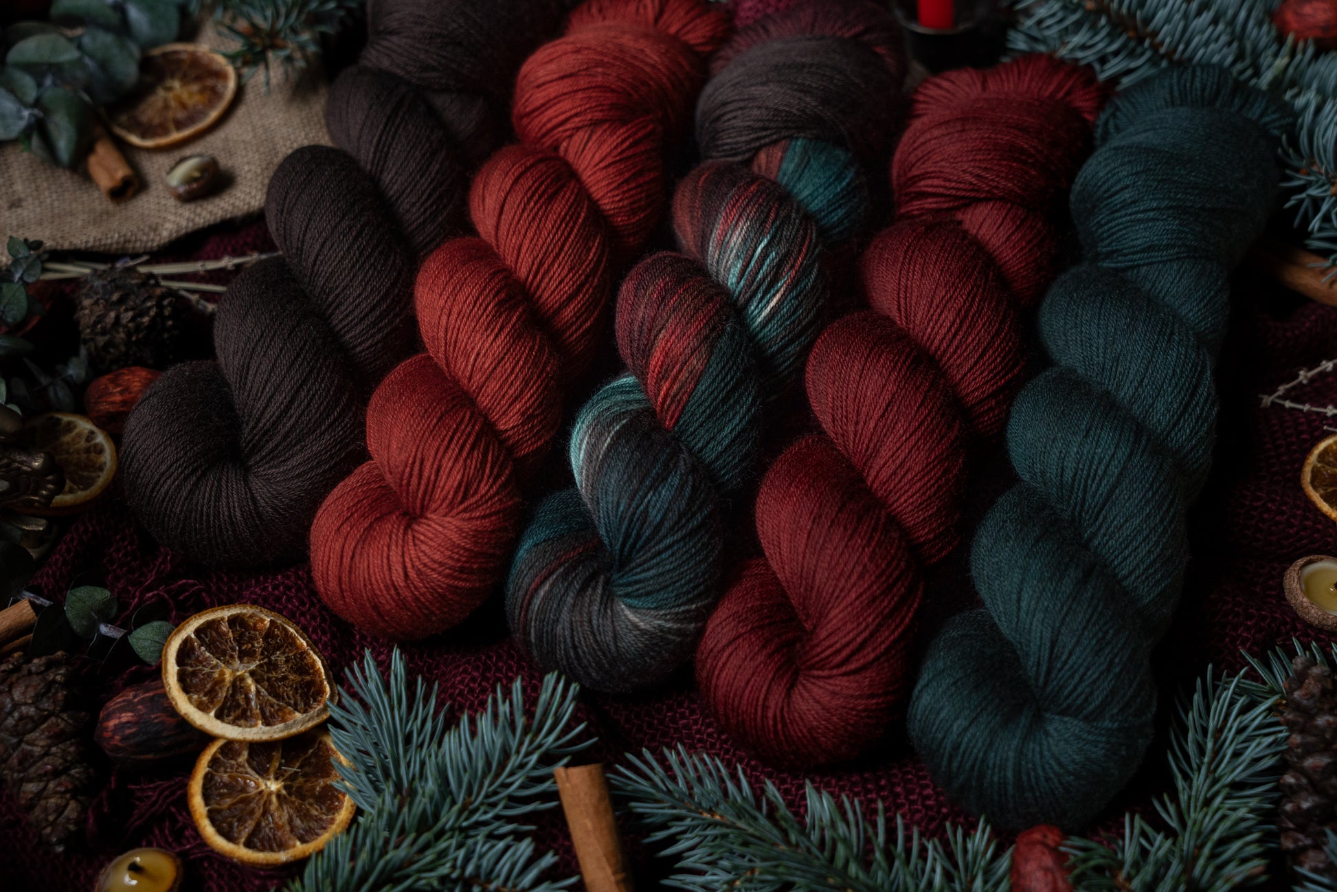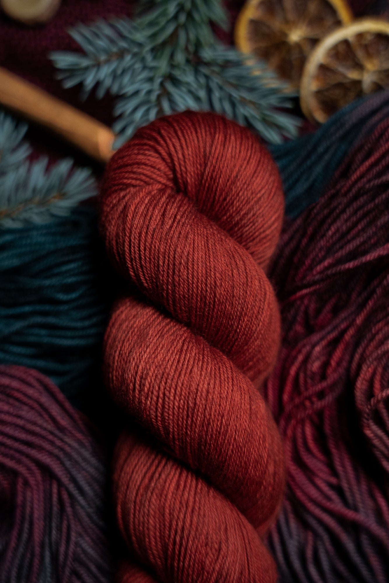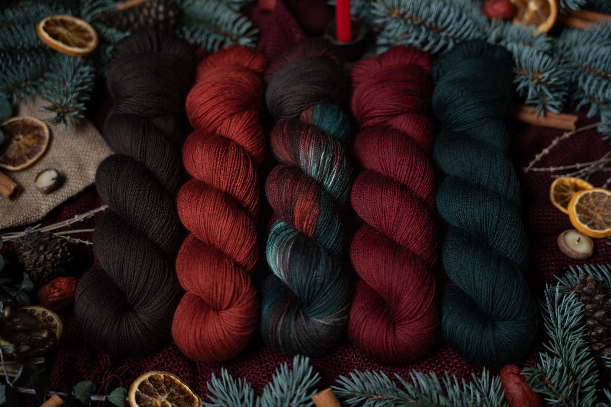 Jólgeitr is the orange colored semi-solid in The Jól Collection. This collection was designed for the Cold Moon of December 2025. The other four colorways in this collection shown in the images are Eik (brown), Mistilteinn (red), Einir (blue-green) and Jól (variegated).