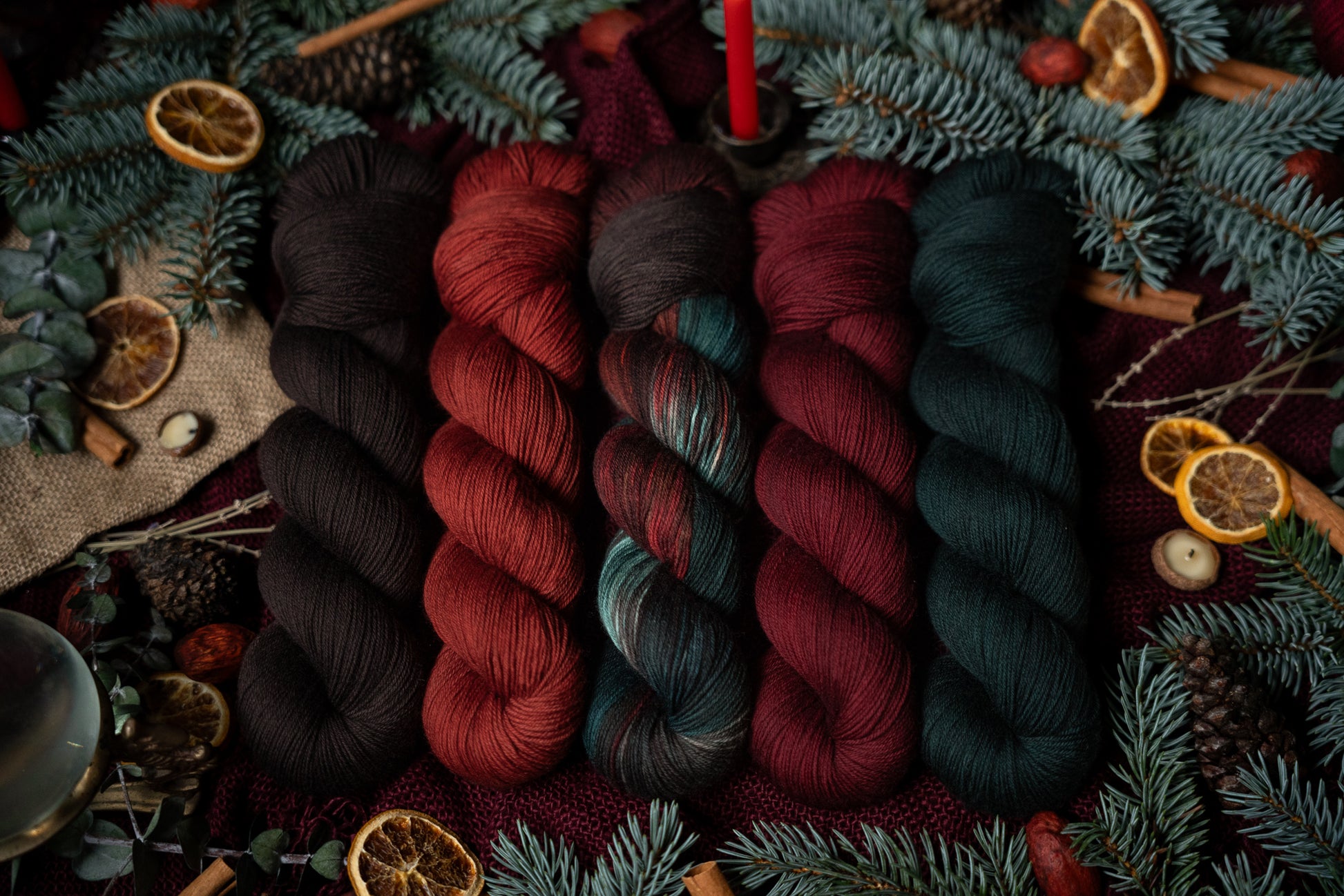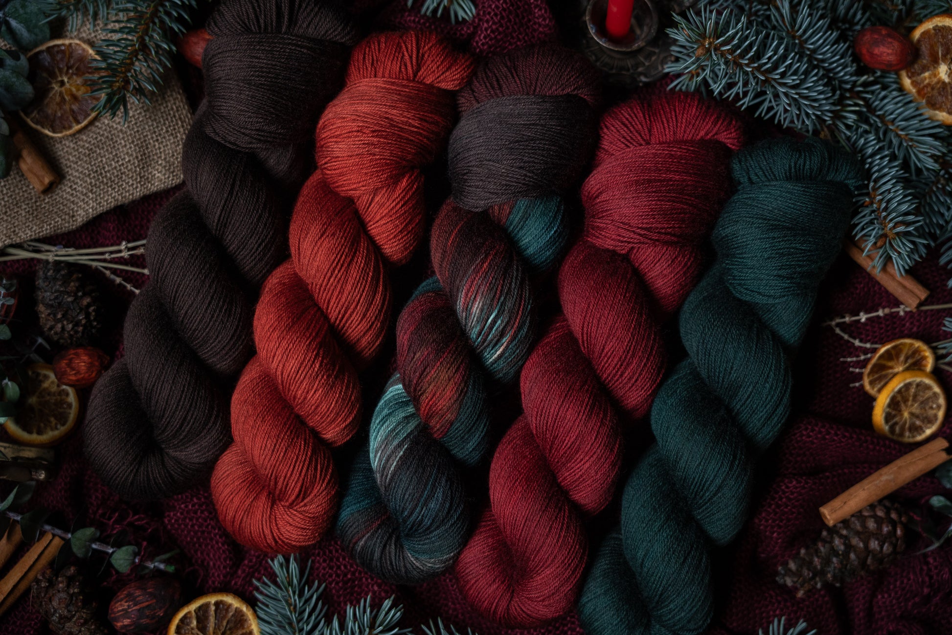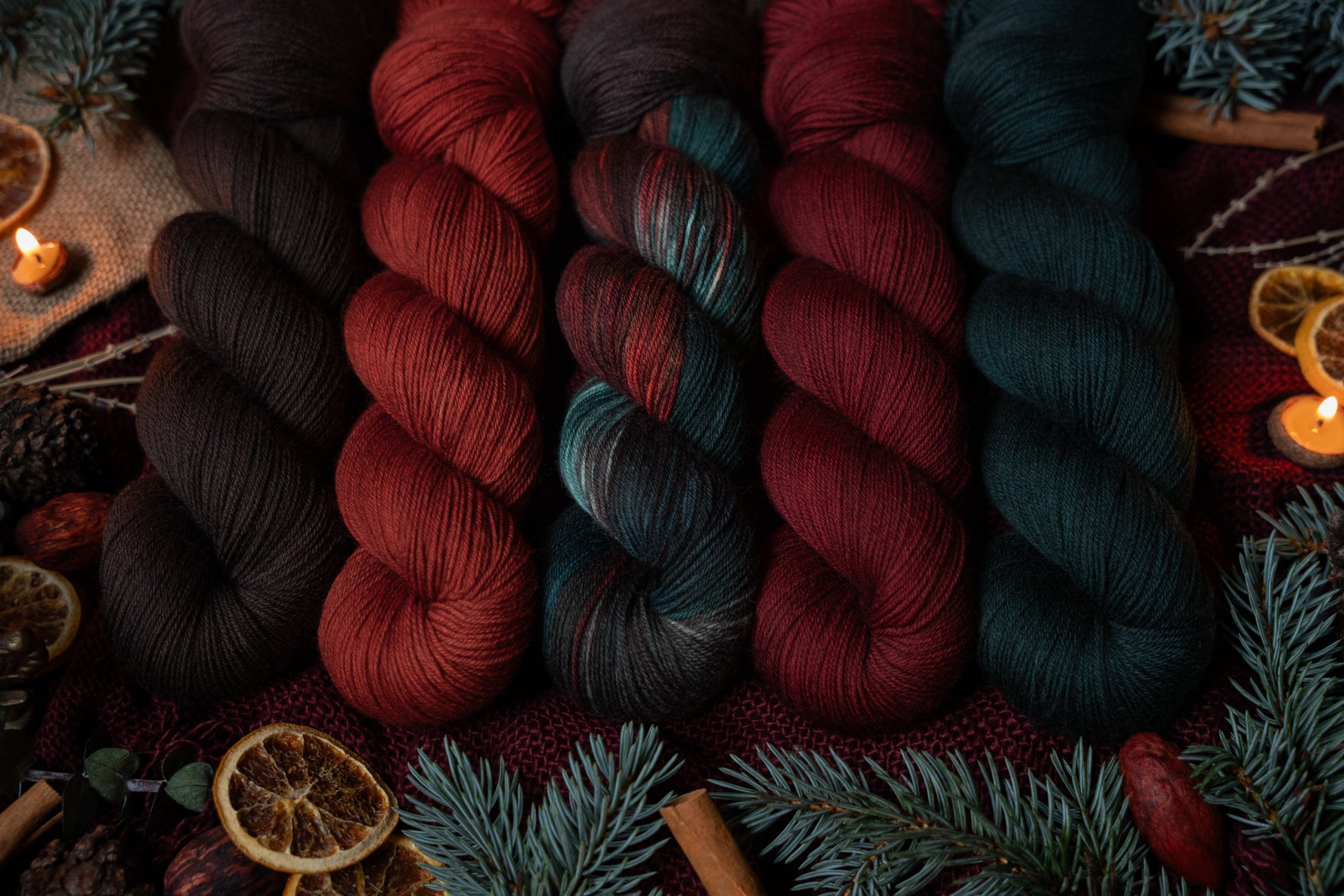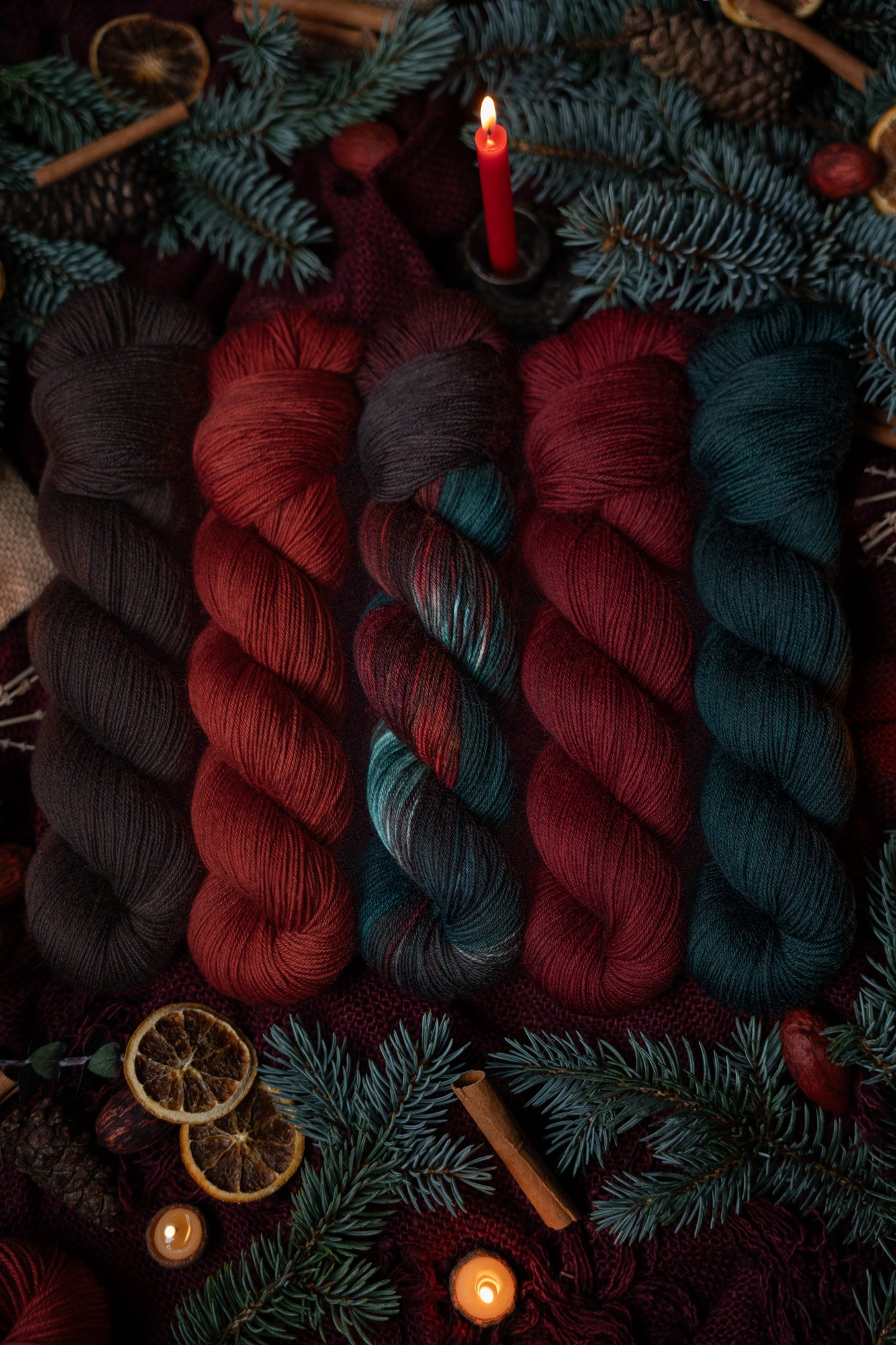 Jólgeitr is the orange colored semi-solid in The Jól Collection. This collection was designed for the Cold Moon of December 2025. The other four colorways in this collection shown in the images are Eik (brown), Mistilteinn (red), Einir (blue-green) and Jól (variegated).