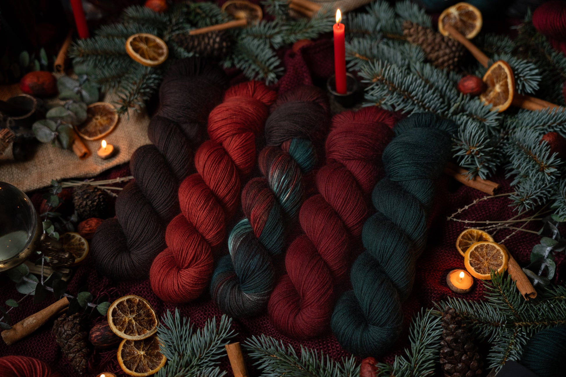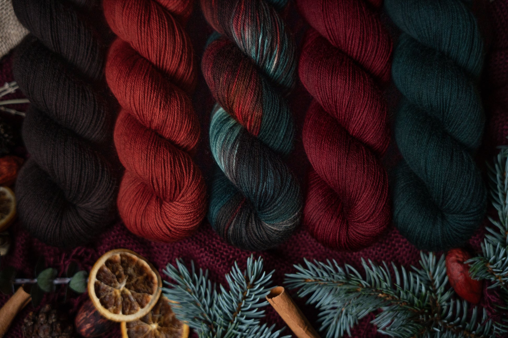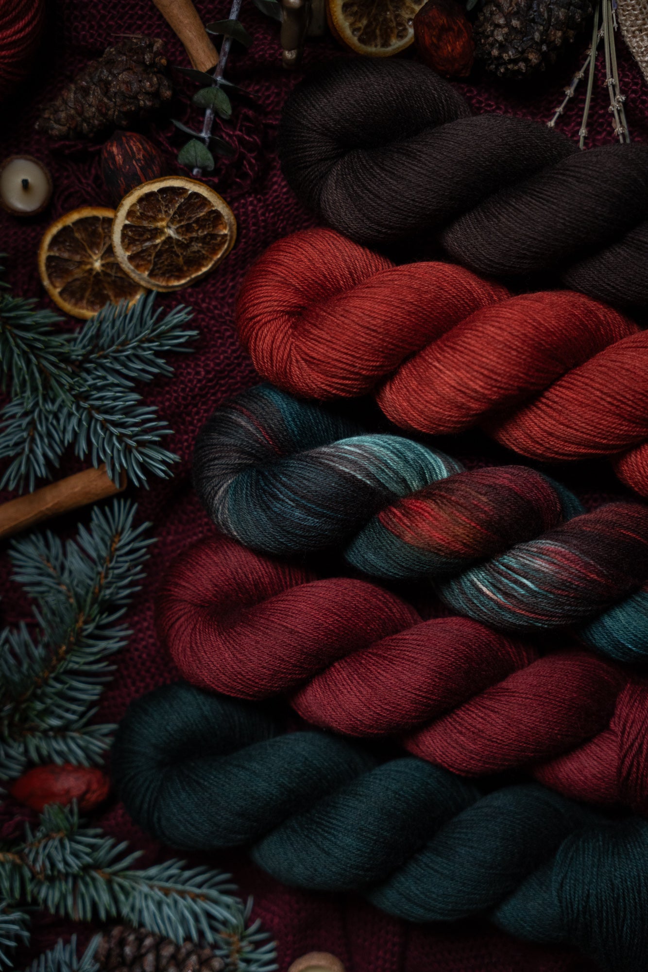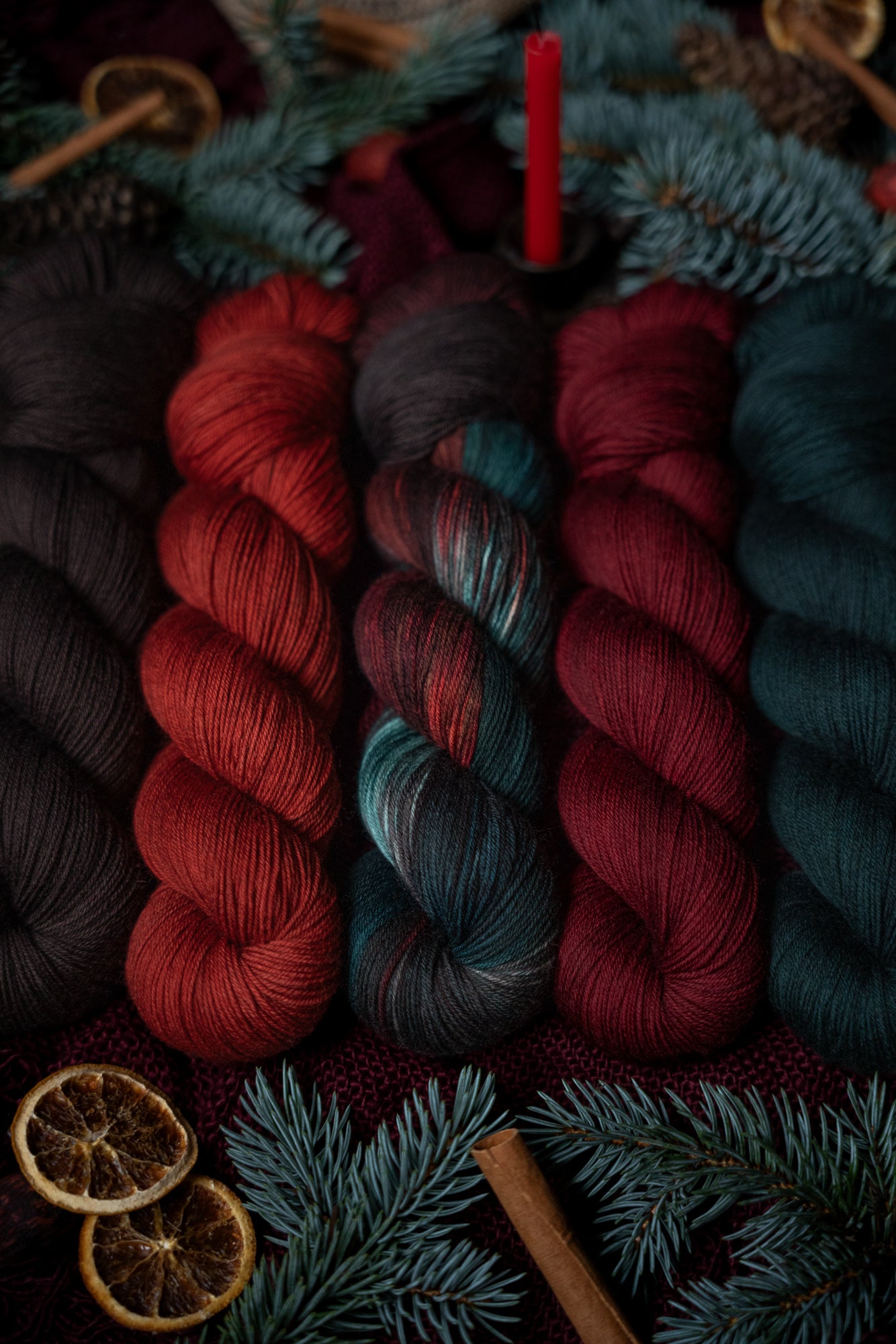 Jólgeitr is the orange colored semi-solid in The Jól Collection. This collection was designed for the Cold Moon of December 2025. The other four colorways in this collection shown in the images are Eik (brown), Mistilteinn (red), Einir (blue-green) and Jól (variegated).