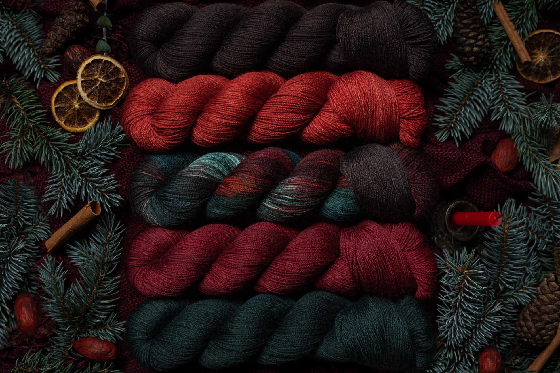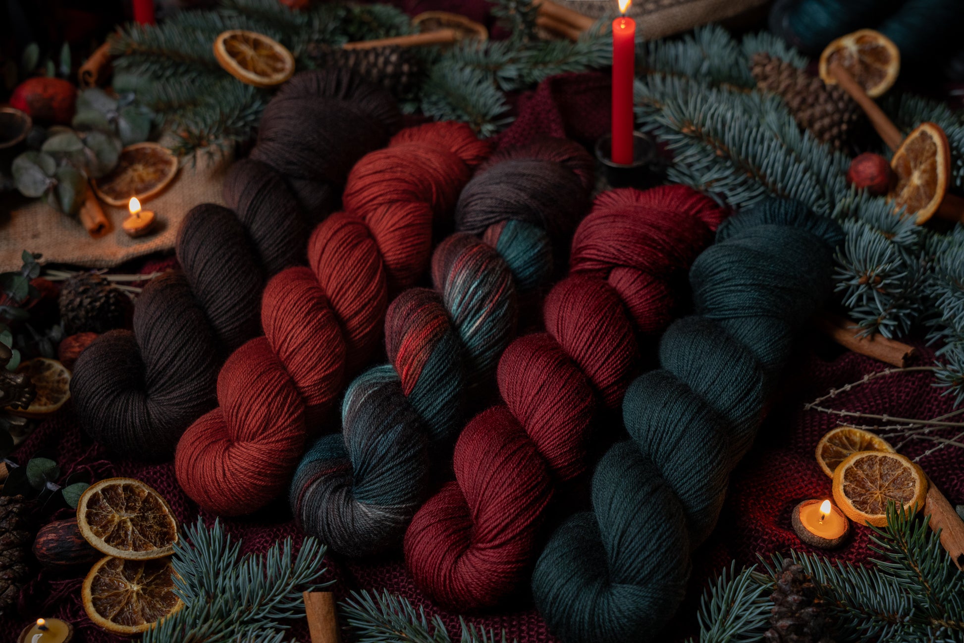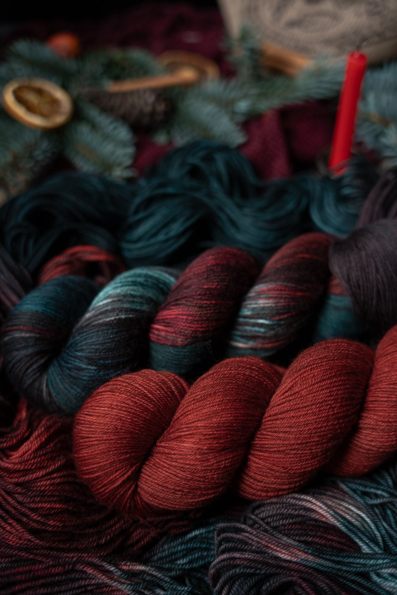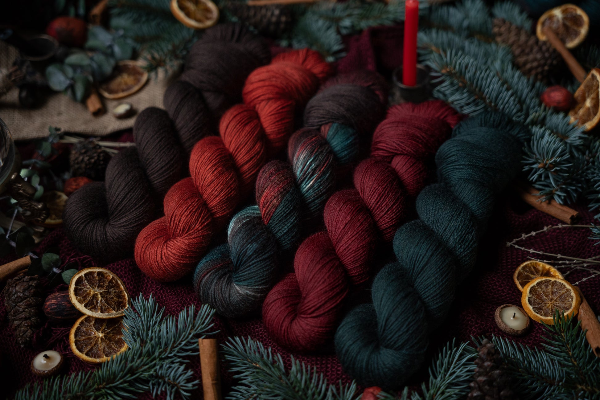 Jólgeitr is the orange colored semi-solid in The Jól Collection. This collection was designed for the Cold Moon of December 2025. The other four colorways in this collection shown in the images are Eik (brown), Mistilteinn (red), Einir (blue-green) and Jól (variegated).
