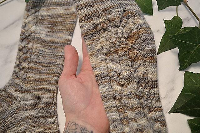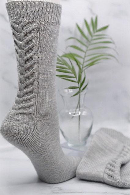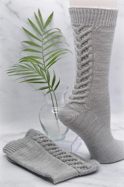 Finding Savannah is worked in the round from the toe up using a seamless cast on, no gusset shaping, and a short row heel. Due to the pattern not lending itself to a lot of stretch, strategic increases are added to give these socks a comfortable fit along with a refined style.