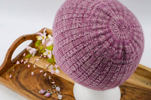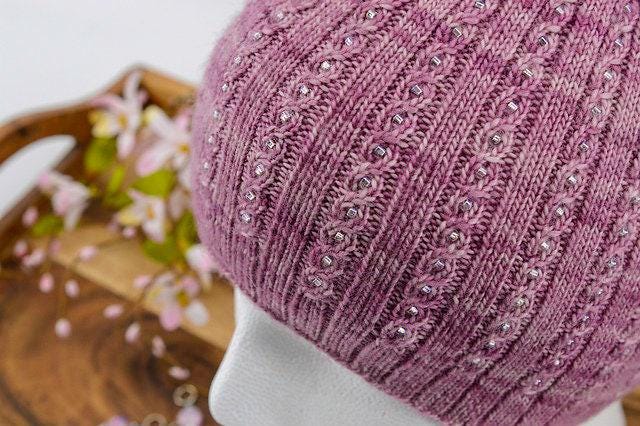 LA Lady hat is knit from the bottom up with pre-stranded beads that are added to the project as you go. While the pattern is overall fairly simple, the beads offer a nice change of pace while knitting and keep things interesting. A light blocking is recommended to make your beads really pop and shine through the cables.