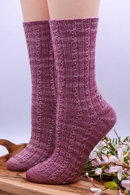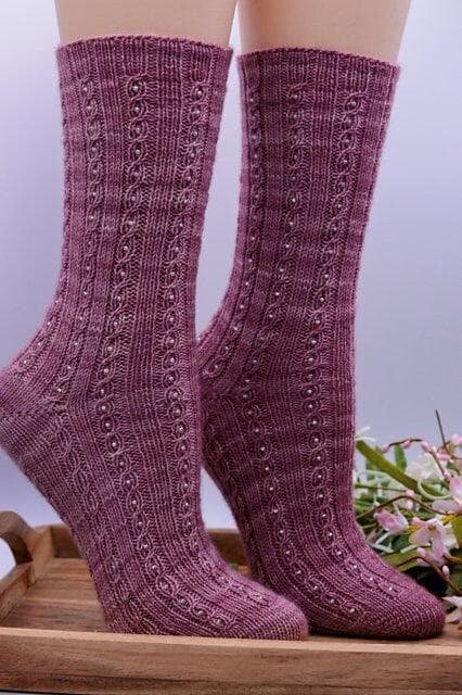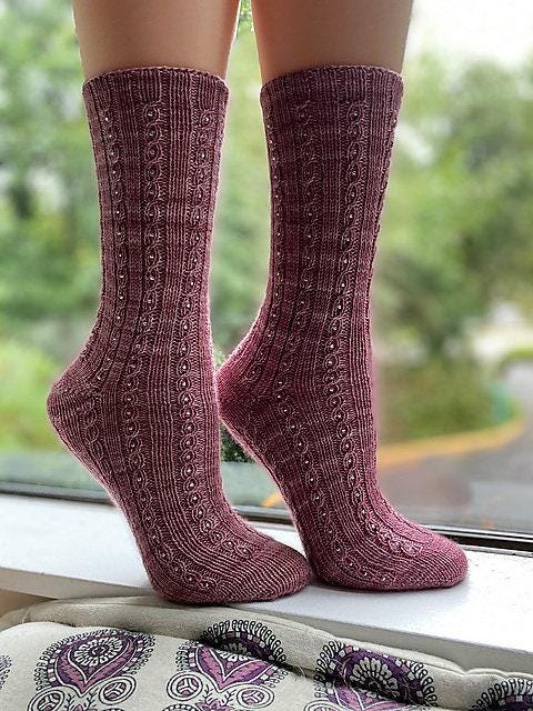 LA Lady socks are knit toe up in the round using a seamless cast on, no gusset shaping, and a short row heel. While the pattern is overall fairly simple, the beads offer a nice change of pace while knitting and keep things interesting. A light blocking is recommended to make your beads really pop and shine through the cables.