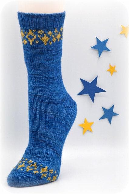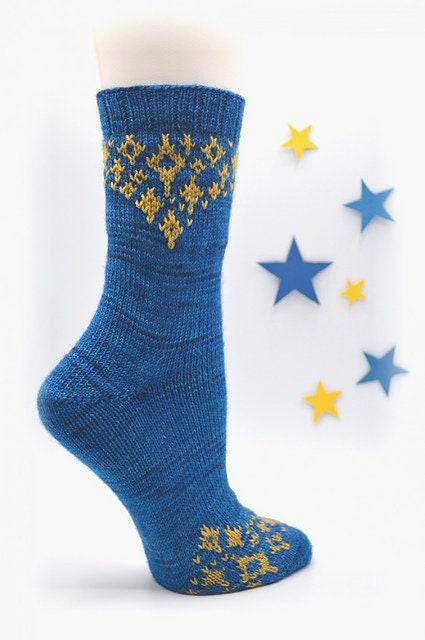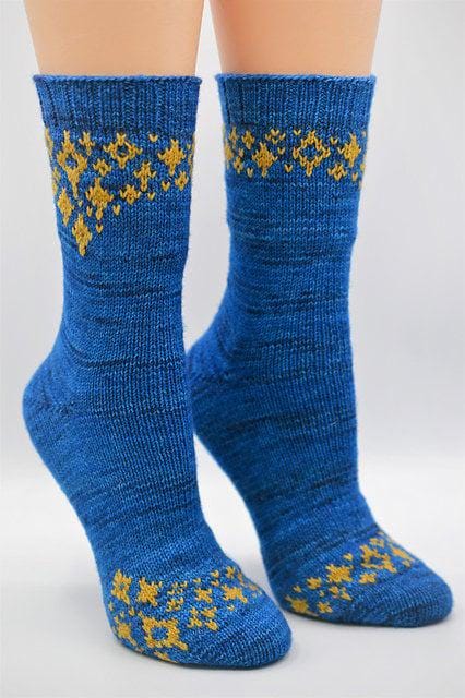 Twinkle Toes Socks are knit from the toe up with no gusset shaping and a short row heel. This pattern introduces an optional technique for stretchy colorwork, which makes carrying floats nearly invisible.