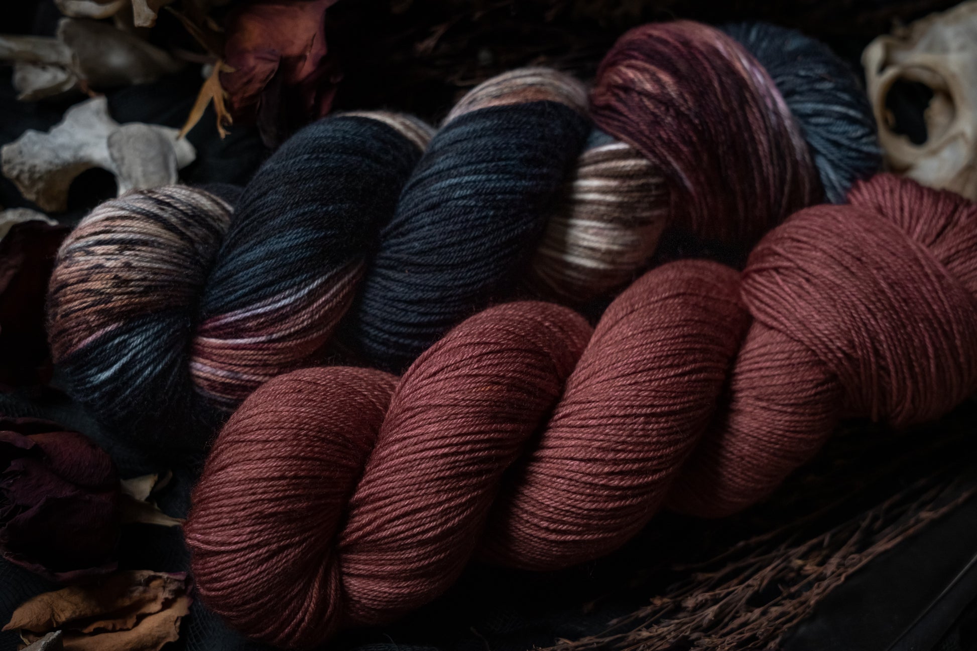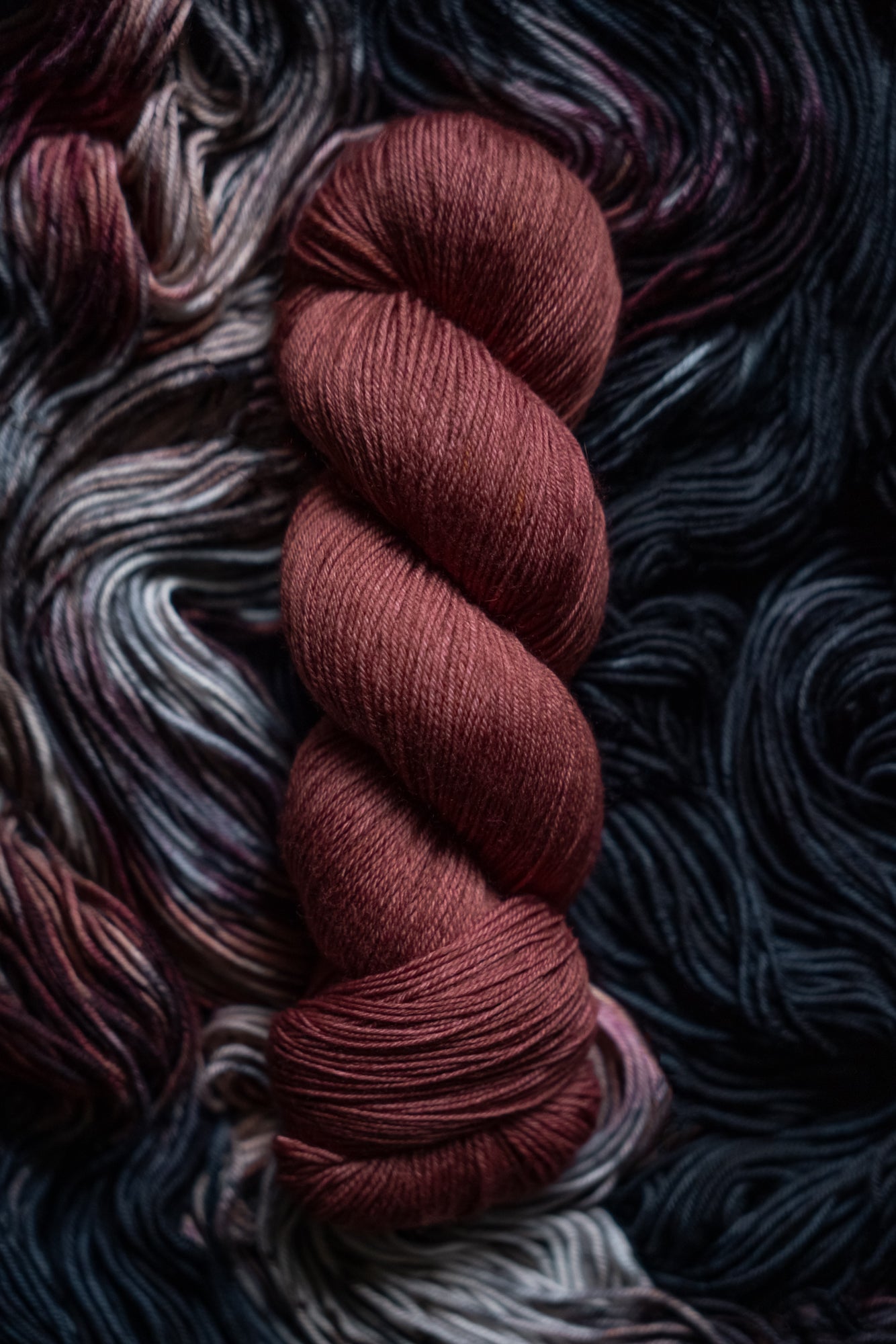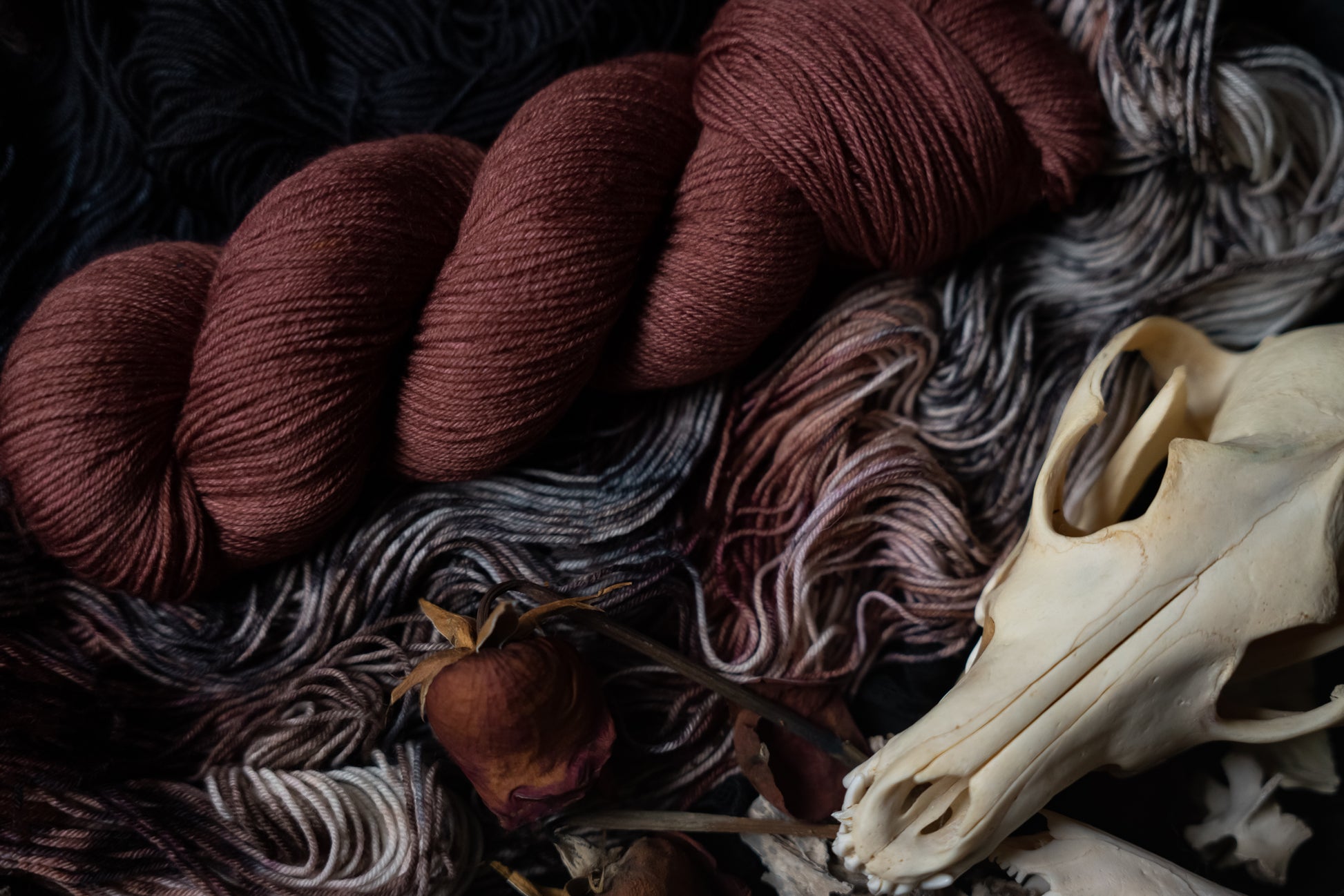 Elegy is the rust colored semi-solid in the Decay Collection. This collection was designed for the Frost Moon of November 2025. All skeins will be dyed with moon water from the November Frost Moon. The other four colorways in this collection shown in the images are Decay (vareigated), Ossuary (bone), Ash (lighter blue-grey) and Remnant (darker blue-grey).