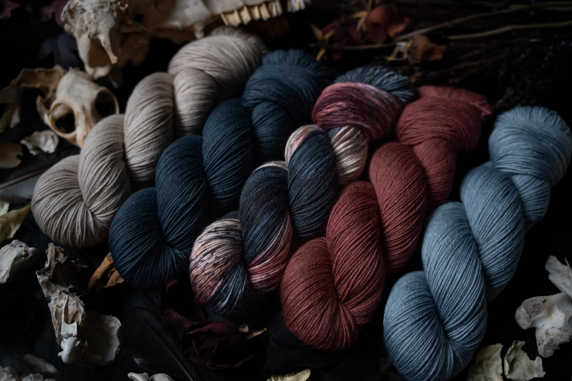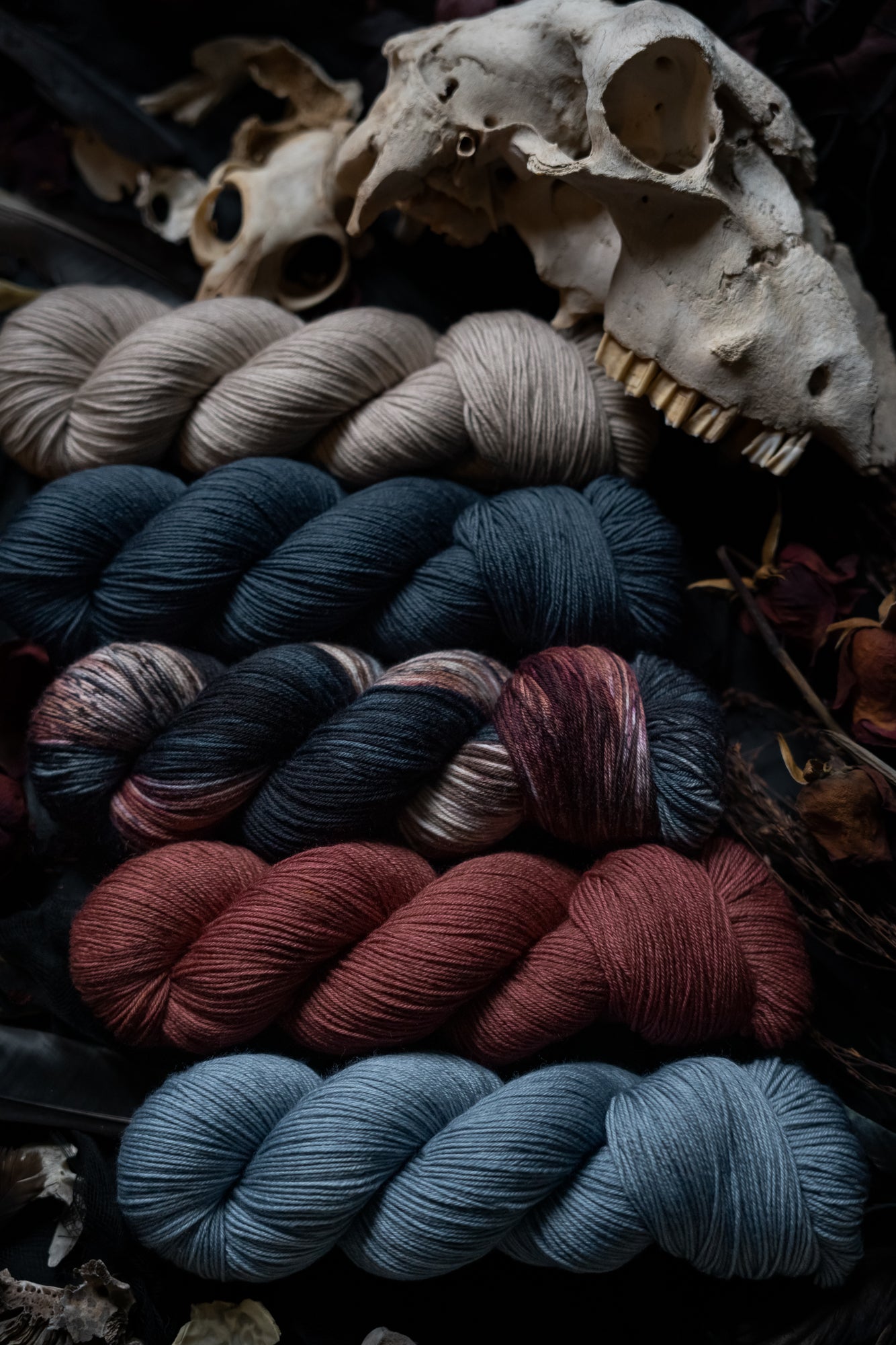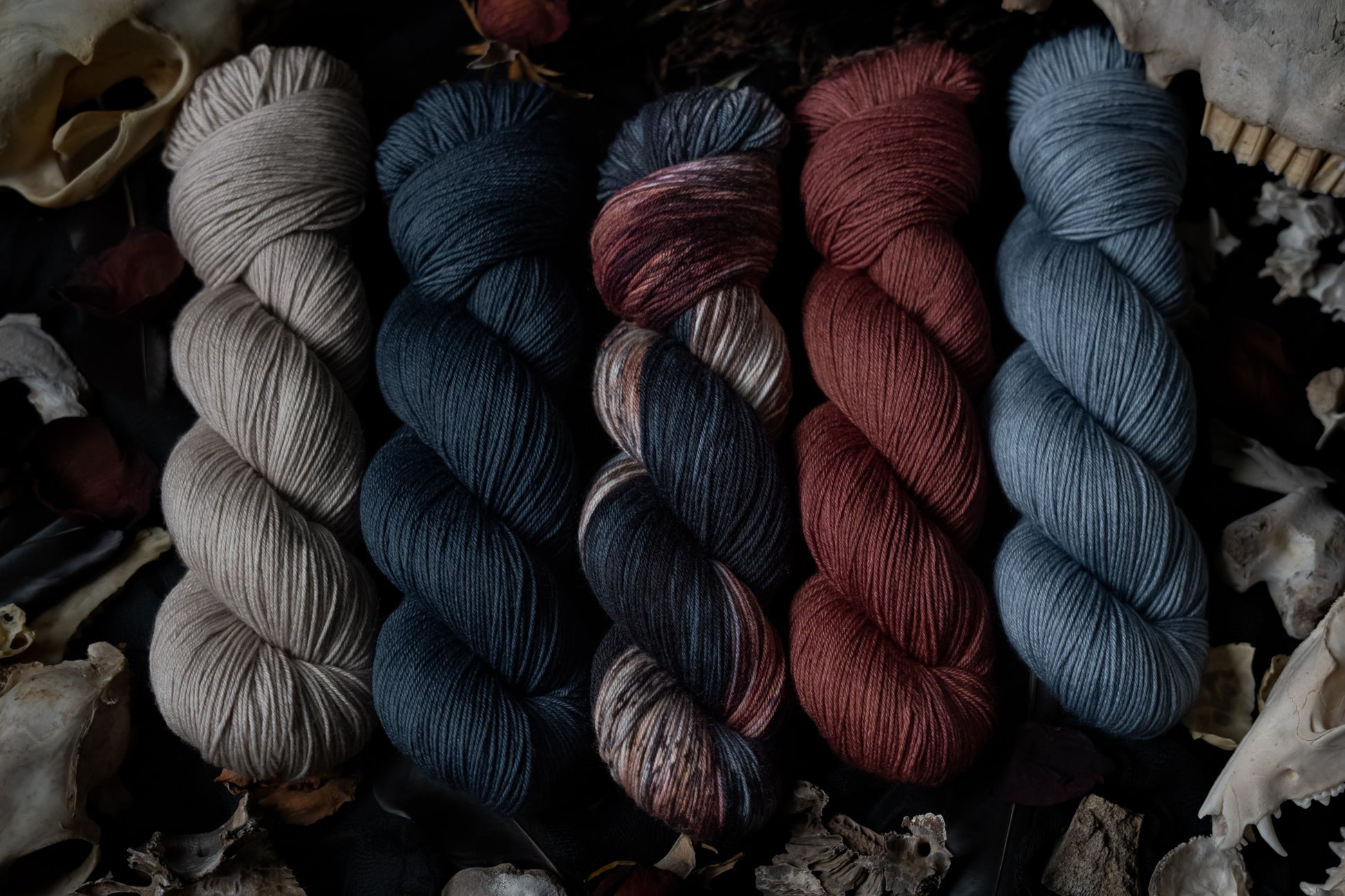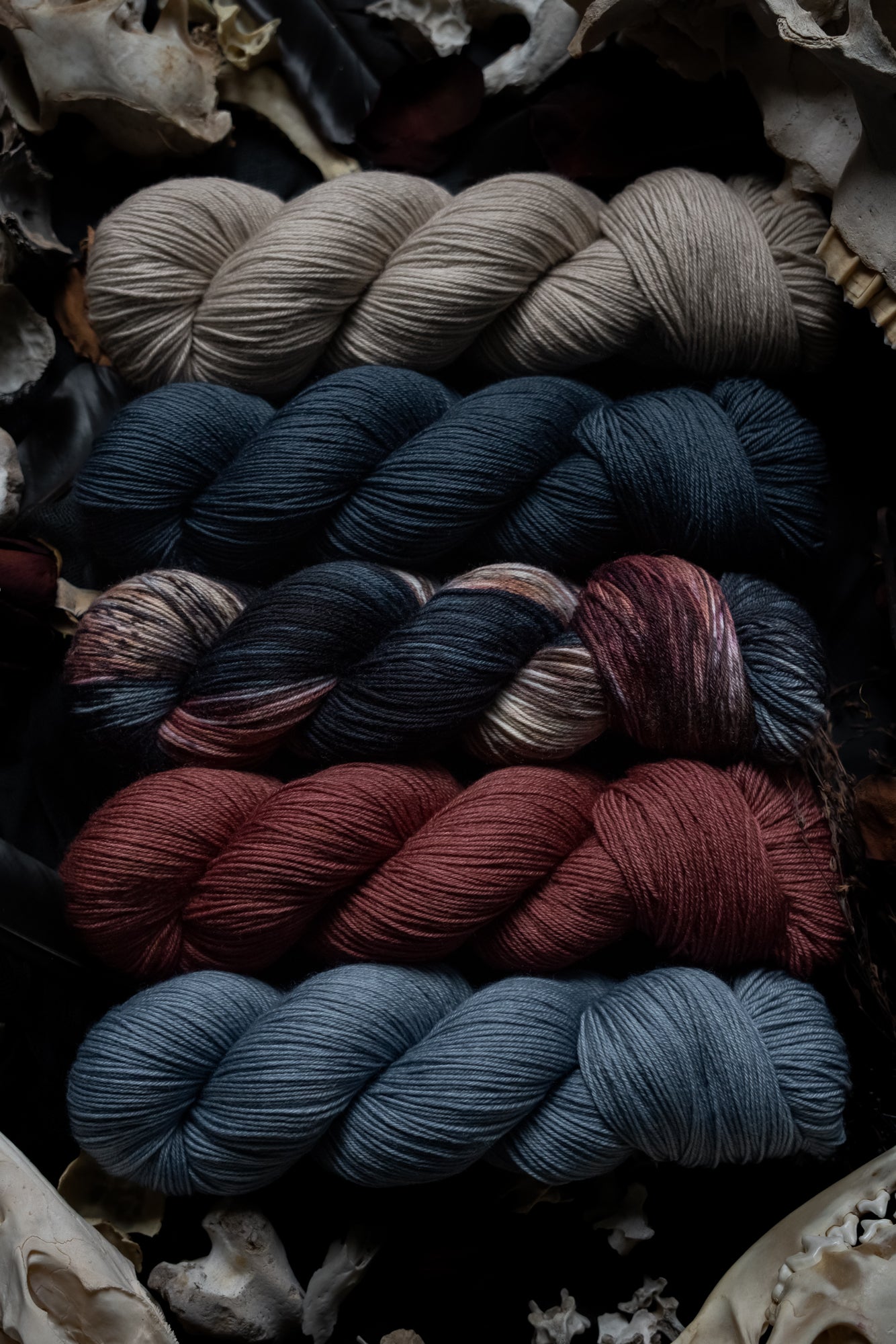 Elegy is the rust colored semi-solid in the Decay Collection. This collection was designed for the Frost Moon of November 2025. All skeins will be dyed with moon water from the November Frost Moon. The other four colorways in this collection shown in the images are Decay (vareigated), Ossuary (bone), Ash (lighter blue-grey) and Remnant (darker blue-grey).