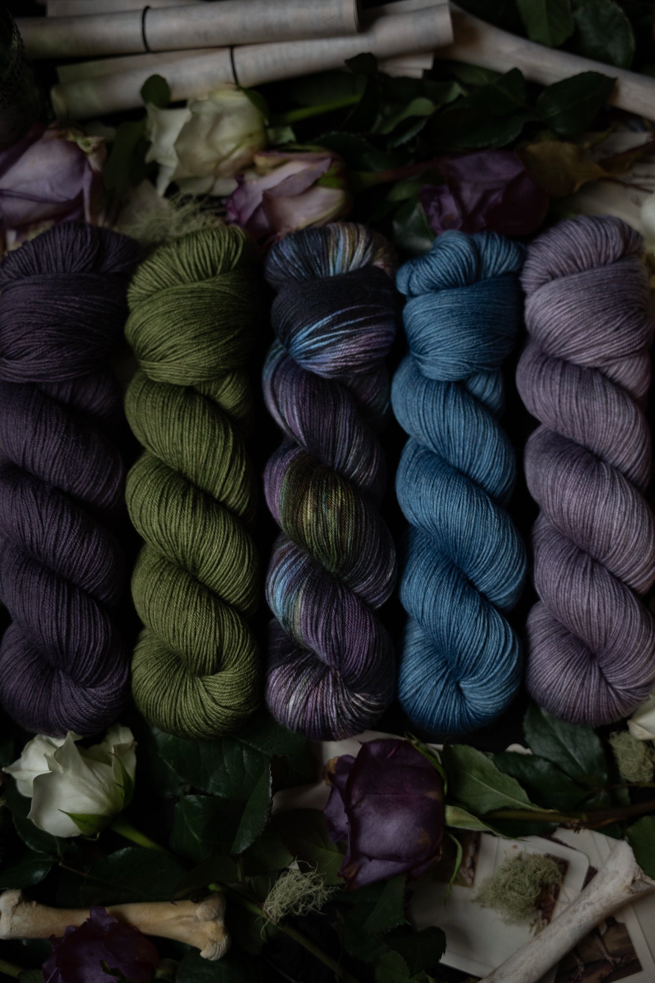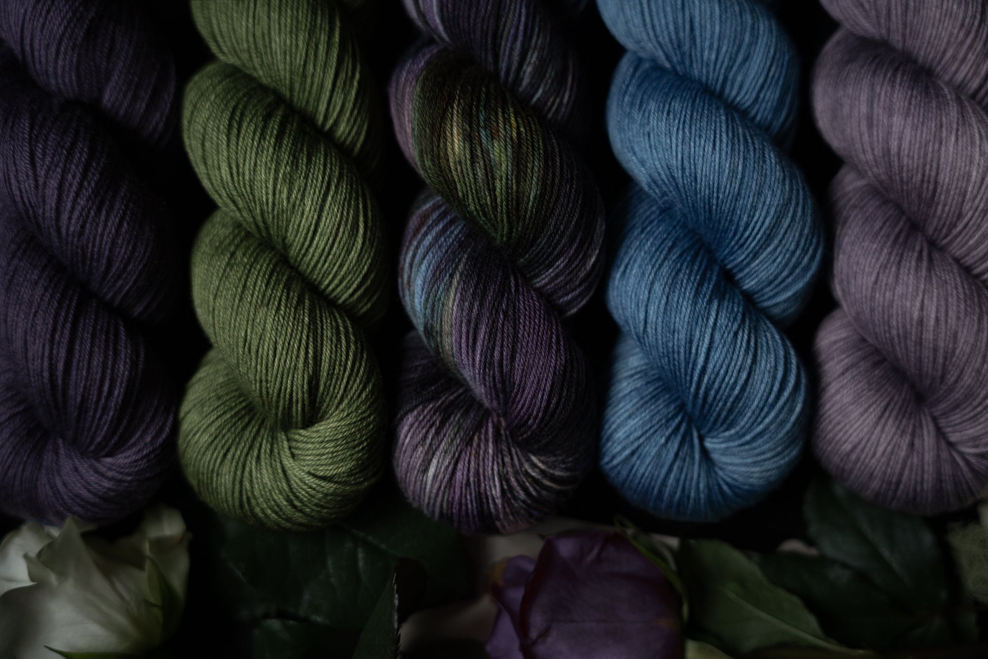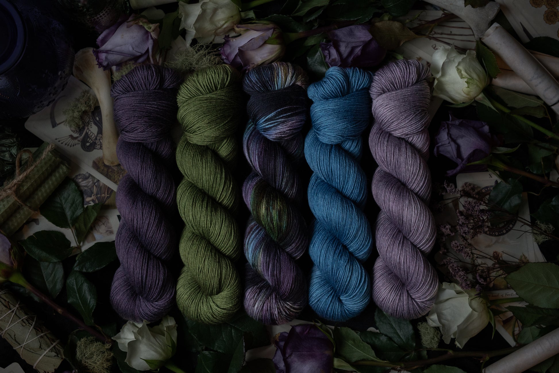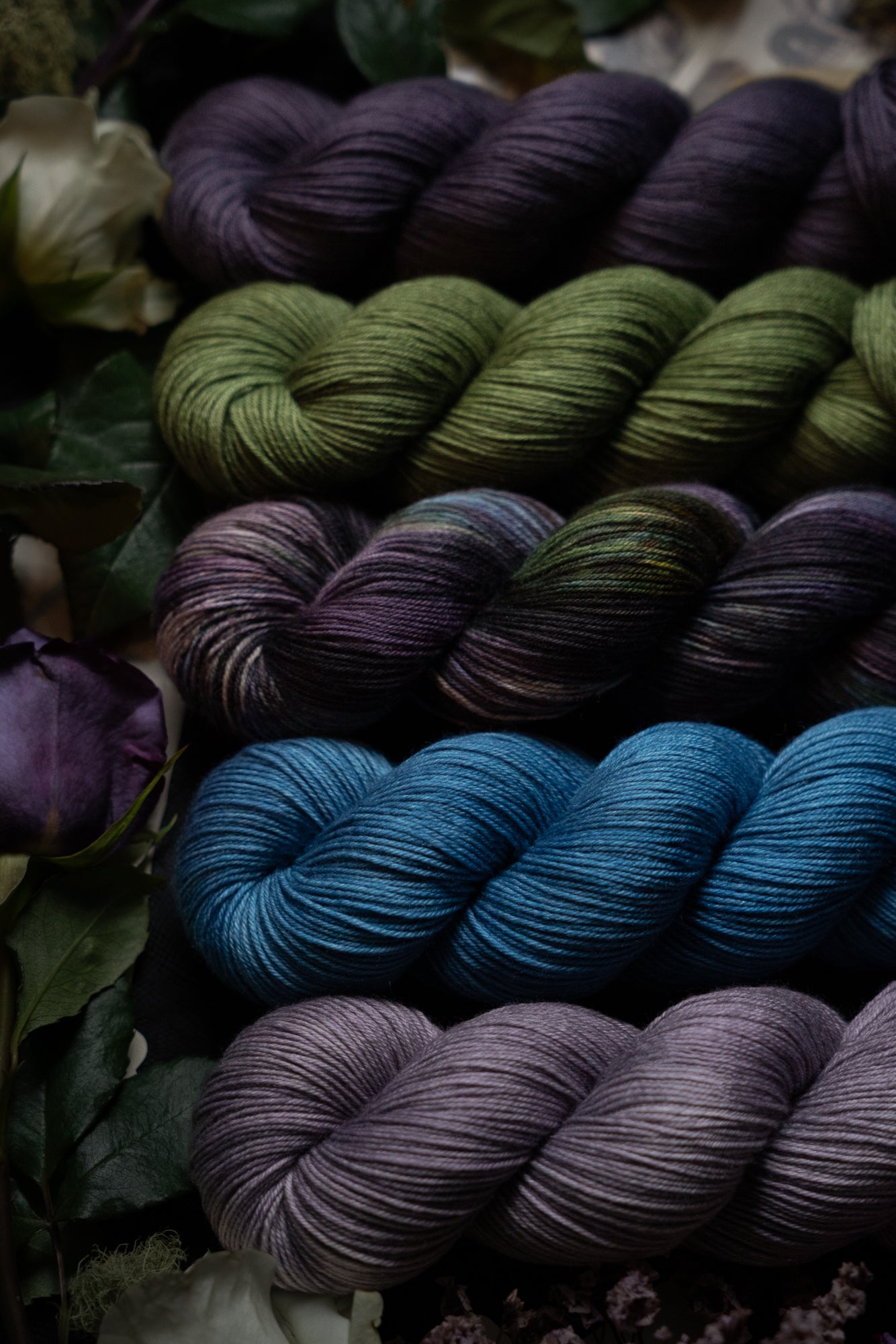 Renewal is the variegated skein in the Where Flowers Bloom Collection. This collection was designed for the Wolf Moon of January 2026. All skeins will be dyed with moon water from the January Wolf Moon. The other four colorways in this collection shown in the images are Hope (light purple), Defiance (blue), Resilience (dark purple) and Resolve (green).