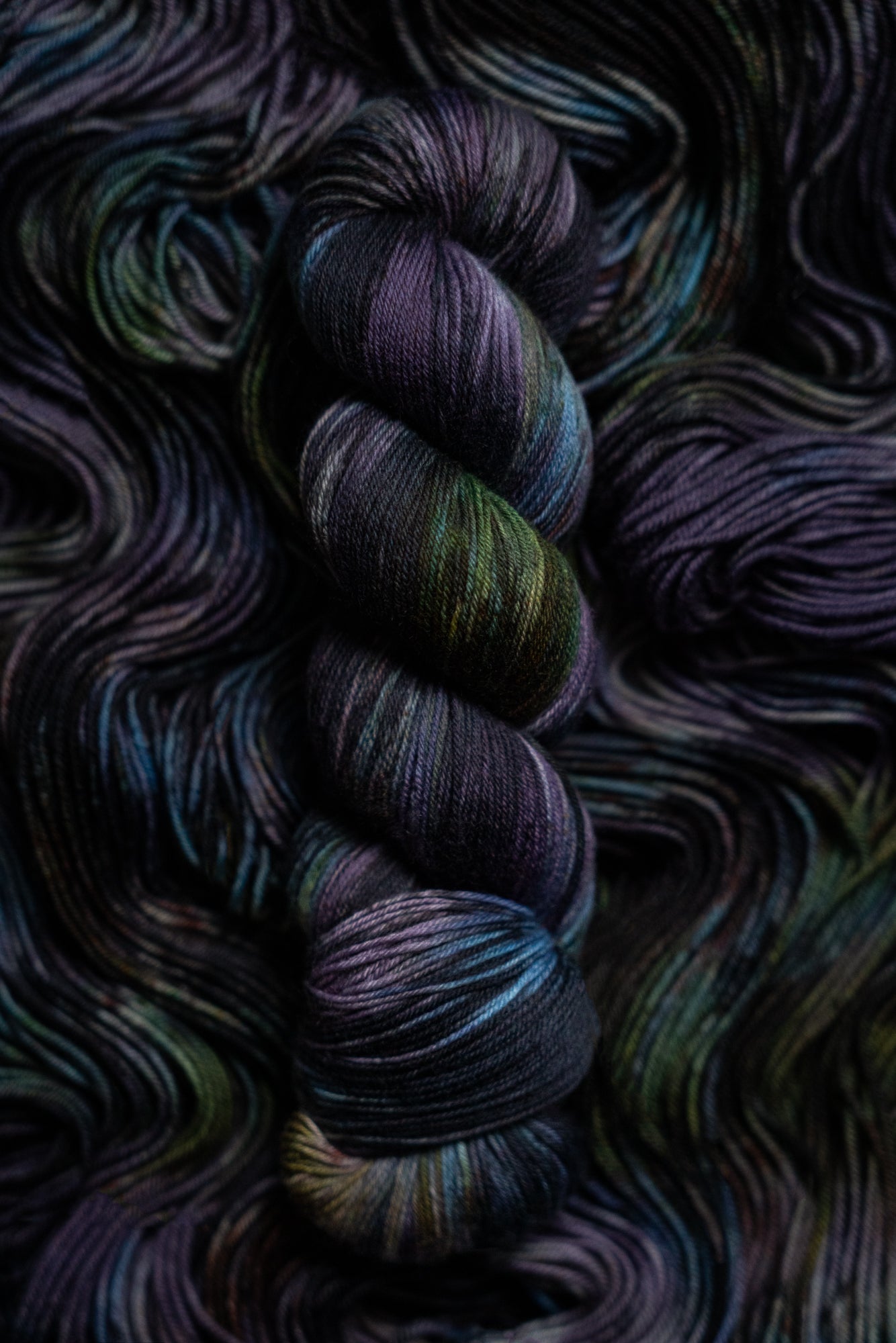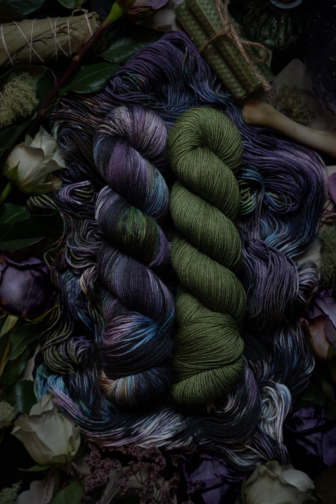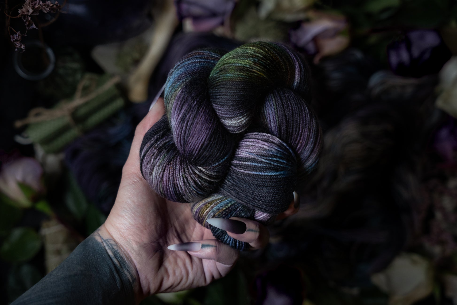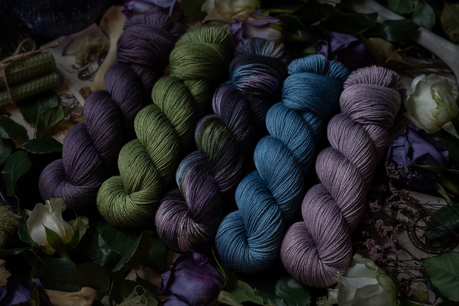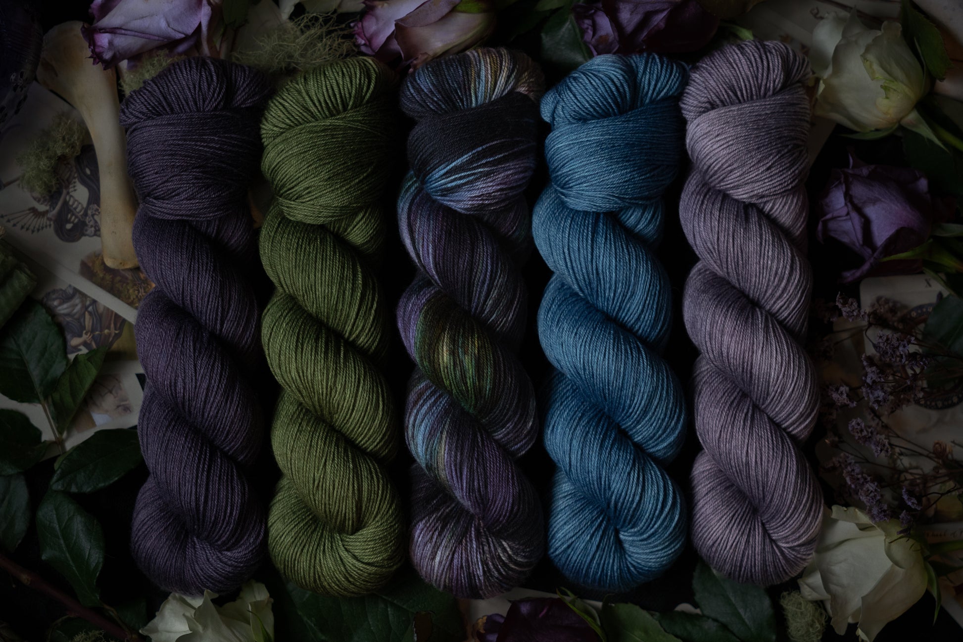 Renewal is the variegated skein in the Where Flowers Bloom Collection. This collection was designed for the Wolf Moon of January 2026. All skeins will be dyed with moon water from the January Wolf Moon. The other four colorways in this collection shown in the images are Hope (light purple), Defiance (blue), Resilience (dark purple) and Resolve (green).