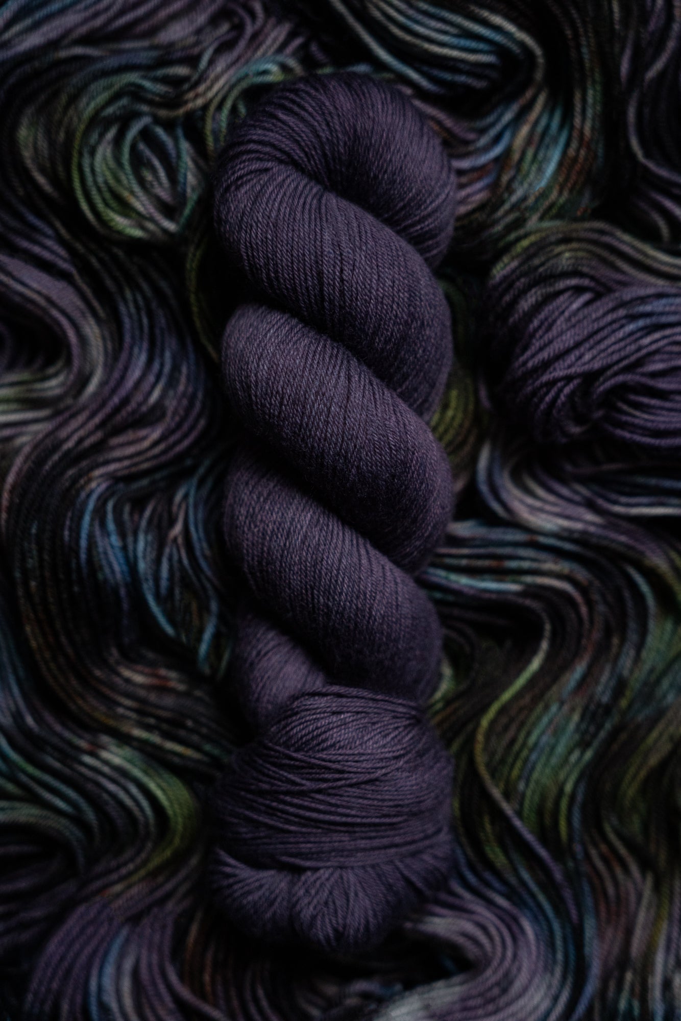 Resilience is the dark purple colored semi-solid in the Where Flowers Bloom Collection. This collection was designed for the Wolf Moon of January 2026. All skeins will be dyed with moon water from the January Wolf Moon. The other four colorways in this collection shown in the images are Renewal (variegated), Defiance (blue), Resolve (green) and Hope (light purple).