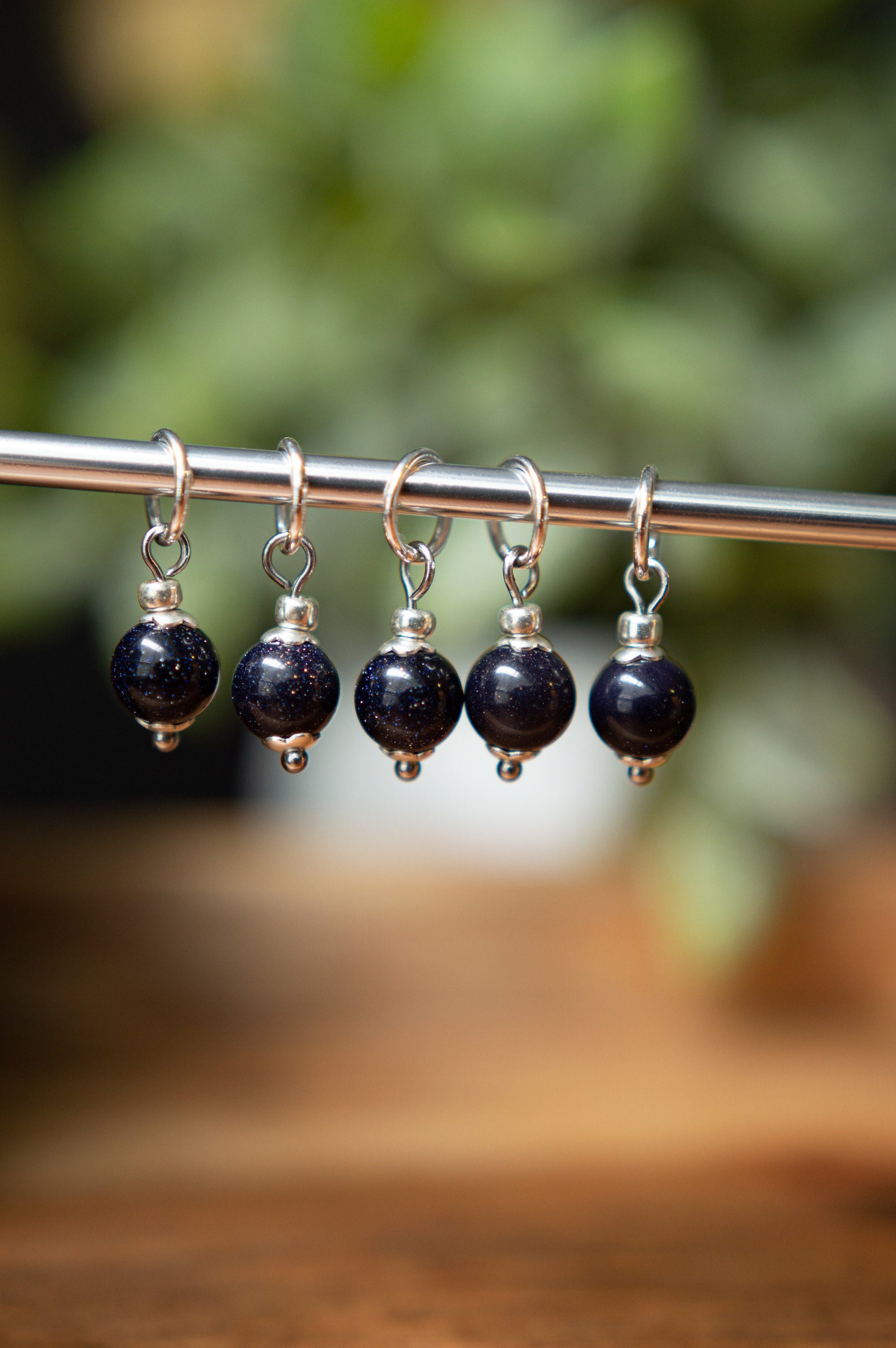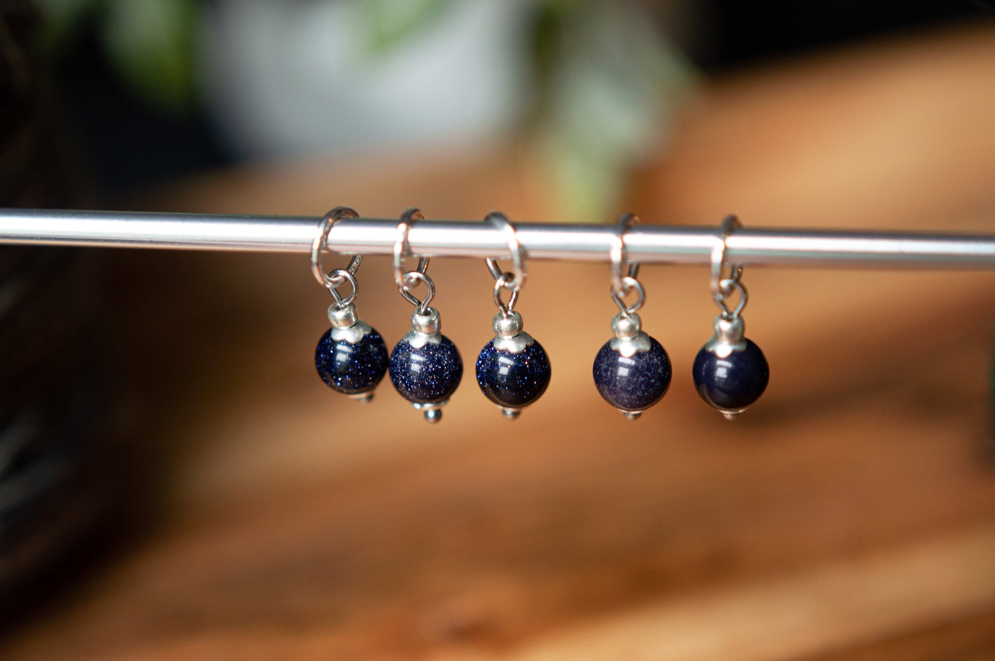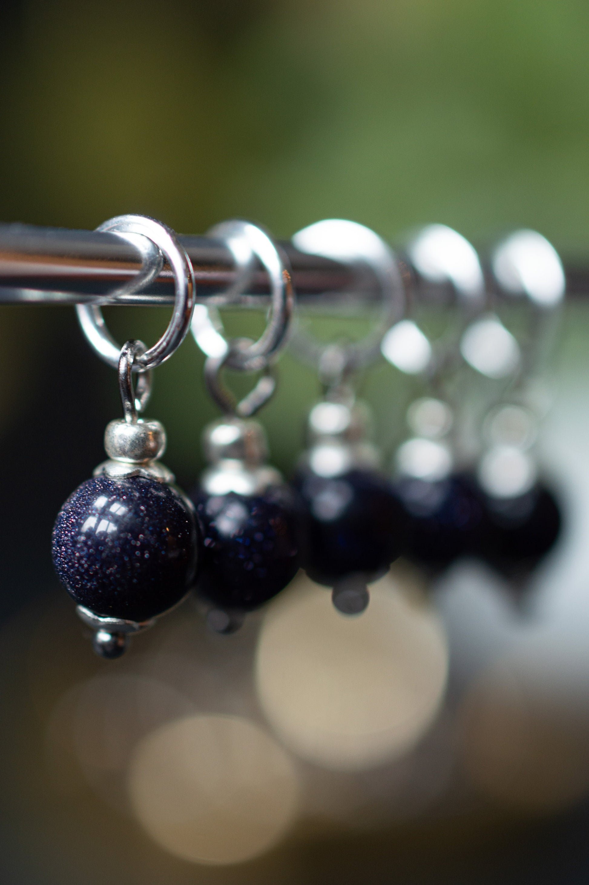 Set of 5 stitch markers made from 7.65mm round Blue Goldstone beads. Detailed with sparkling glitter beads that look like the night sky and set off by silver seed beads, silver bead caps, and silver plated jump rings/lobster clasps. Jump rings are soldered closed, so they won‘t snag your yarn.