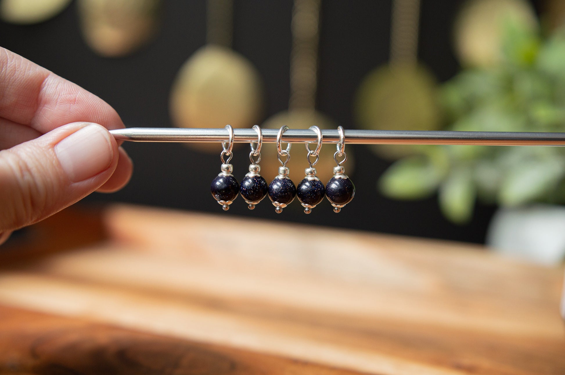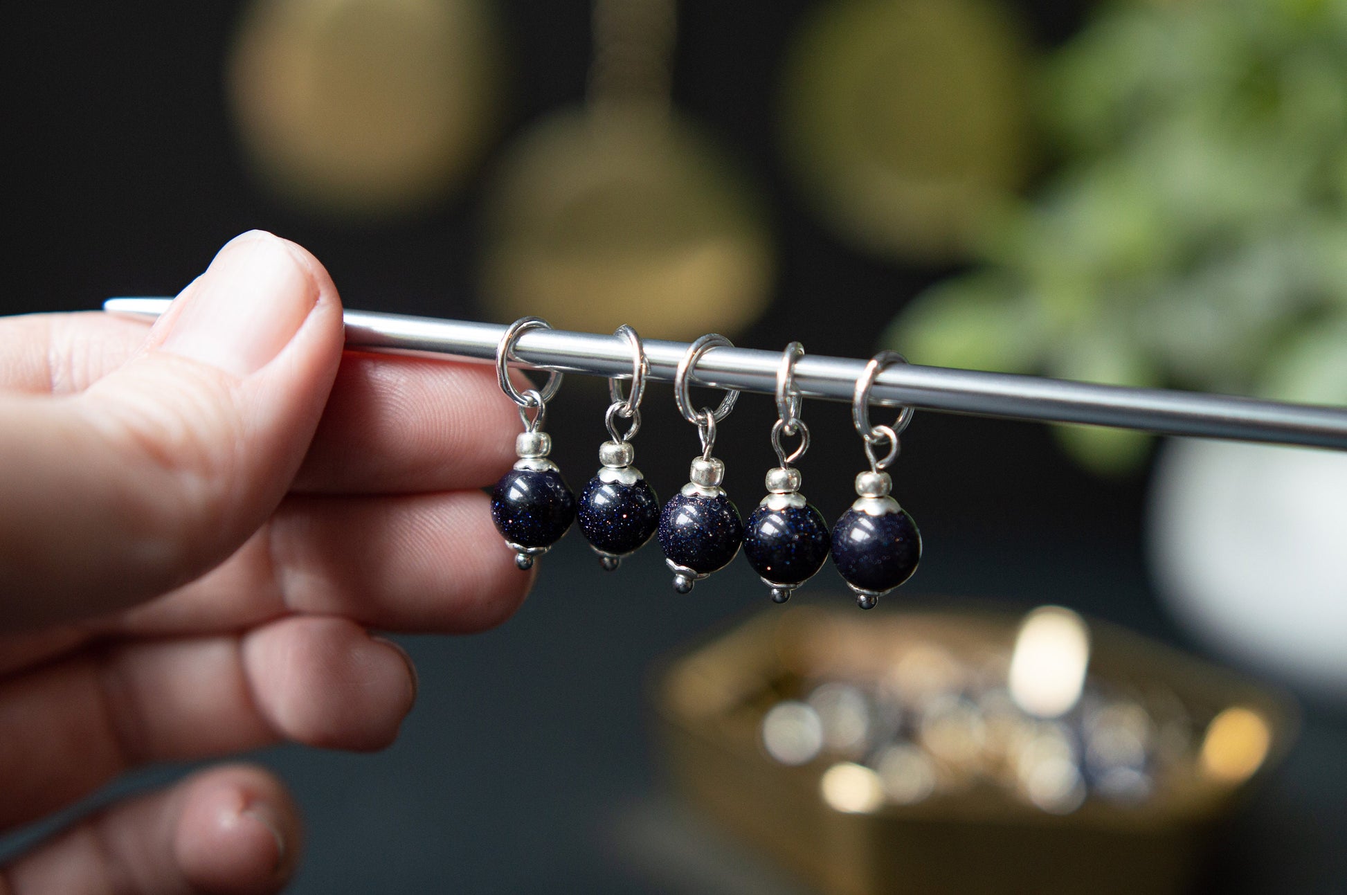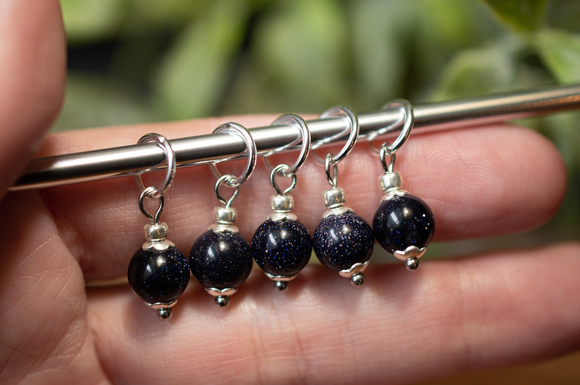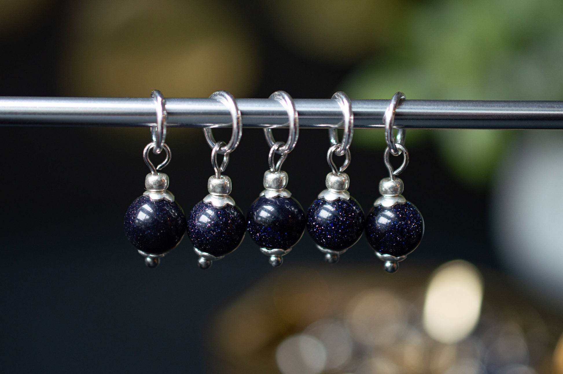 Set of 5 stitch markers made from 7.65mm round Blue Goldstone beads. Detailed with sparkling glitter beads that look like the night sky and set off by silver seed beads, silver bead caps, and silver plated jump rings/lobster clasps. Jump rings are soldered closed, so they won‘t snag your yarn.