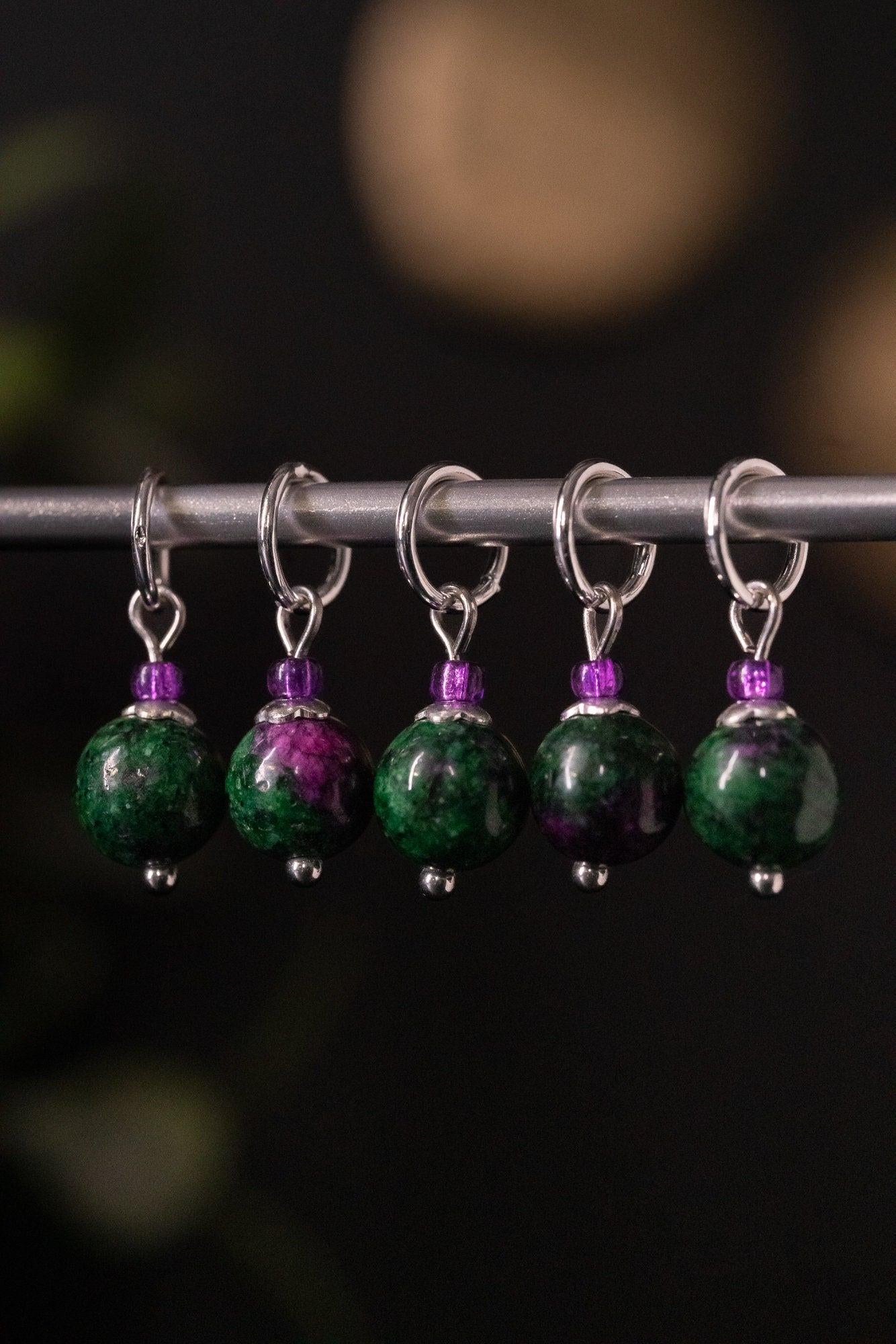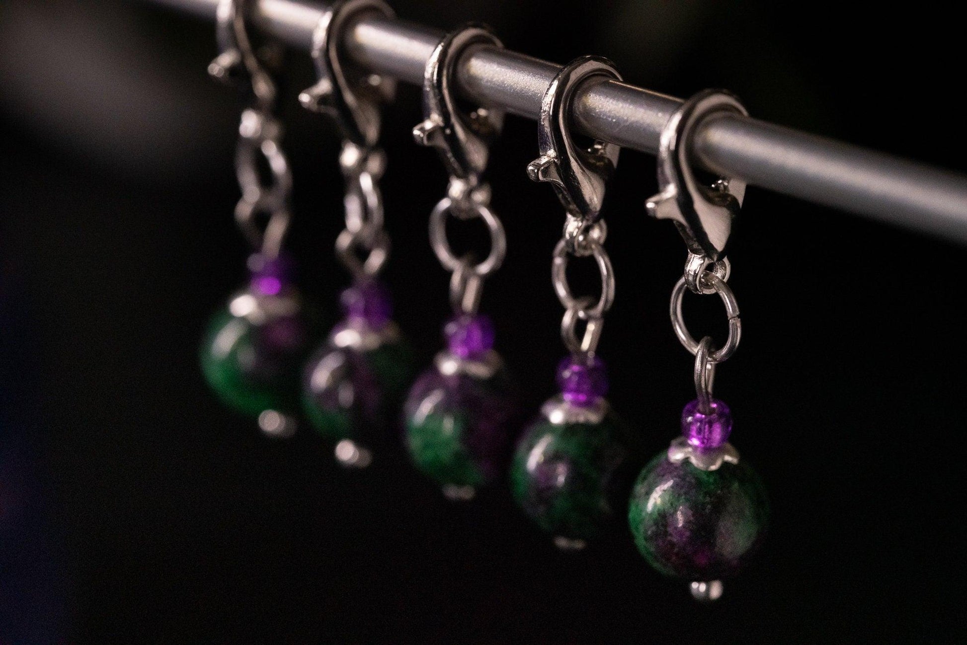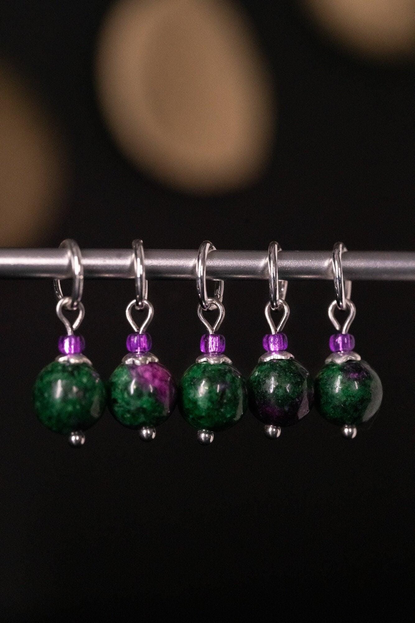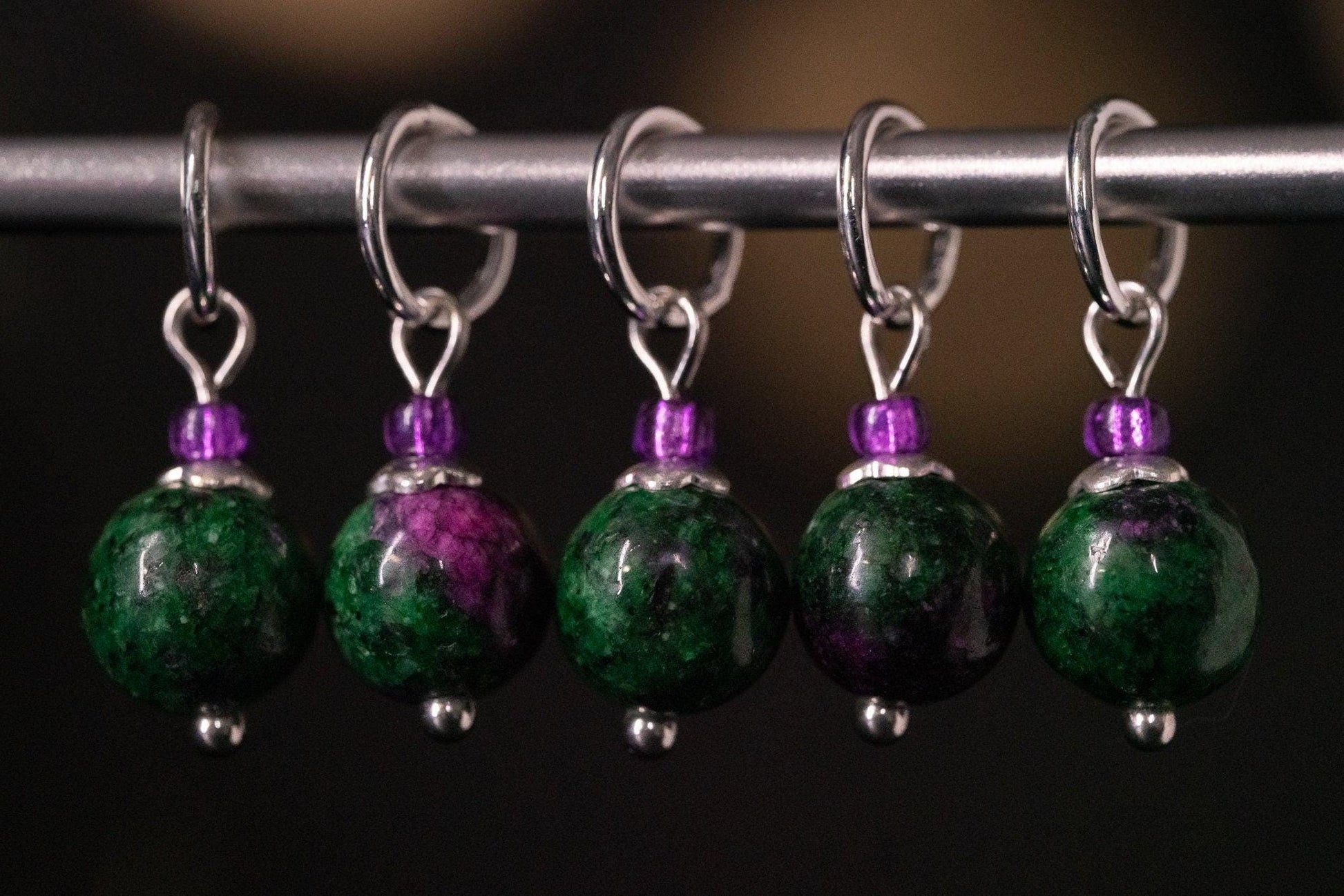 Set of 5 stitch markers made from 8mm Ruby Zoisite stone beads. Detailed and set off by shiny purple seed beads, bead caps, and silver plated jump rings/lobster clasps. Jump rings are soldered closed, so they won‘t snag your yarn. Variation is the charm with natural stone beads, each set is unique and beautiful.