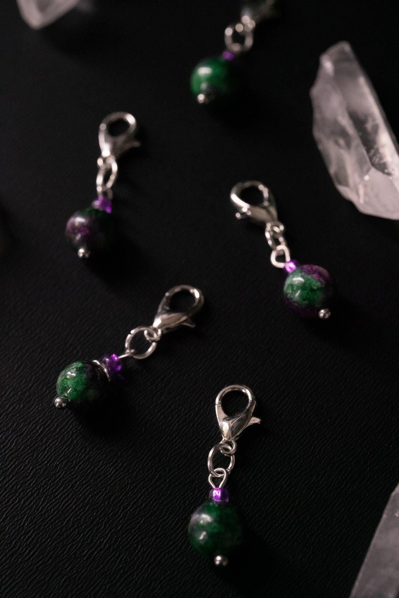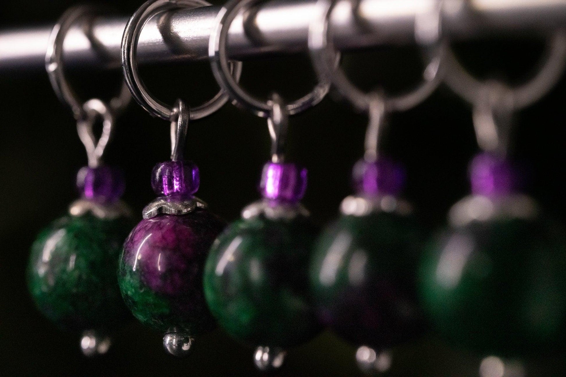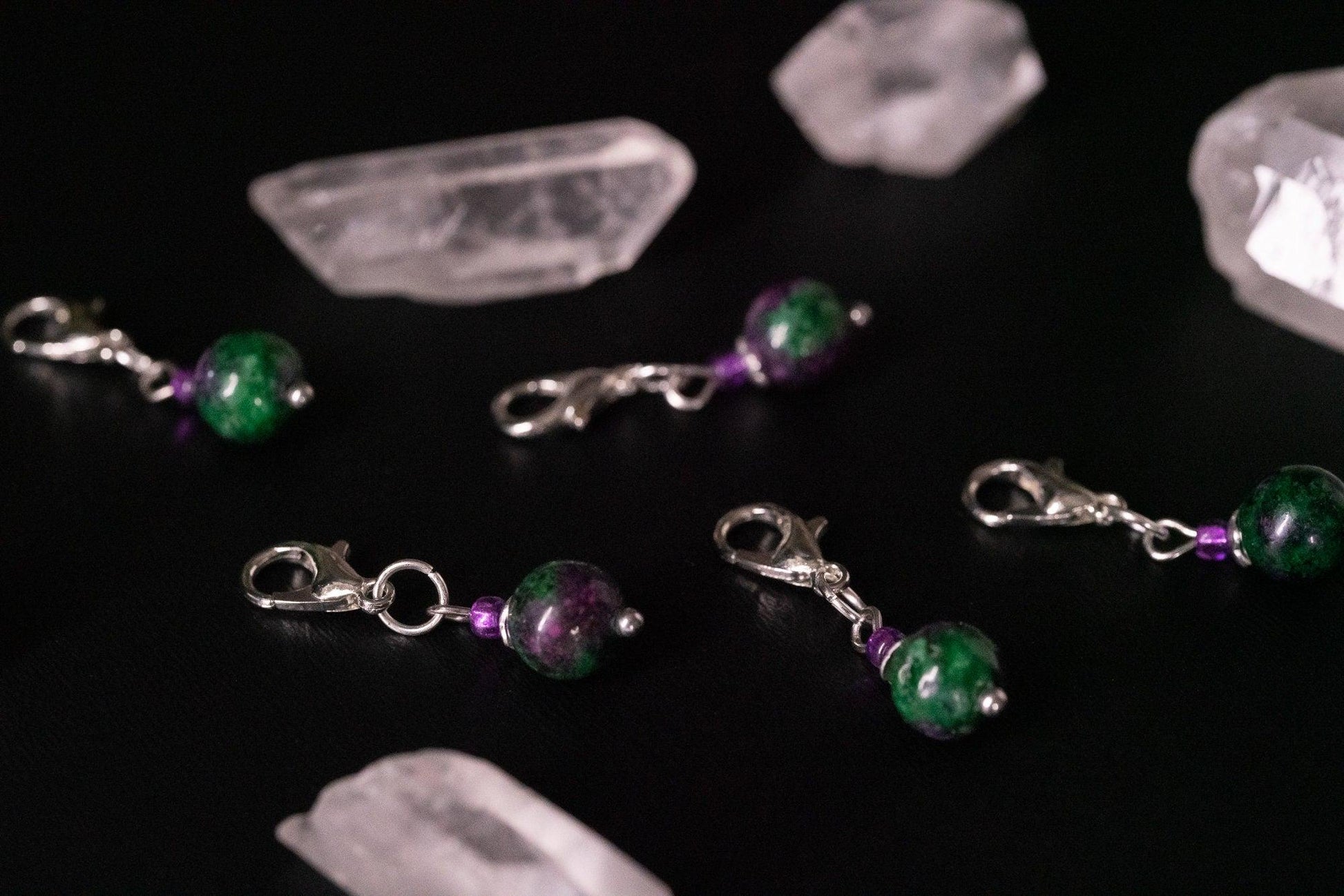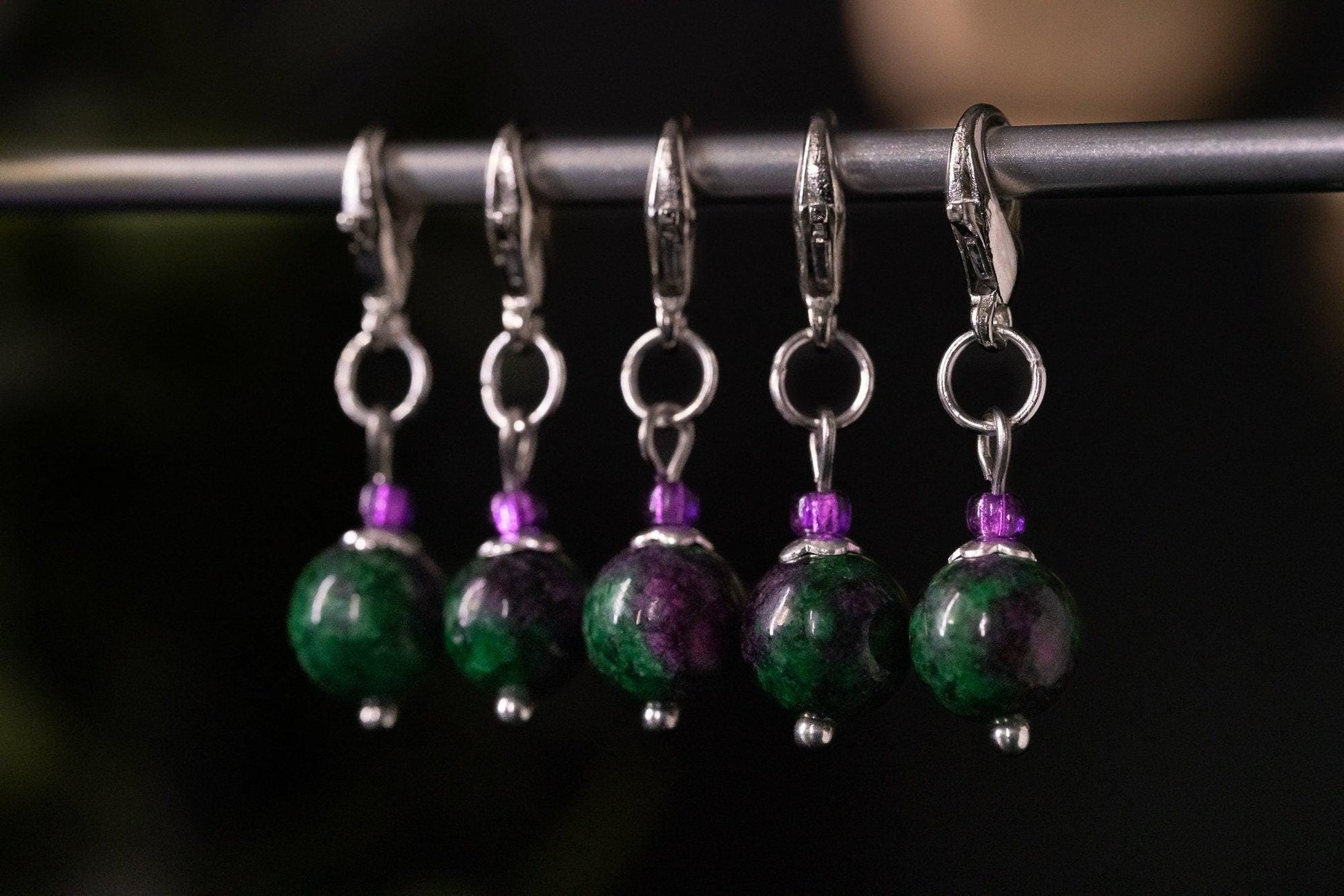 Set of 5 stitch markers made from 8mm Ruby Zoisite stone beads. Detailed and set off by shiny purple seed beads, bead caps, and silver plated jump rings/lobster clasps. Jump rings are soldered closed, so they won‘t snag your yarn. Variation is the charm with natural stone beads, each set is unique and beautiful.