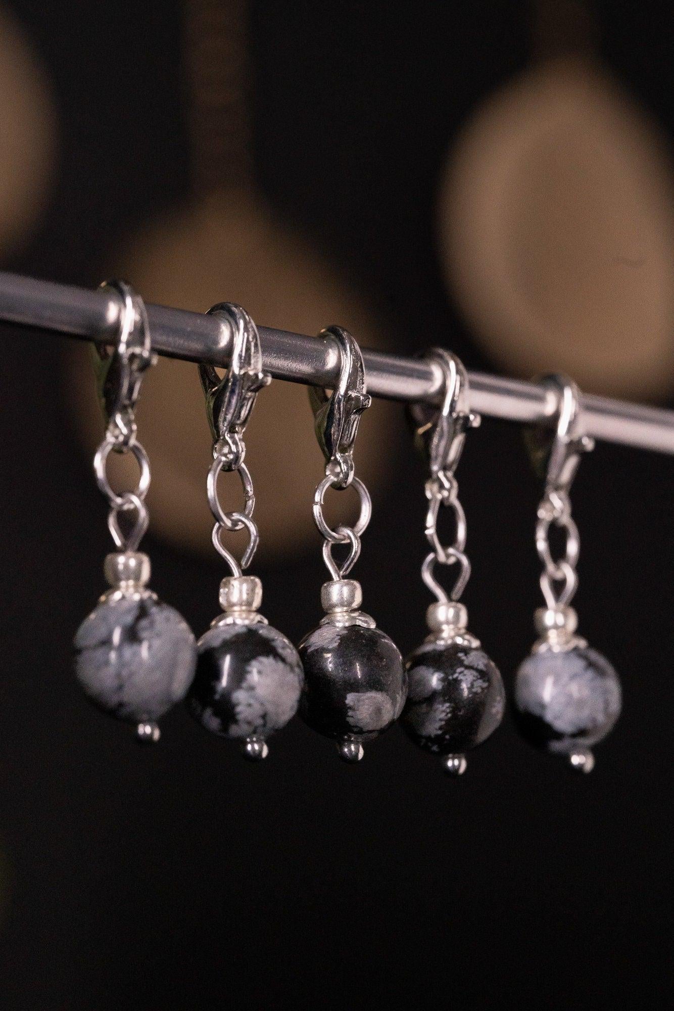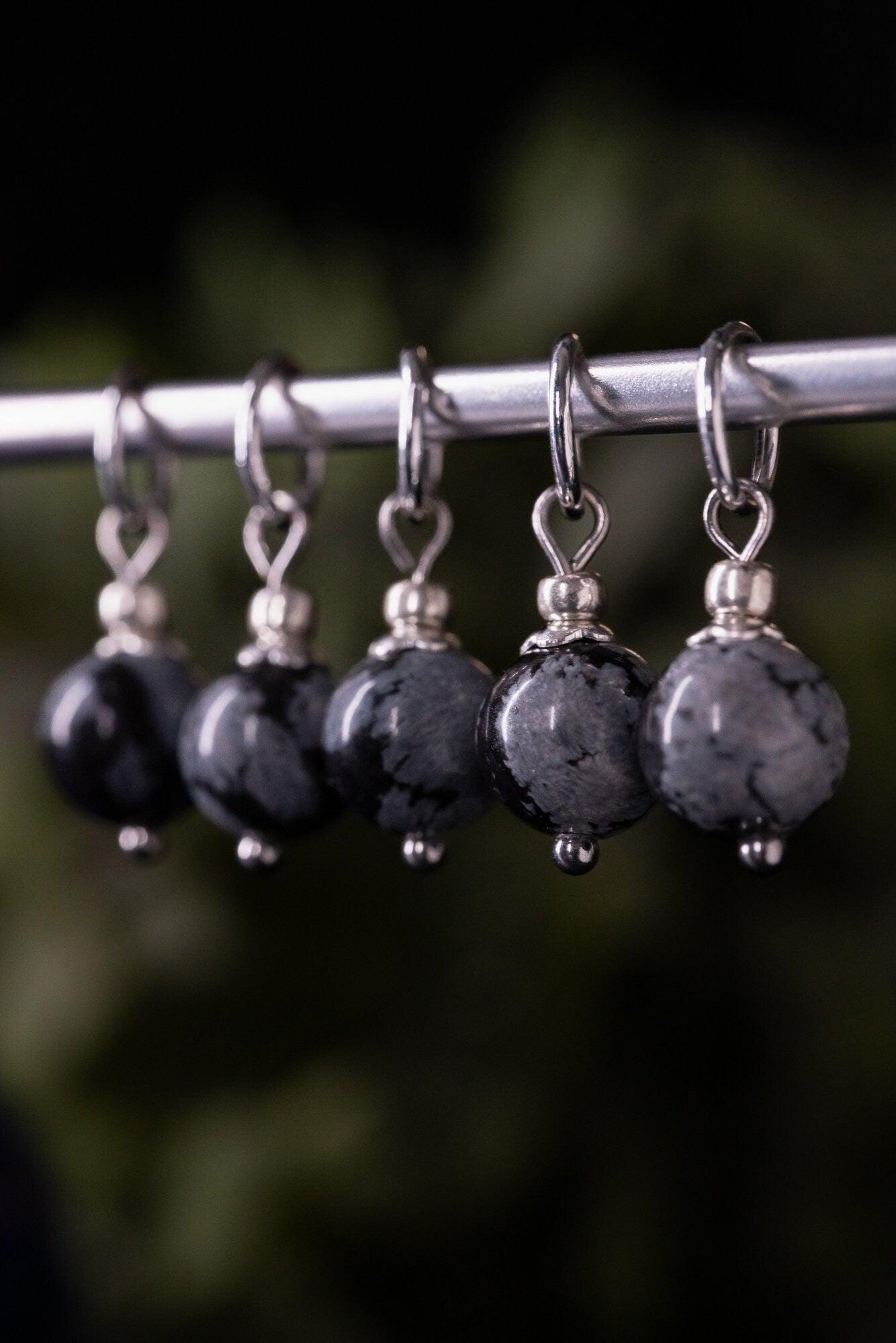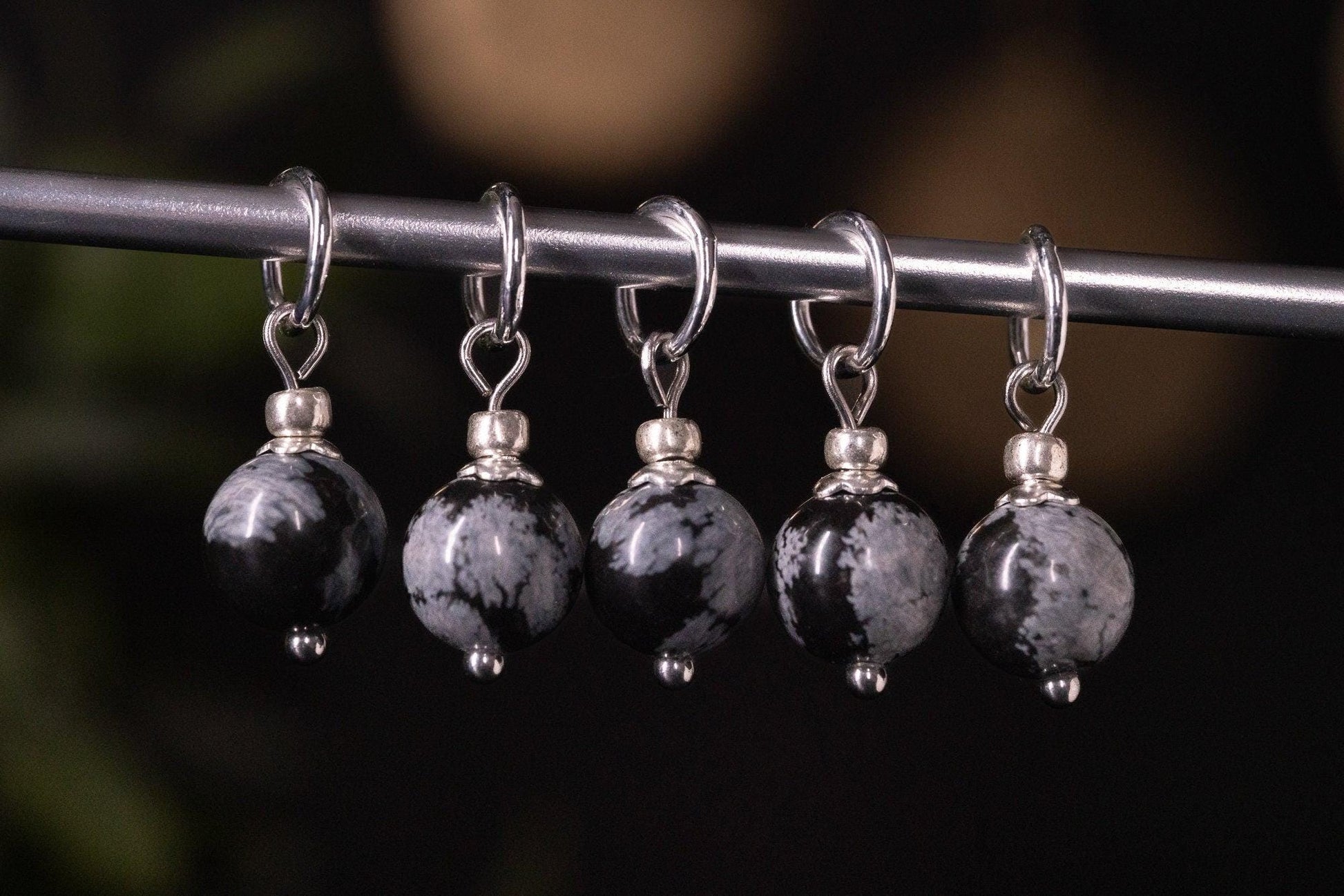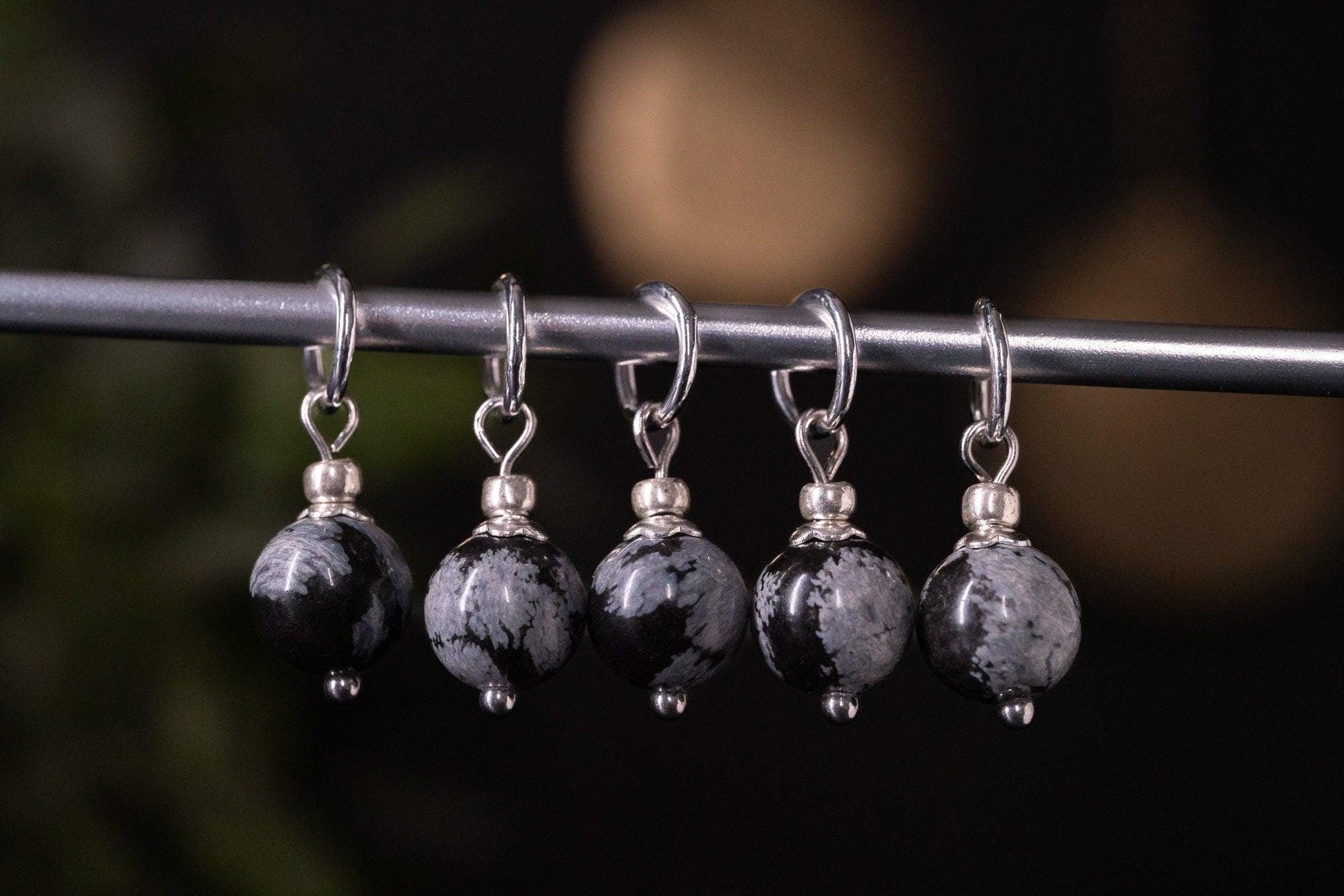 Set of 5 stitch markers made from 8mm natural stone Snowflake Obsidian beads. Detailed and set off by shiny silver seed beads, bead caps, and silver plated jump rings/lobster clasps. Jump rings are soldered closed, so they won‘t snag your yarn. Variation is the charm with natural stone beads, each set is unique and beautiful.