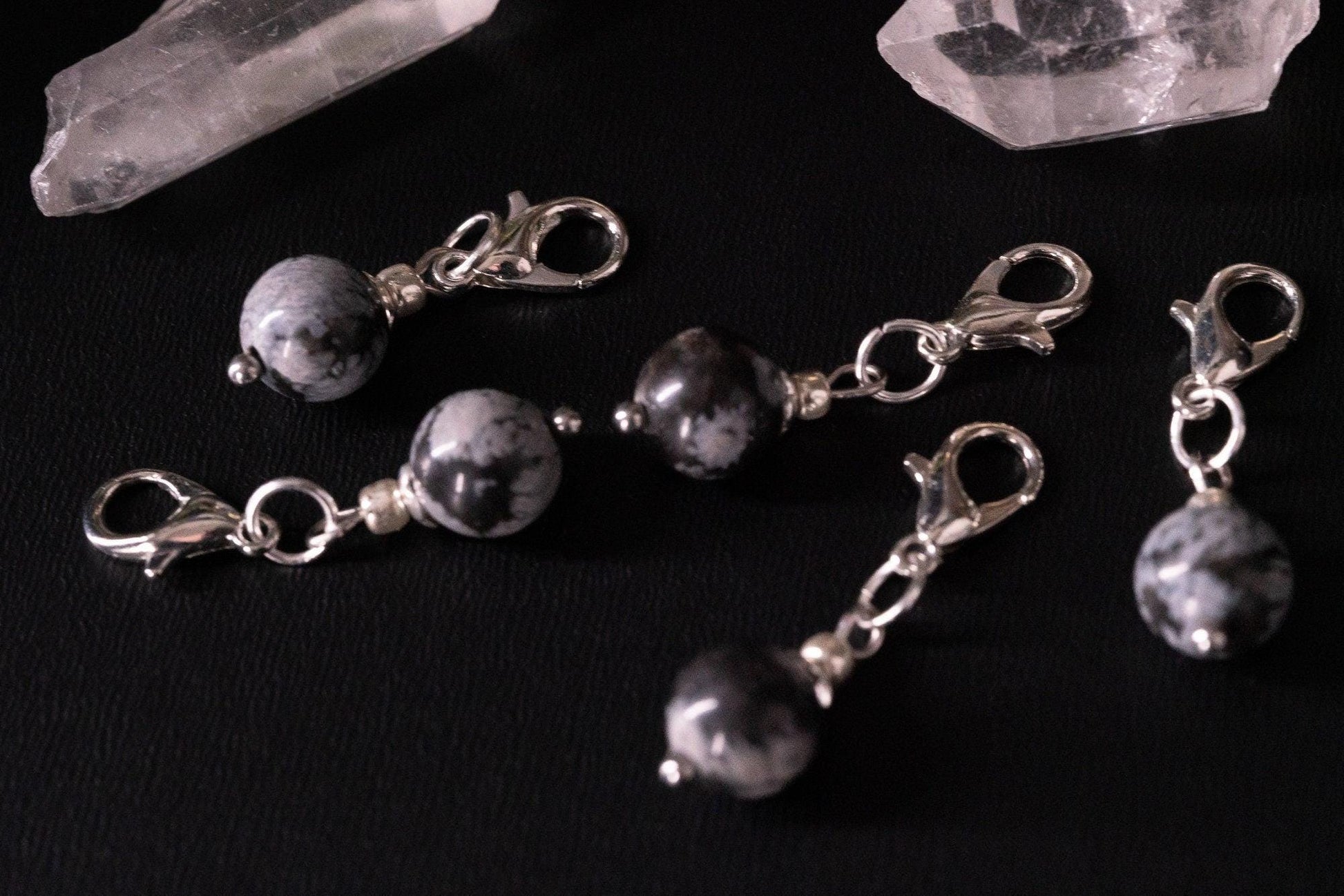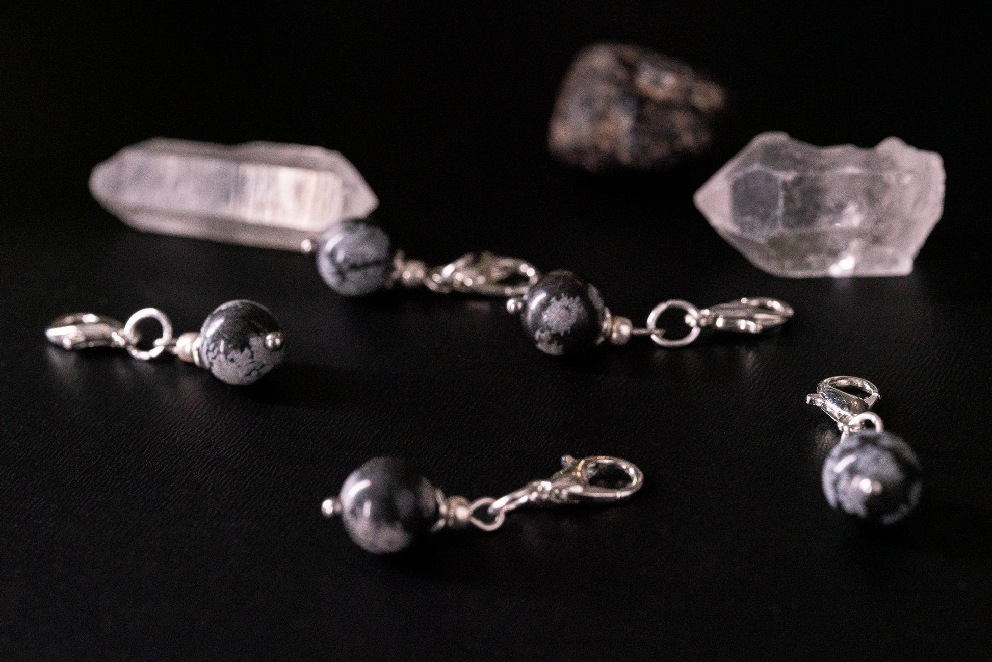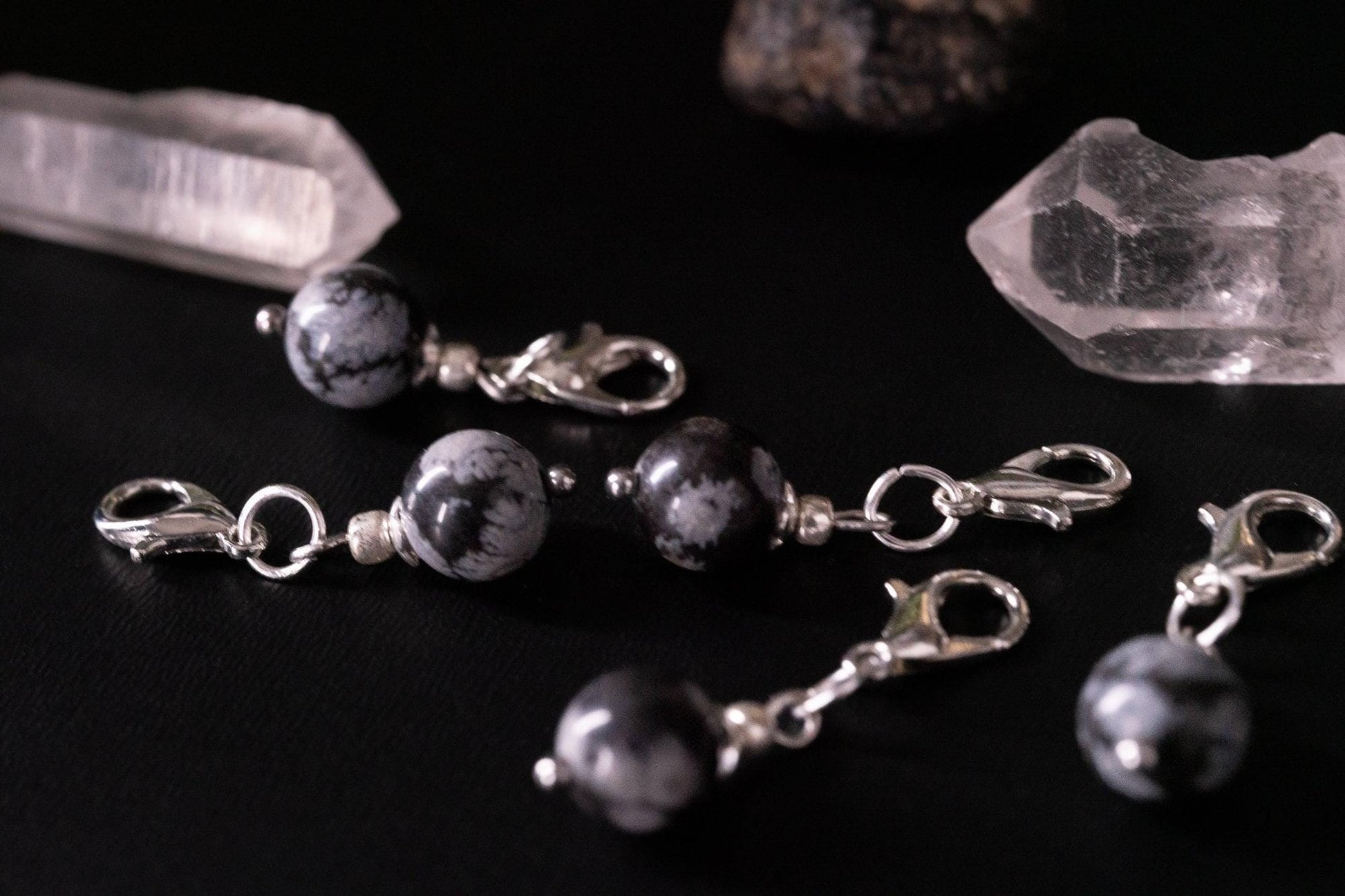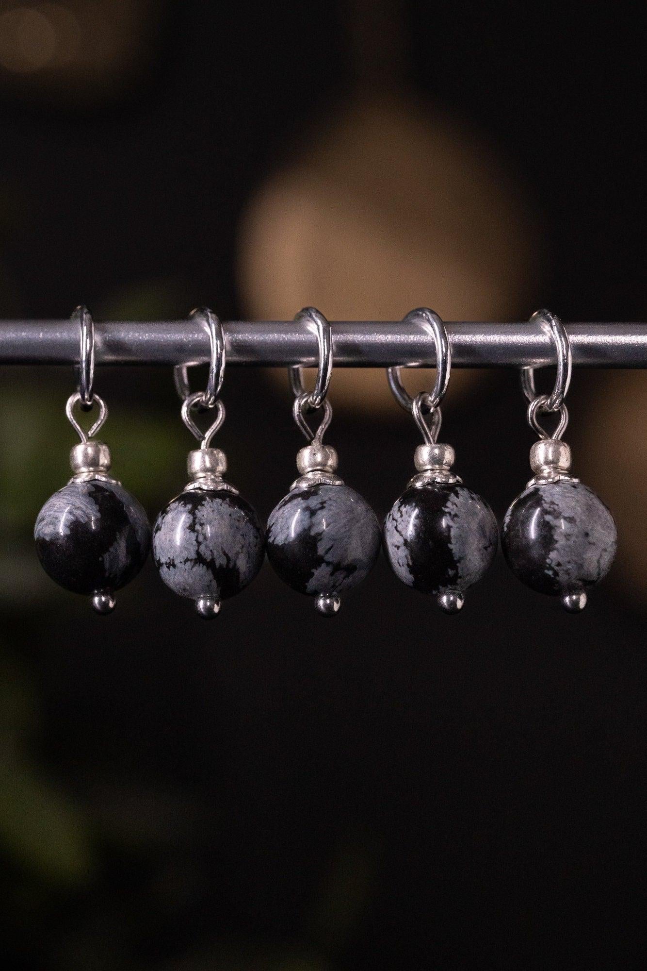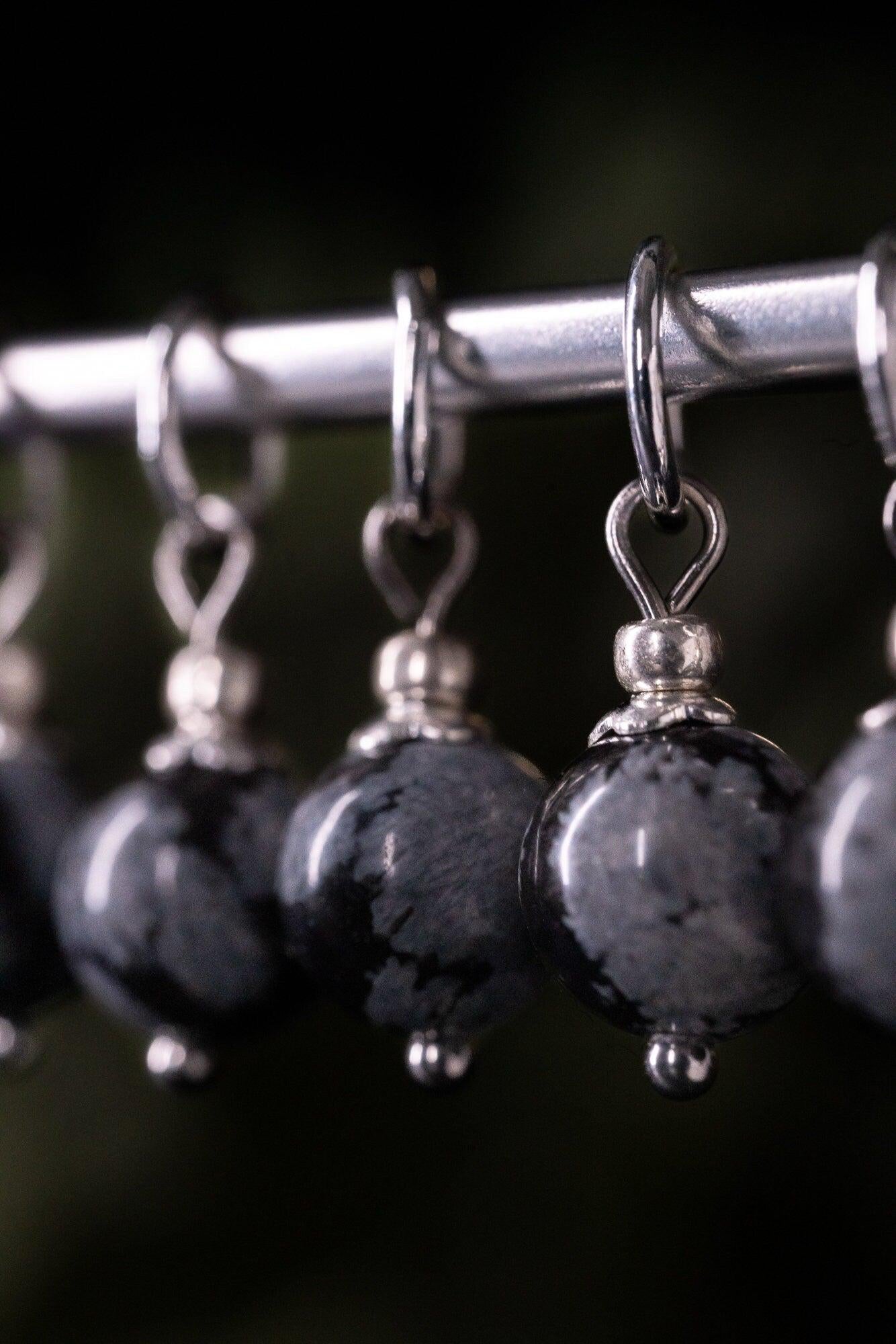Set of 5 stitch markers made from 8mm natural stone Snowflake Obsidian beads. Detailed and set off by shiny silver seed beads, bead caps, and silver plated jump rings/lobster clasps. Jump rings are soldered closed, so they won‘t snag your yarn. Variation is the charm with natural stone beads, each set is unique and beautiful.