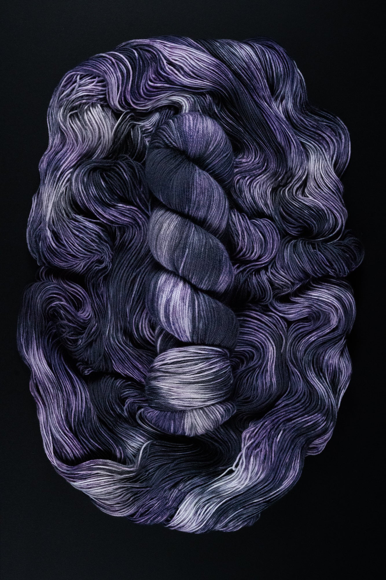 The Raven is the variegated purple shown in these photos. It is a repeatable colorway. If you do not see the quantities listed that you would like for your project, send me a message and I will happily dye to order.