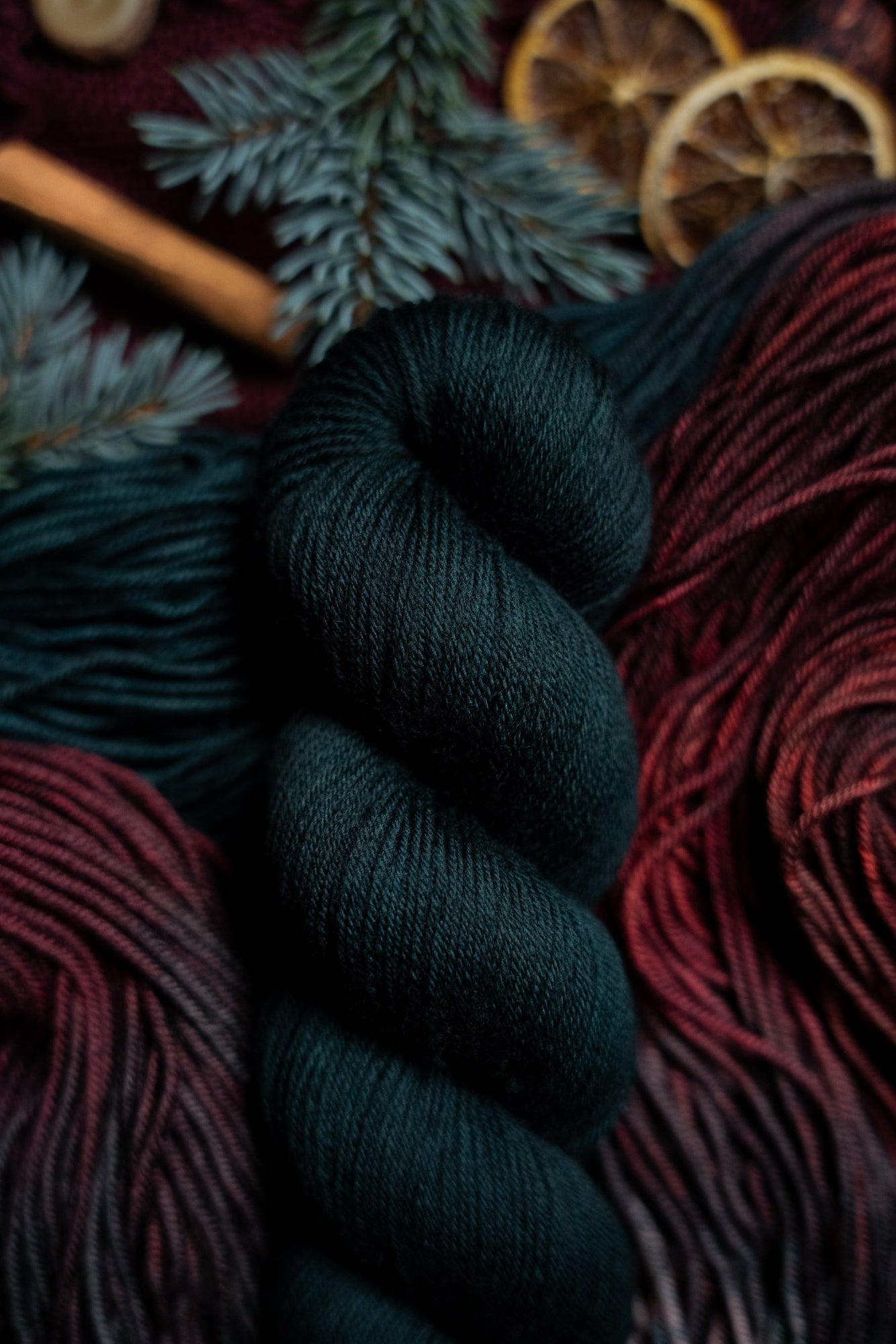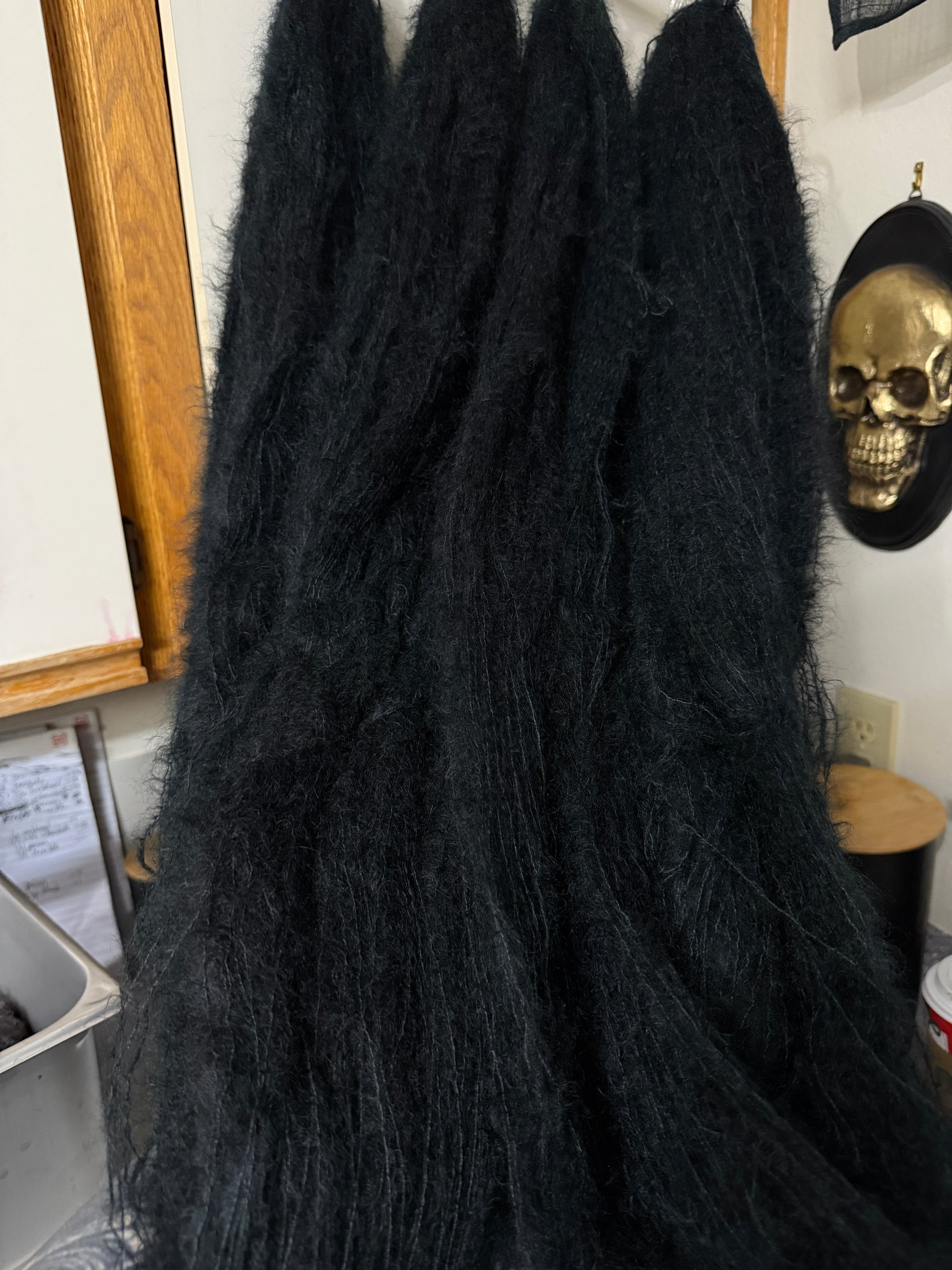 Born as an oopsie while dyeing Einir (second photo), this listing is for 4 skeins of Perdita Mohair Lace (437 yds/50g). It is hard to tell from the photo, the skeins appear almost entirely black except in natural light where you can see that they are the darkest possible blue-green.